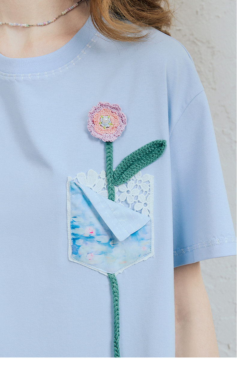 两三事 遁入花境 2025春季新款休闲拼色插肩袖印花刺绣t恤女宽松S25CT444