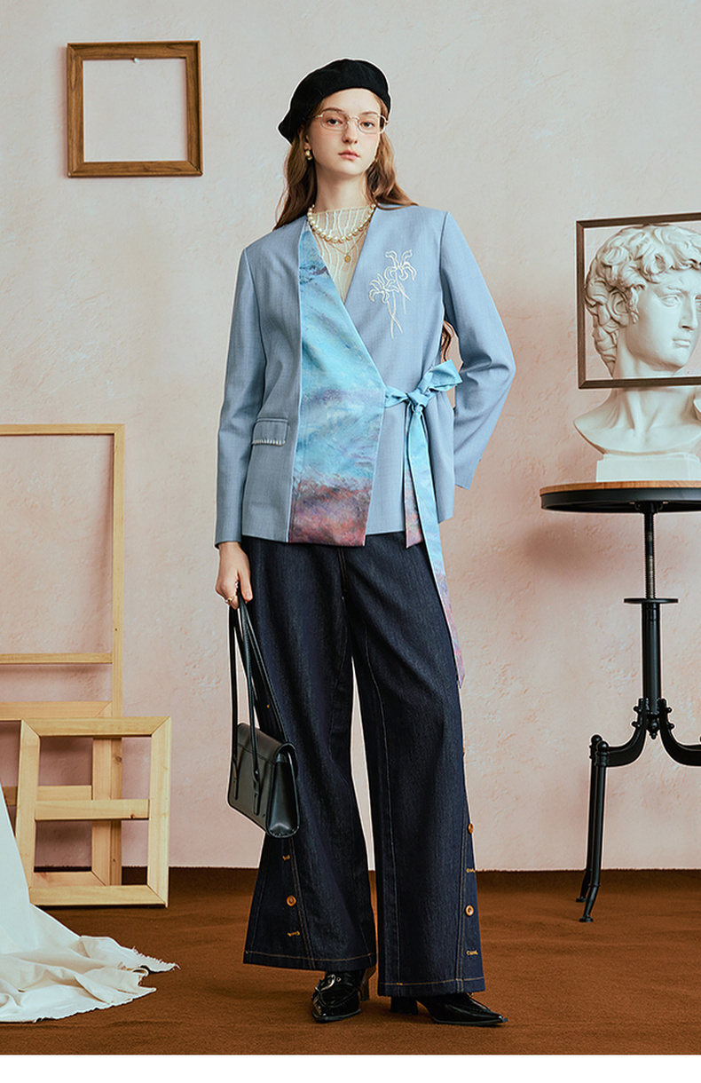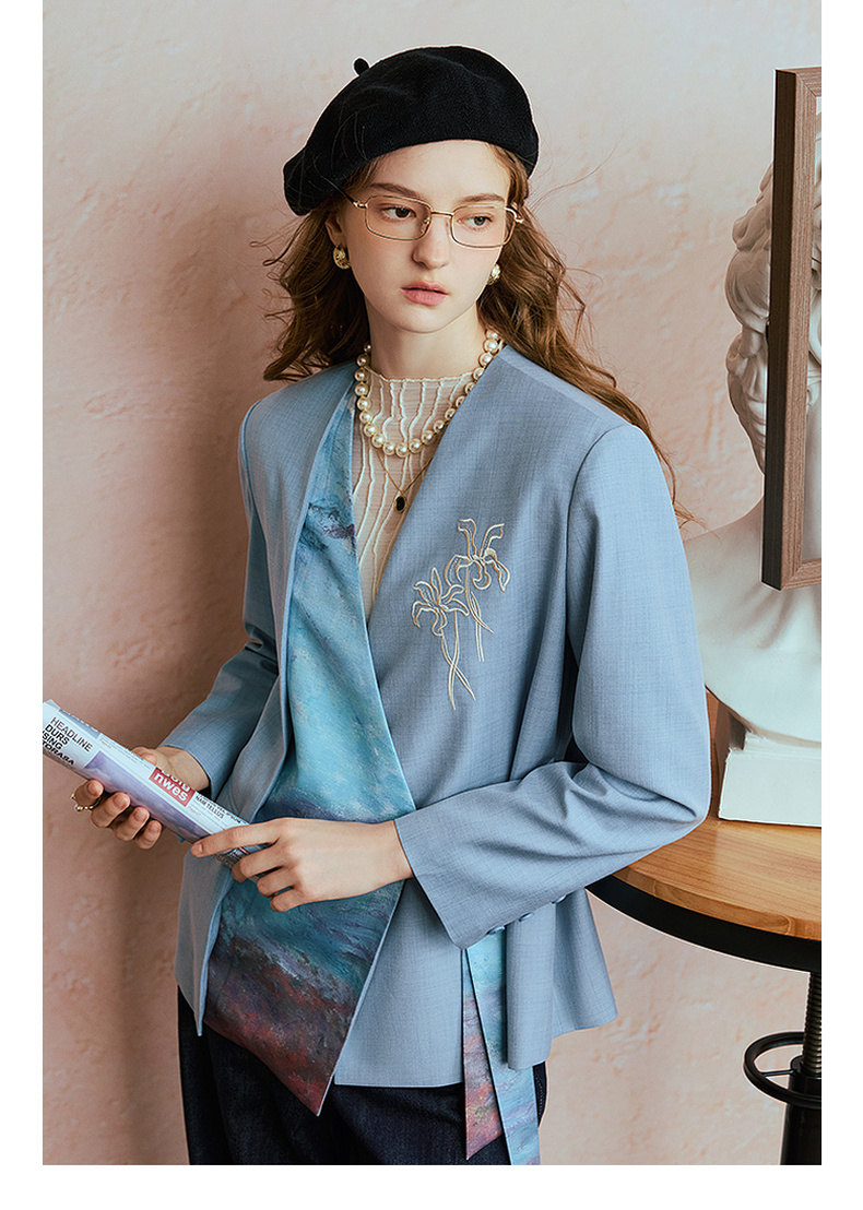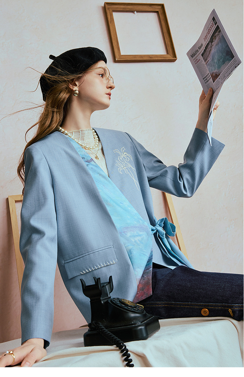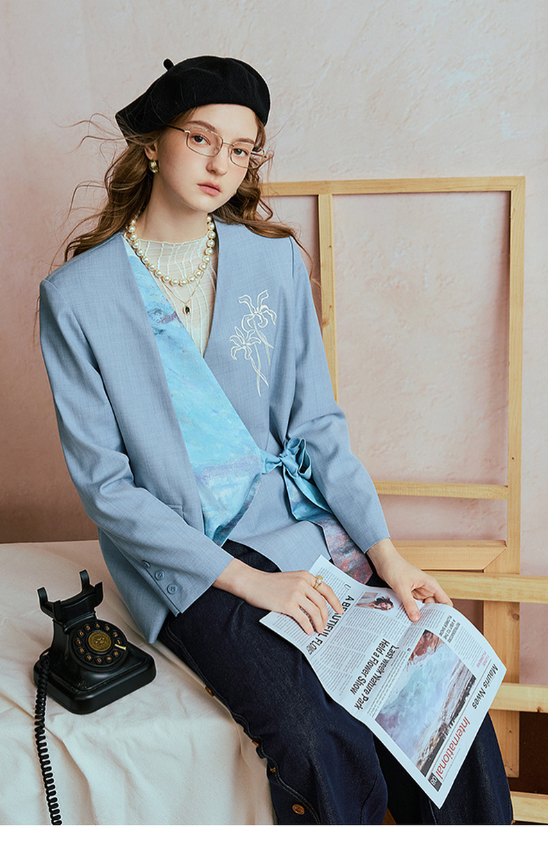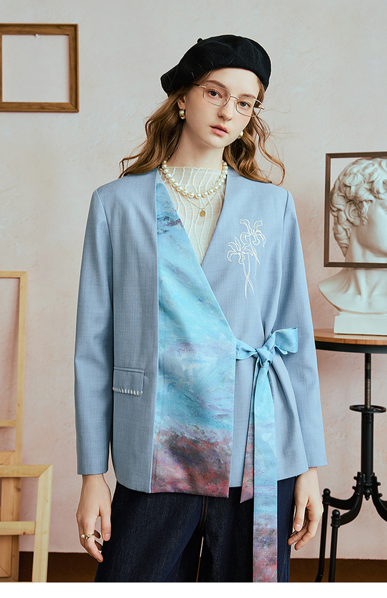 两三事 鸢徊西月 2025秋季新款复古印花布拼接绑带绣花西装外套女