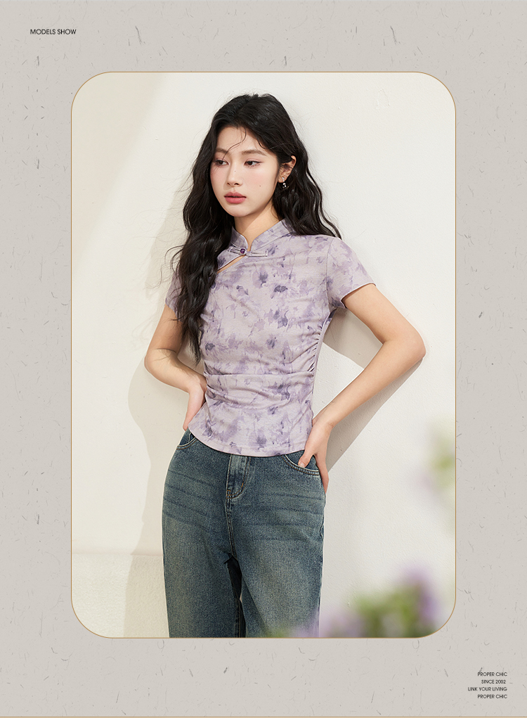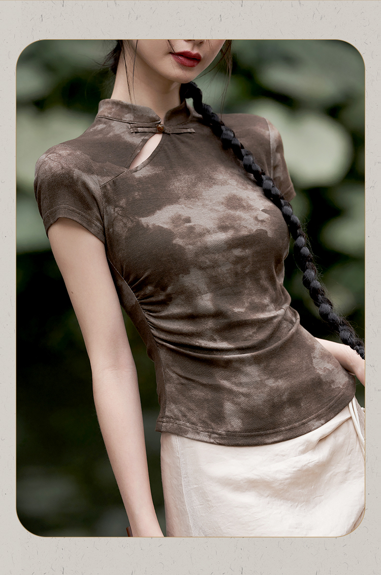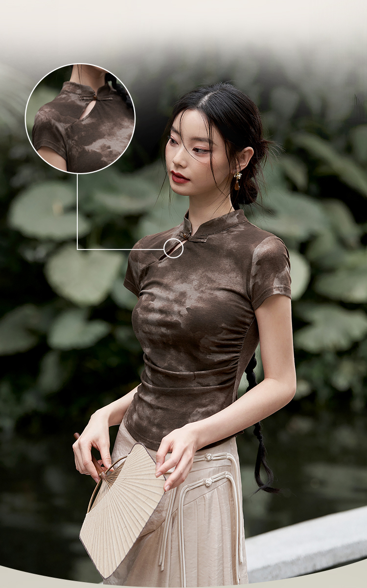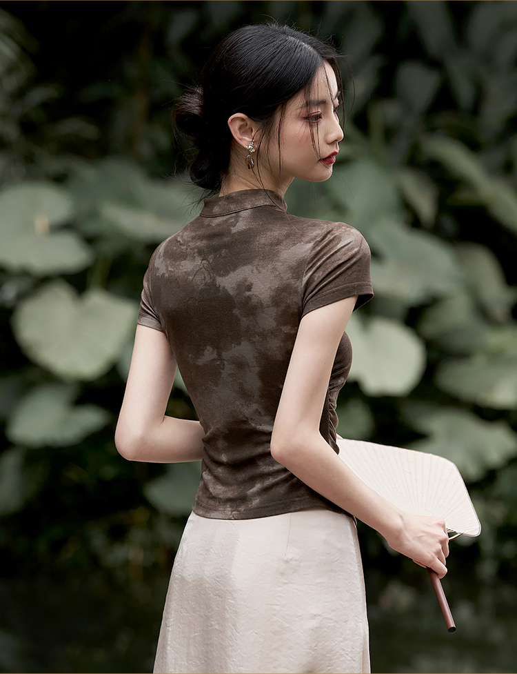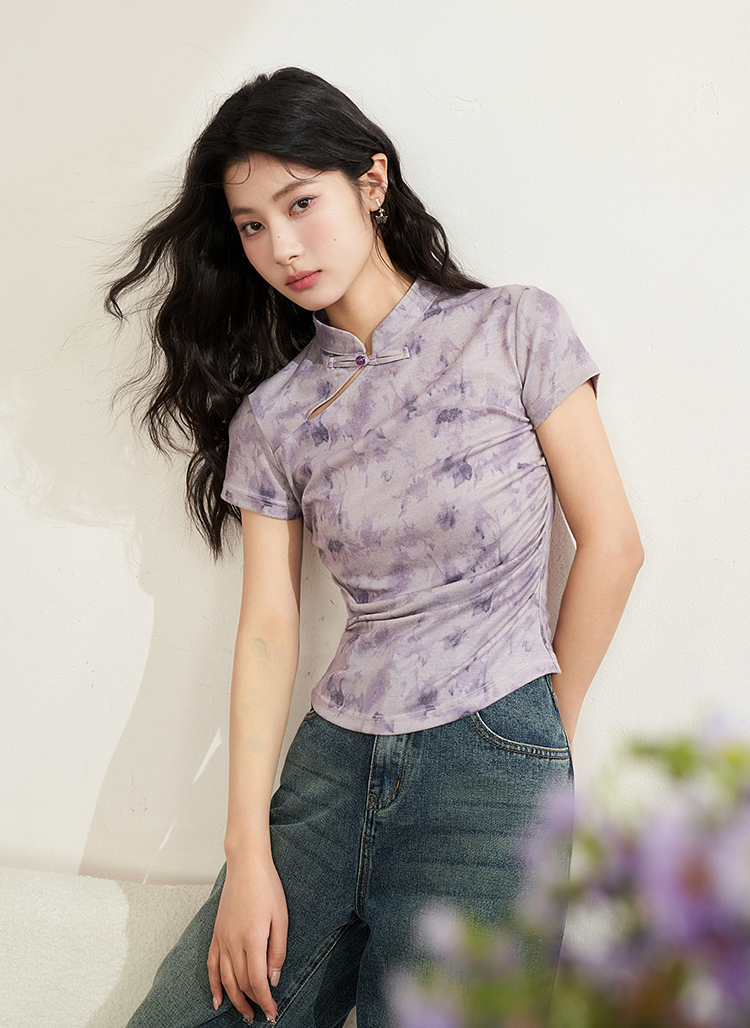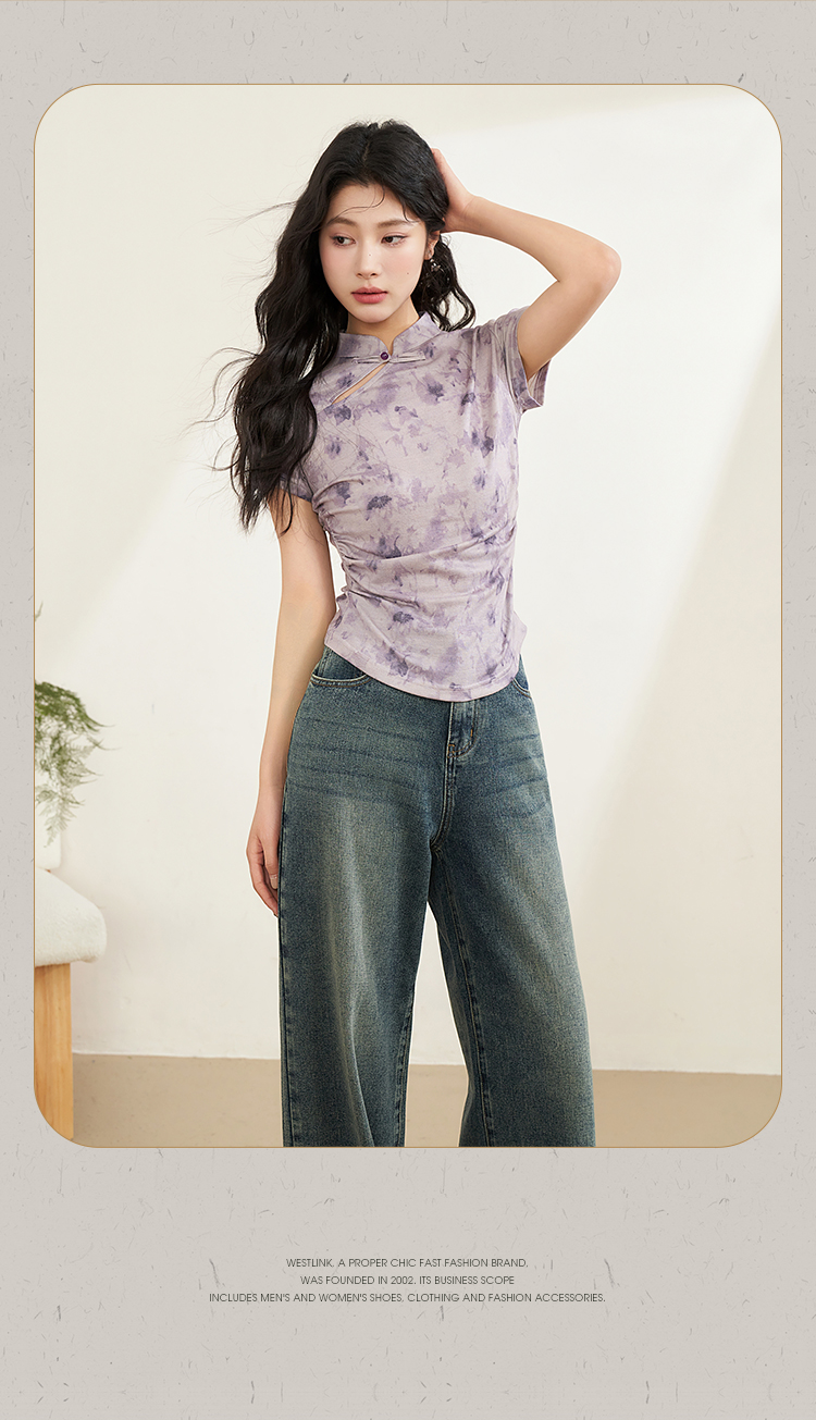 西遇紫色新中式古风设计短袖女新款纯棉透气舒适咖色T恤10740174/V0050549