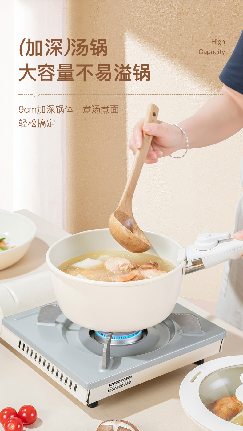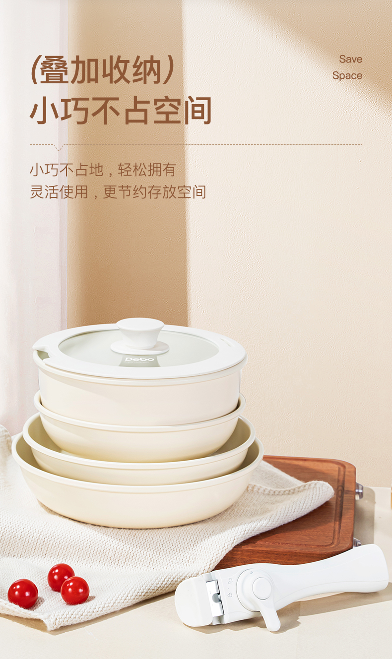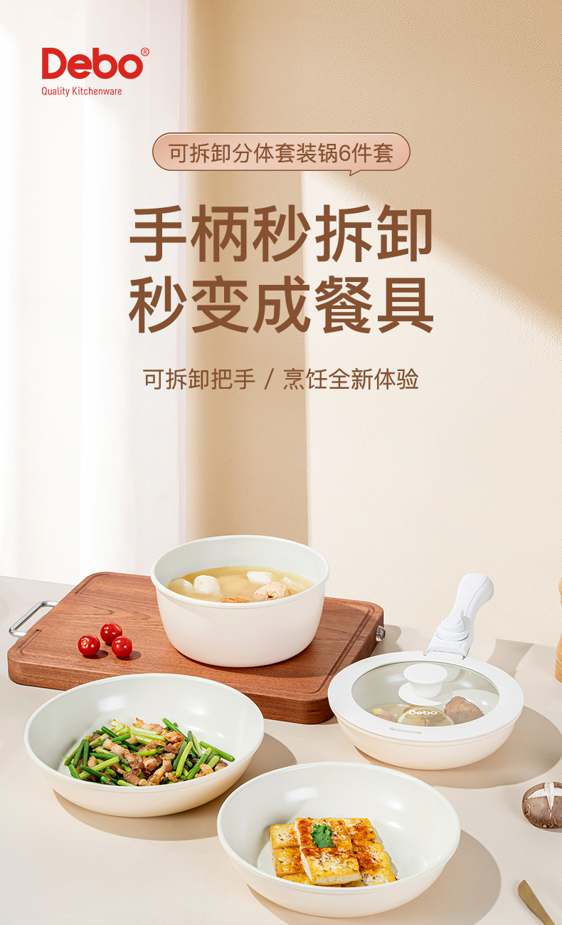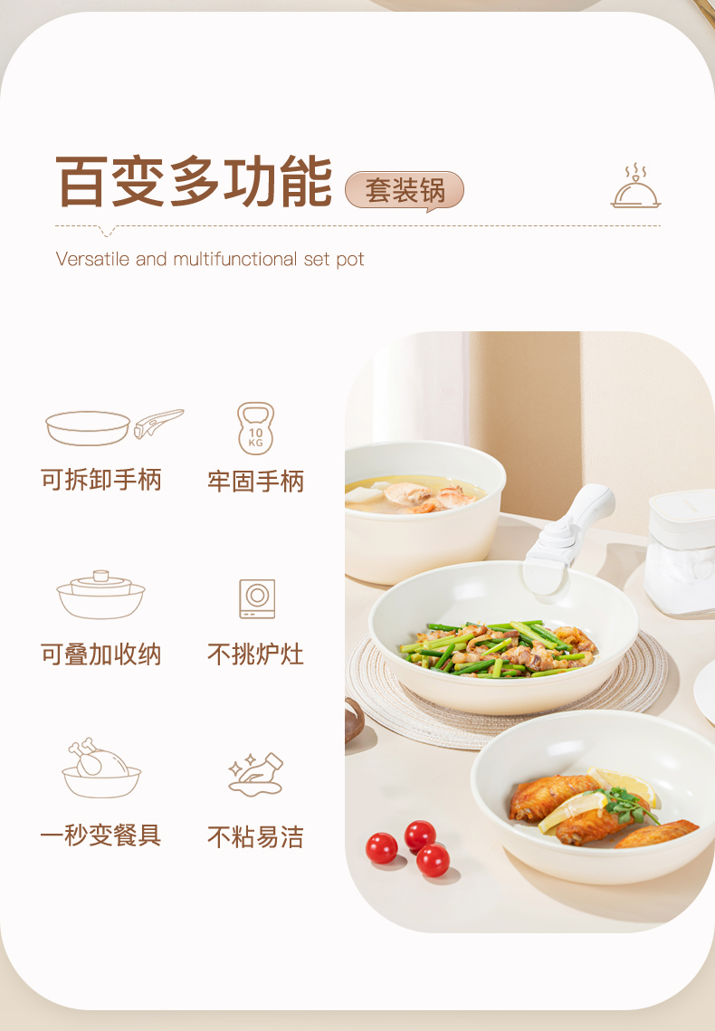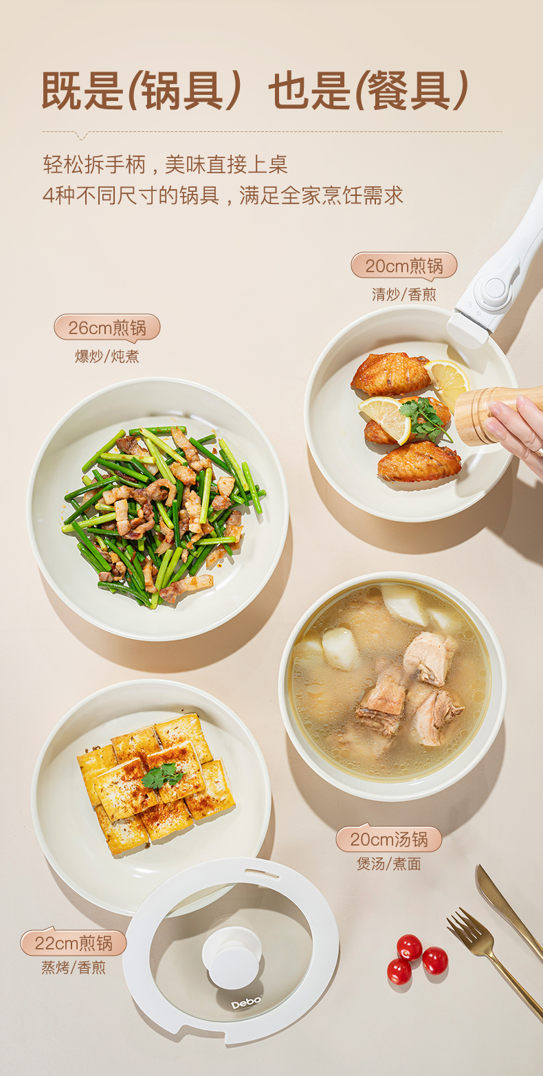 配置:煎盘*3、汤锅*1、玻璃盖*1、可拆卸手柄*1