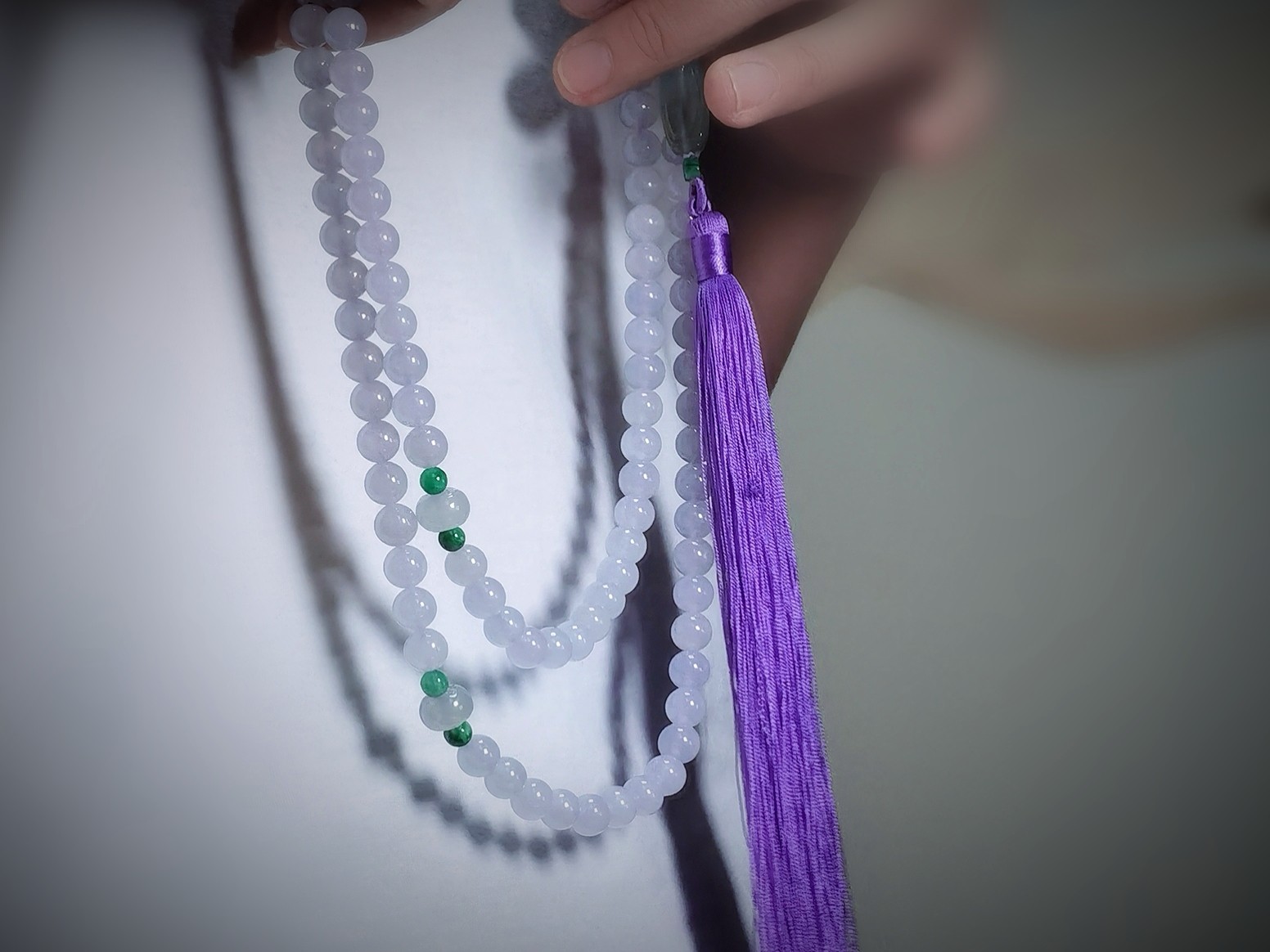 同一块材料的翡翠珠串,颜色柔和,配饰选料用心,整体感好,握在手中,圆满静心。是品味与时尚的象征