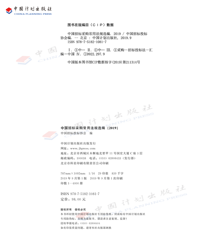 书名:正版现货 中国招标采购常用法规选编(2019) 招标投标法 政府采购法 合同法 招标投标用书 中国计划出版社 978751821081