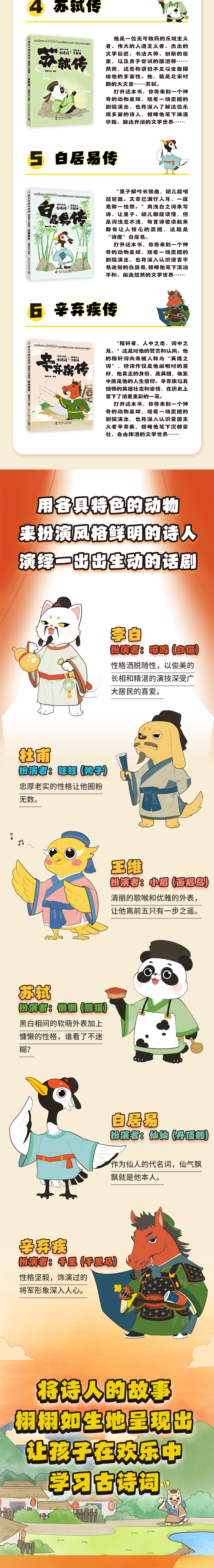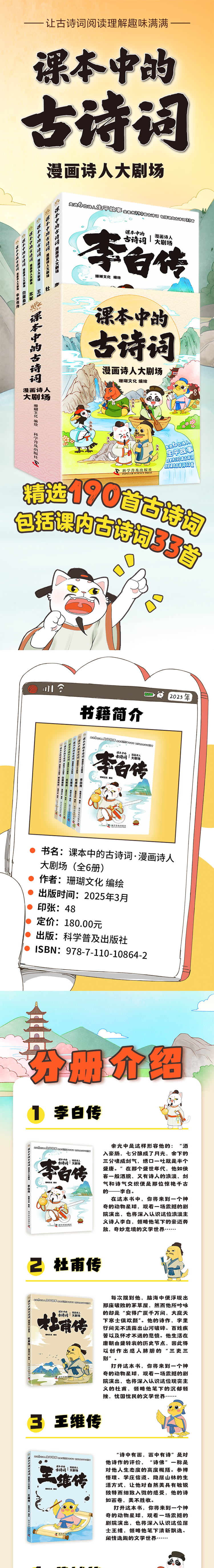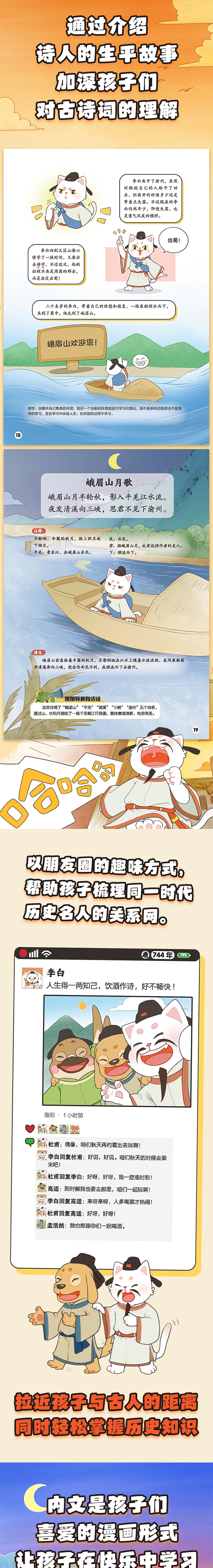 《课本中的古诗词.漫画诗人大剧场》全6册 7-10岁 精选190首古诗词 包括课内古诗词33首 以朋友圈的趣味方式 帮助孩子梳理同一时代历史名人的关系网 同时轻松掌握历史知识