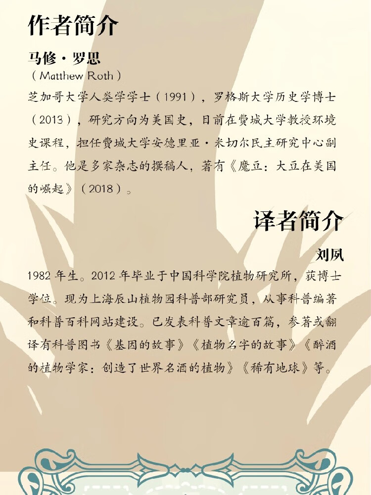 马修•罗思(Matthew Roth),芝加哥大学人类学学士(1991),罗格斯大学历史学博士(2013),研究方向为美国史,目前在费城大学教授环境史课程,担任费城大学安德里亚•米切尔民主研究中心副主任。他是多家杂志的撰稿人,著有《魔豆:大豆在美国的崛起》(2018)。