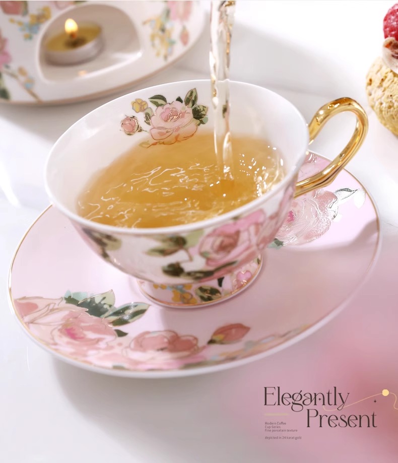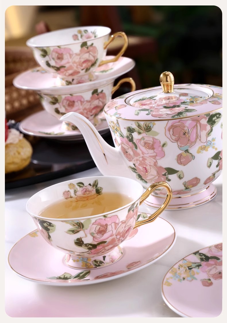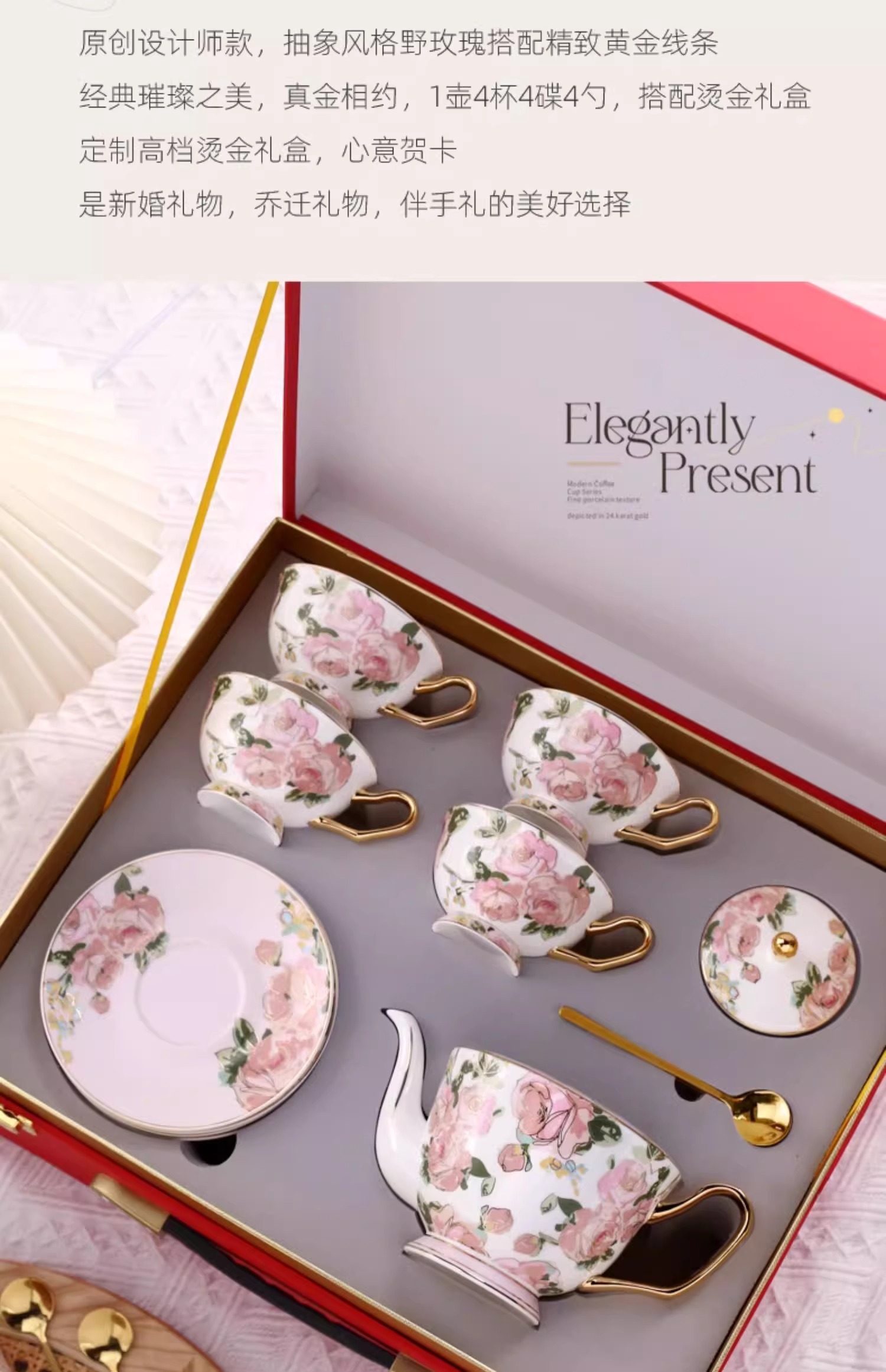 诺轩花卉田园风下午茶玫瑰花陶瓷茶具套装整套骨瓷咖啡杯碟骨瓷壶4杯碟野玫瑰礼盒套装