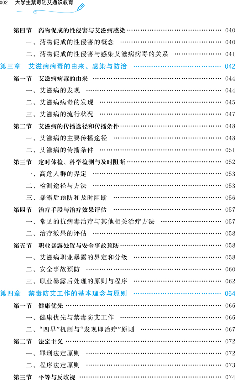 本书以艾滋病防治为脉络,融合毒品预防、心理健康、道德与法治教育,共分为七章,内容丰富,跨法学、医学、社会学、心理学、教育学等多学科,以“识毒、防毒、拒毒”和“知艾防艾、懂艾帮艾”的理念,培养大学生健康的 生活态度和习惯。
