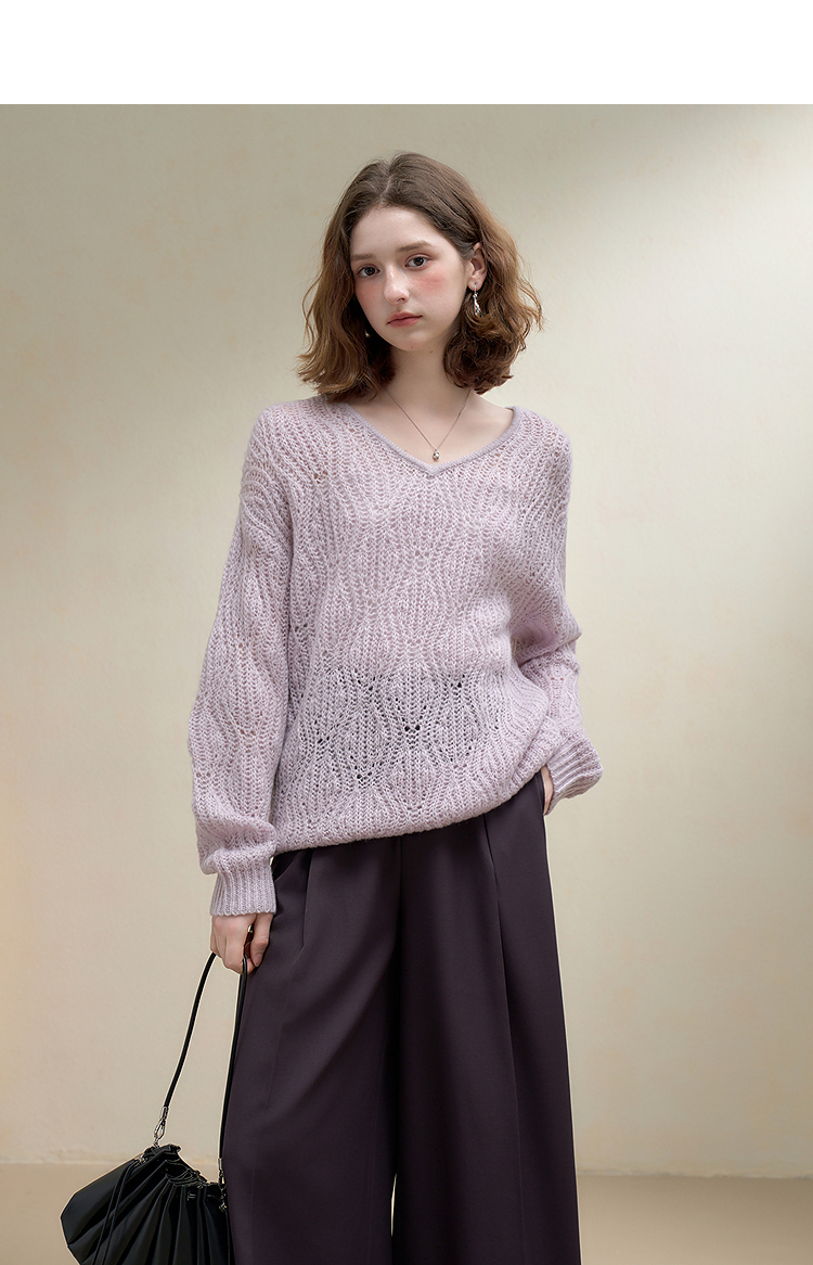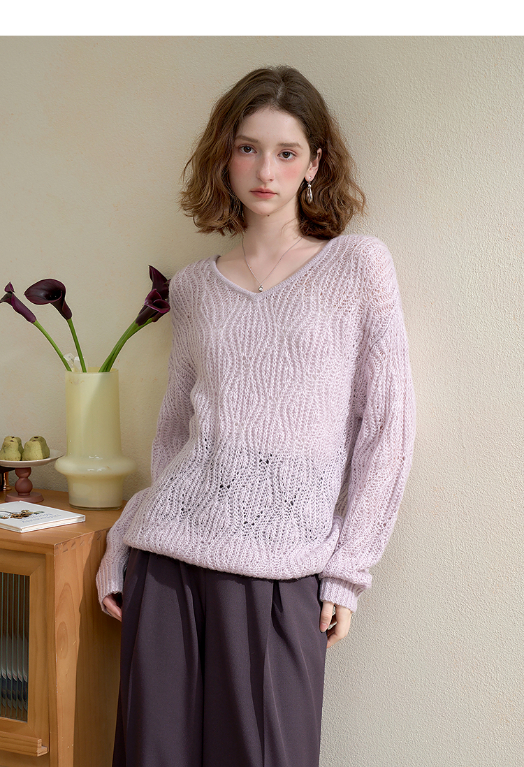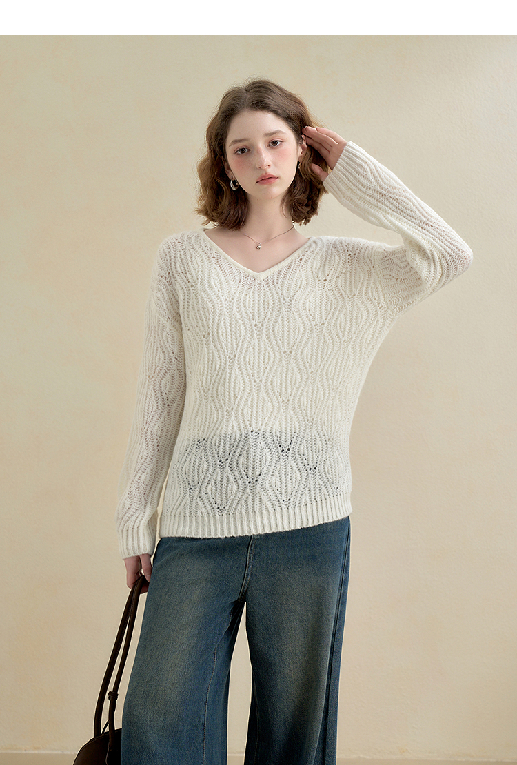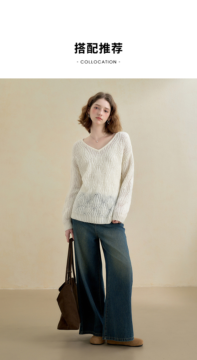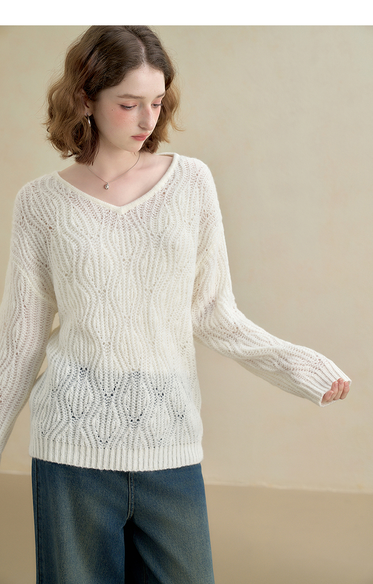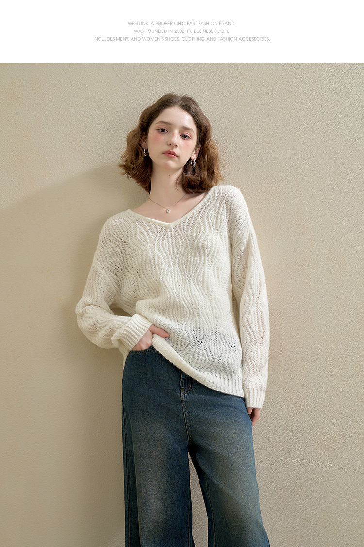 西遇慵懒风镂空钩花V领长袖针织衫女秋季宽松显瘦薄款罩衫V2651167