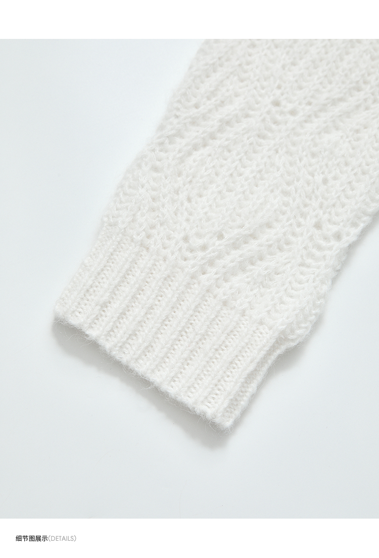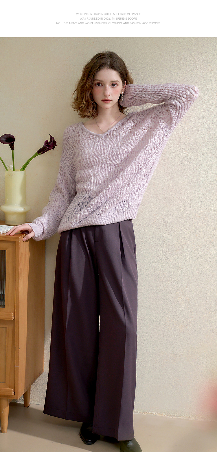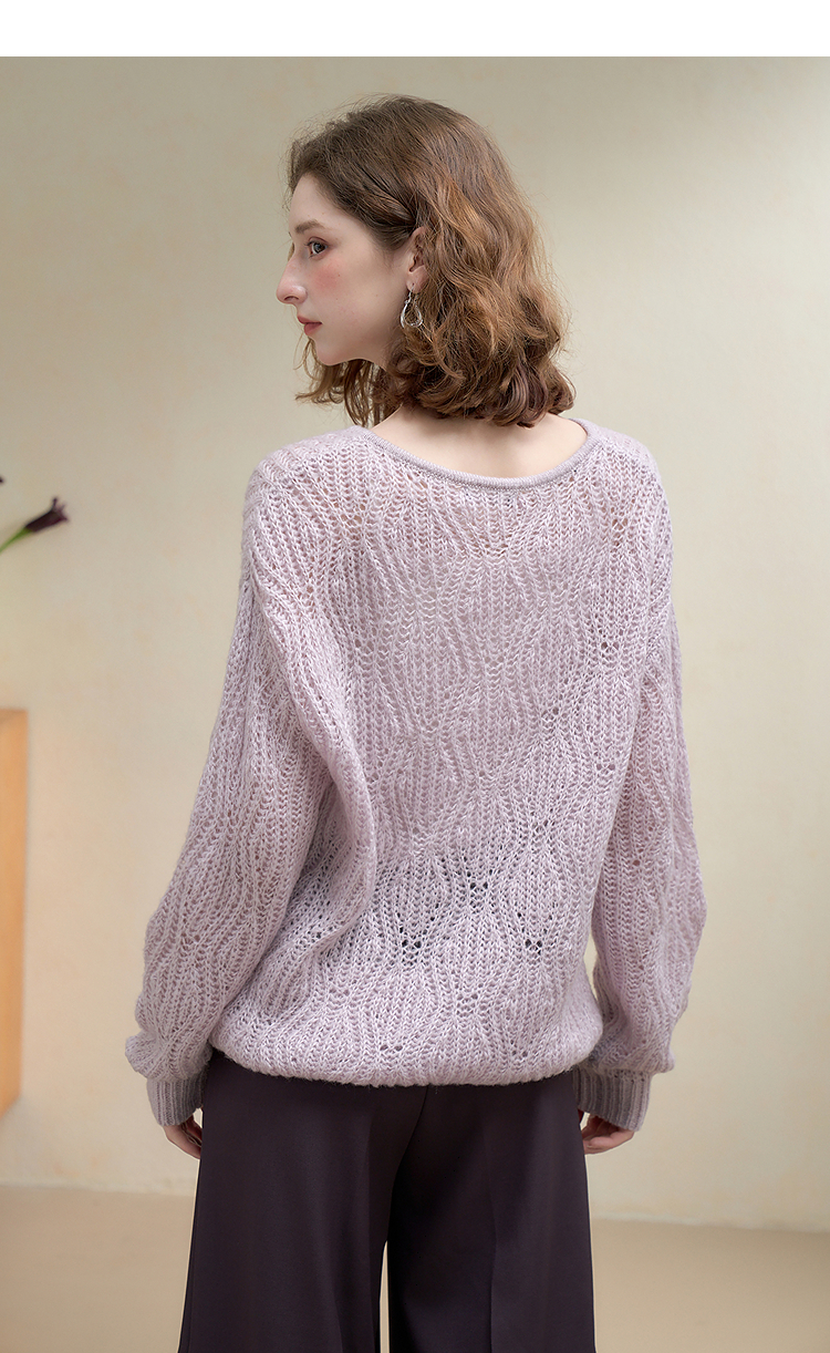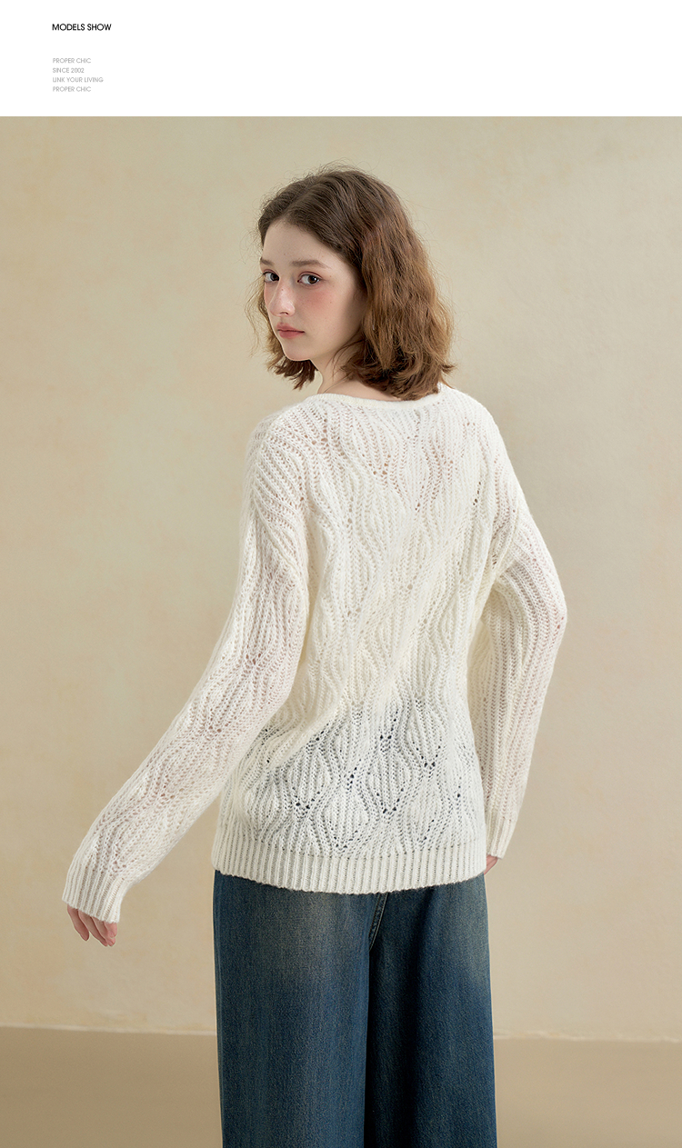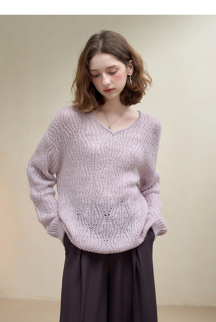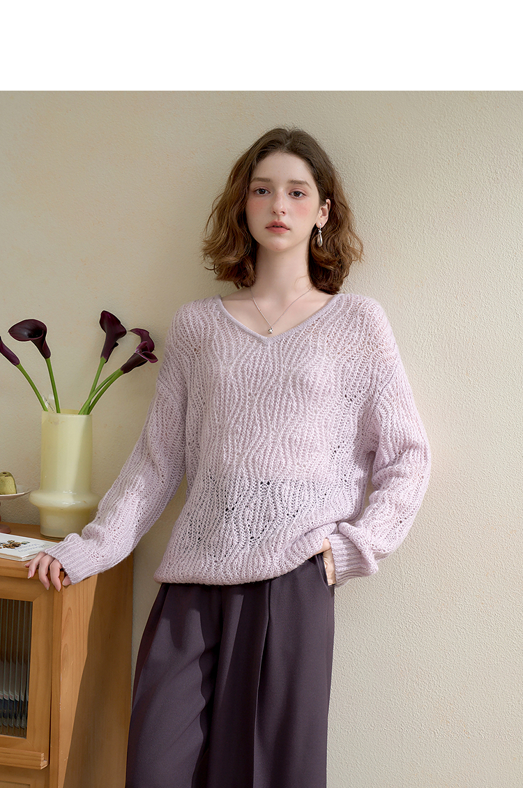 西遇慵懒风镂空钩花V领长袖针织衫女秋季宽松显瘦薄款罩衫V2651167