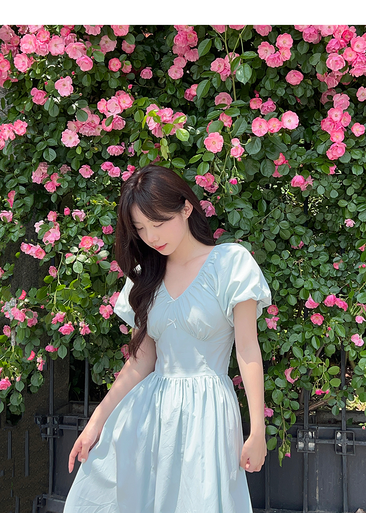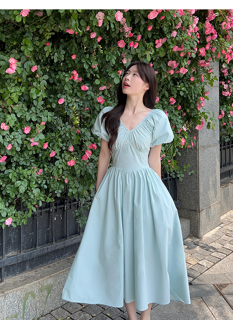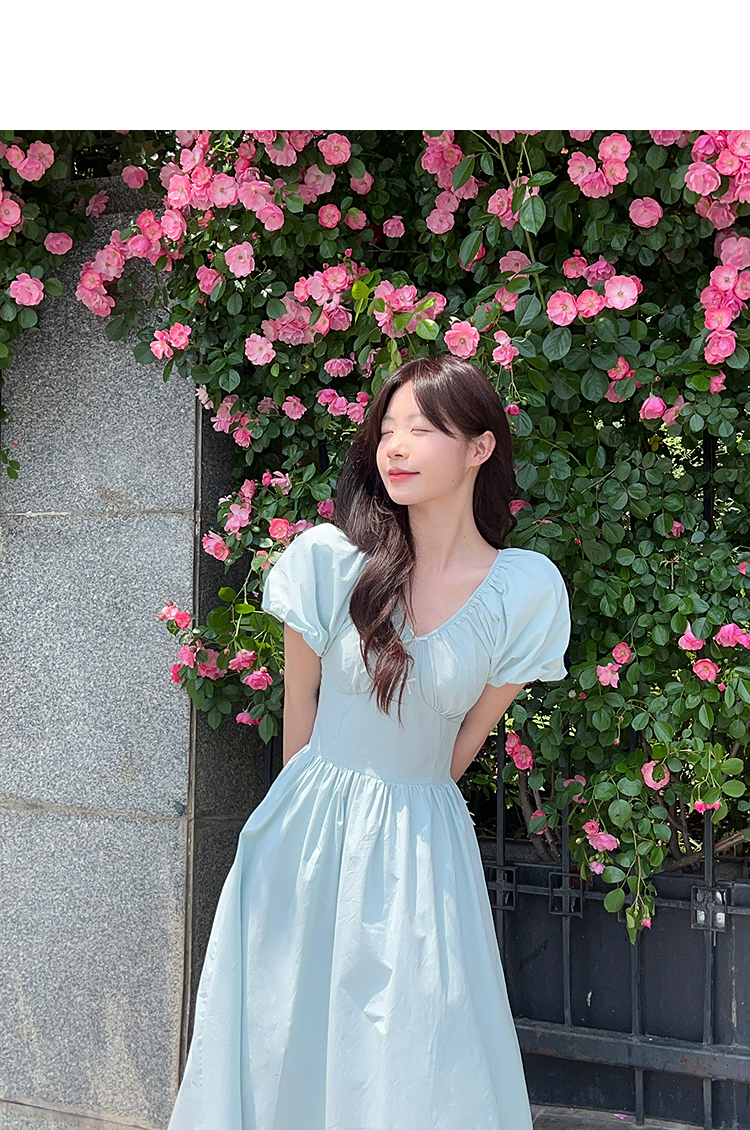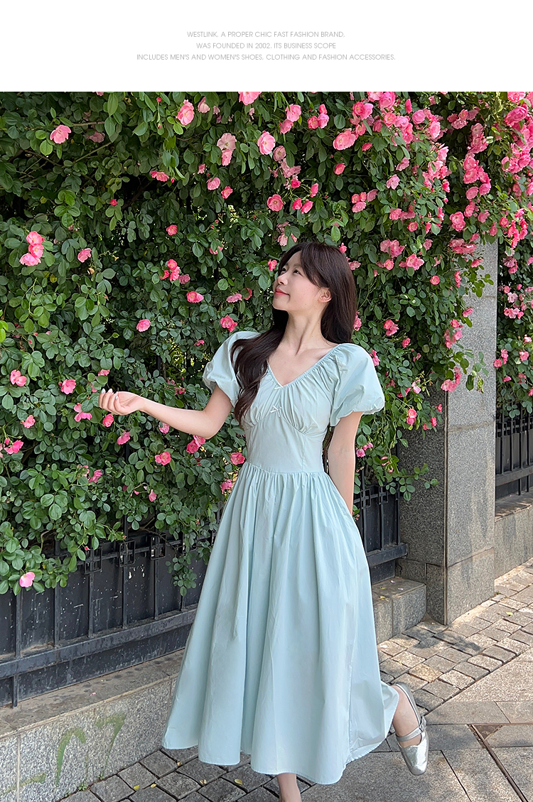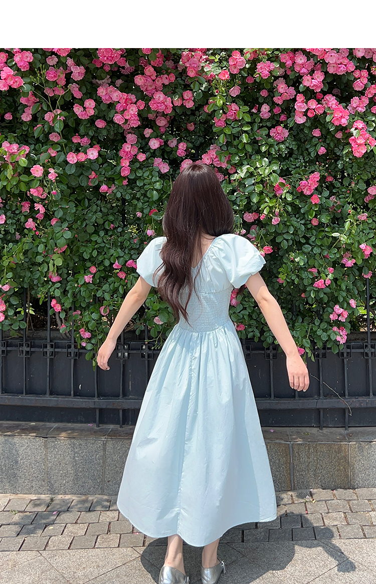 西遇法式掐腰连衣裙女夏季新款a字度假风蓝色泡泡袖长裙SS050486