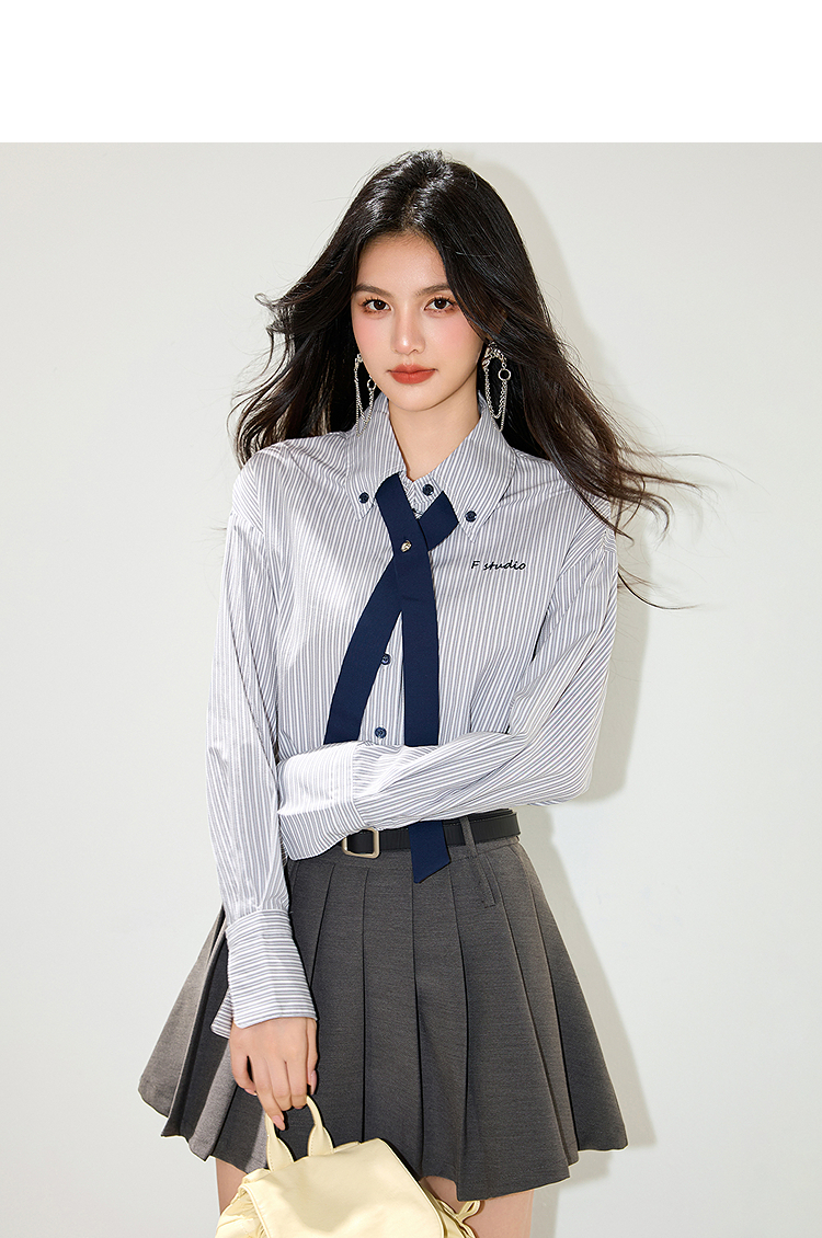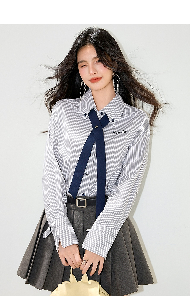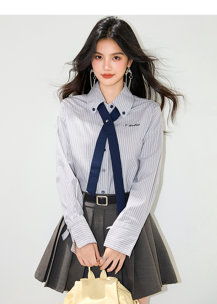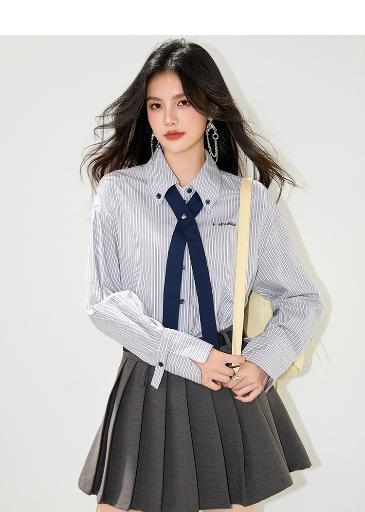 西遇条纹领带长袖衬衫女2026年春季新款宽松POLO领休闲刺绣衬衣SS060153