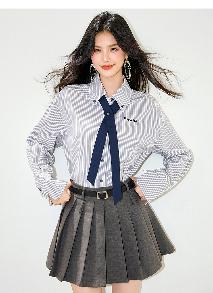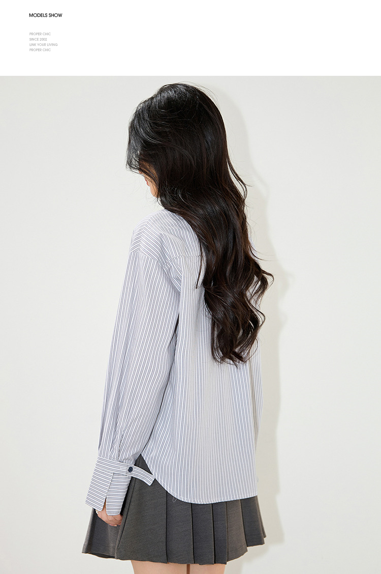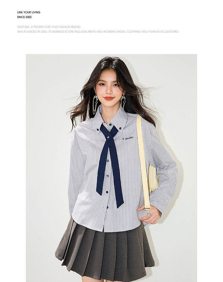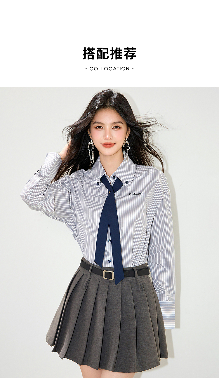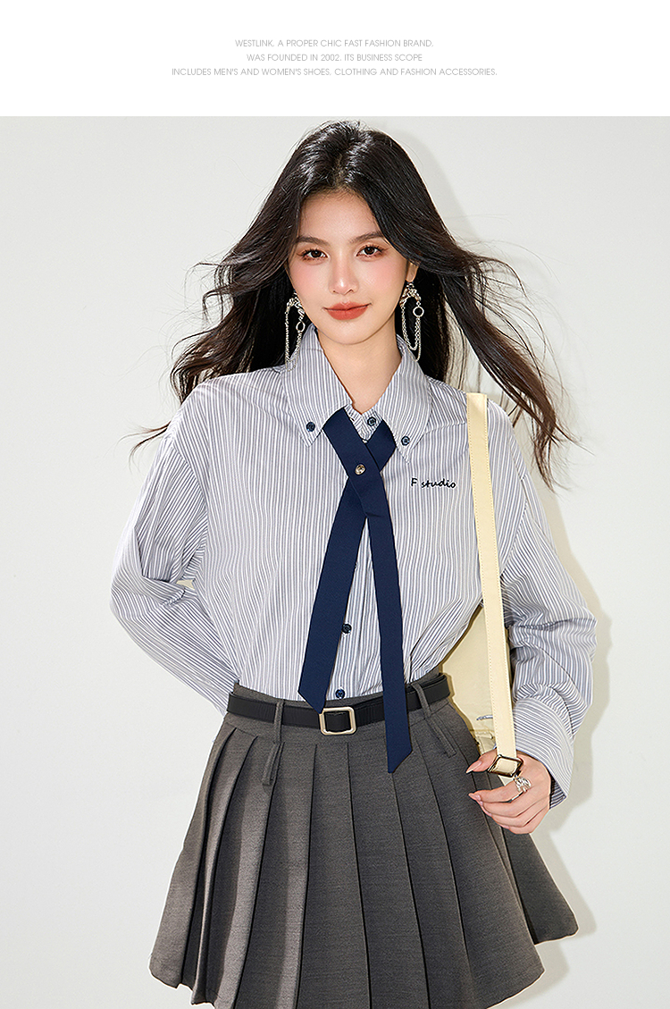 西遇条纹领带长袖衬衫女2026年春季新款宽松POLO领休闲刺绣衬衣SS060153