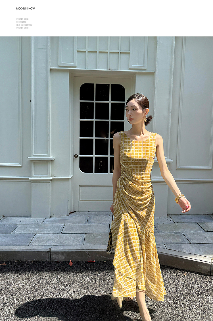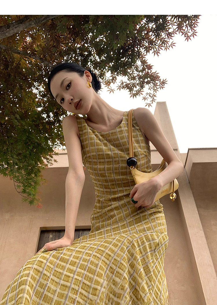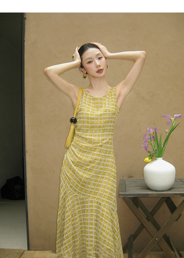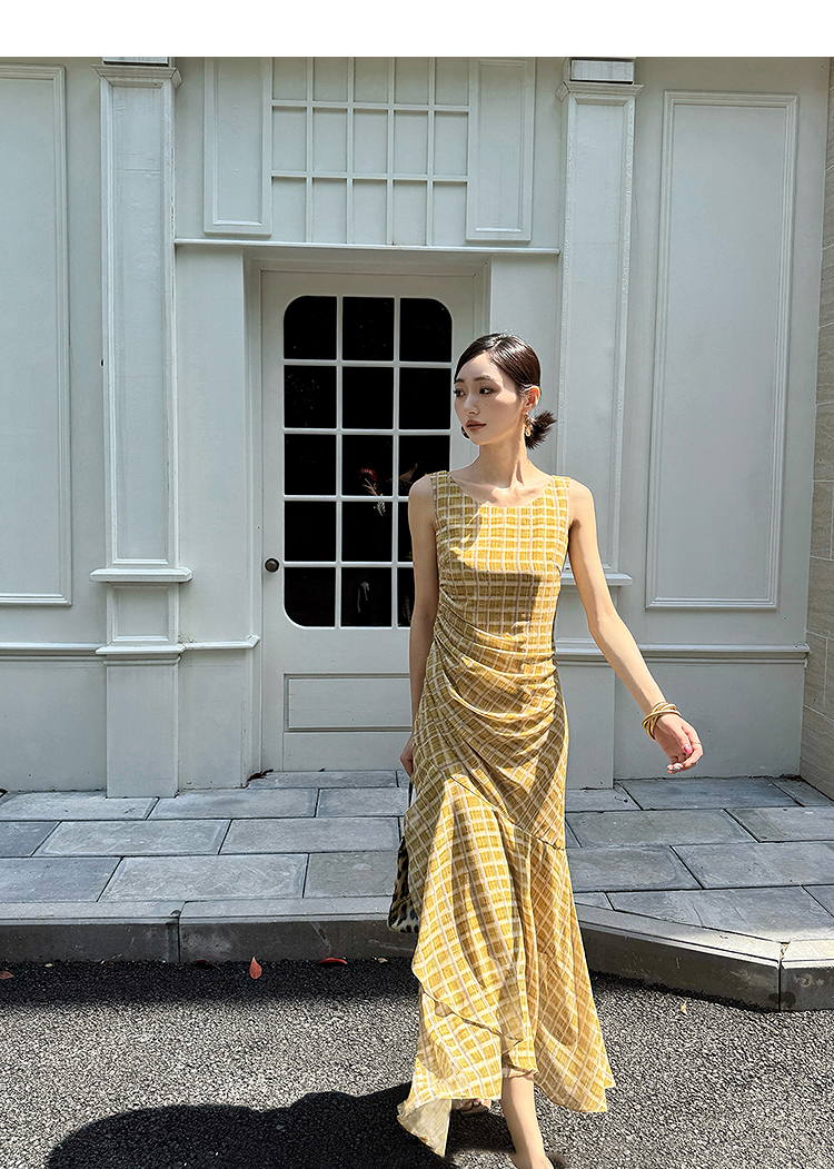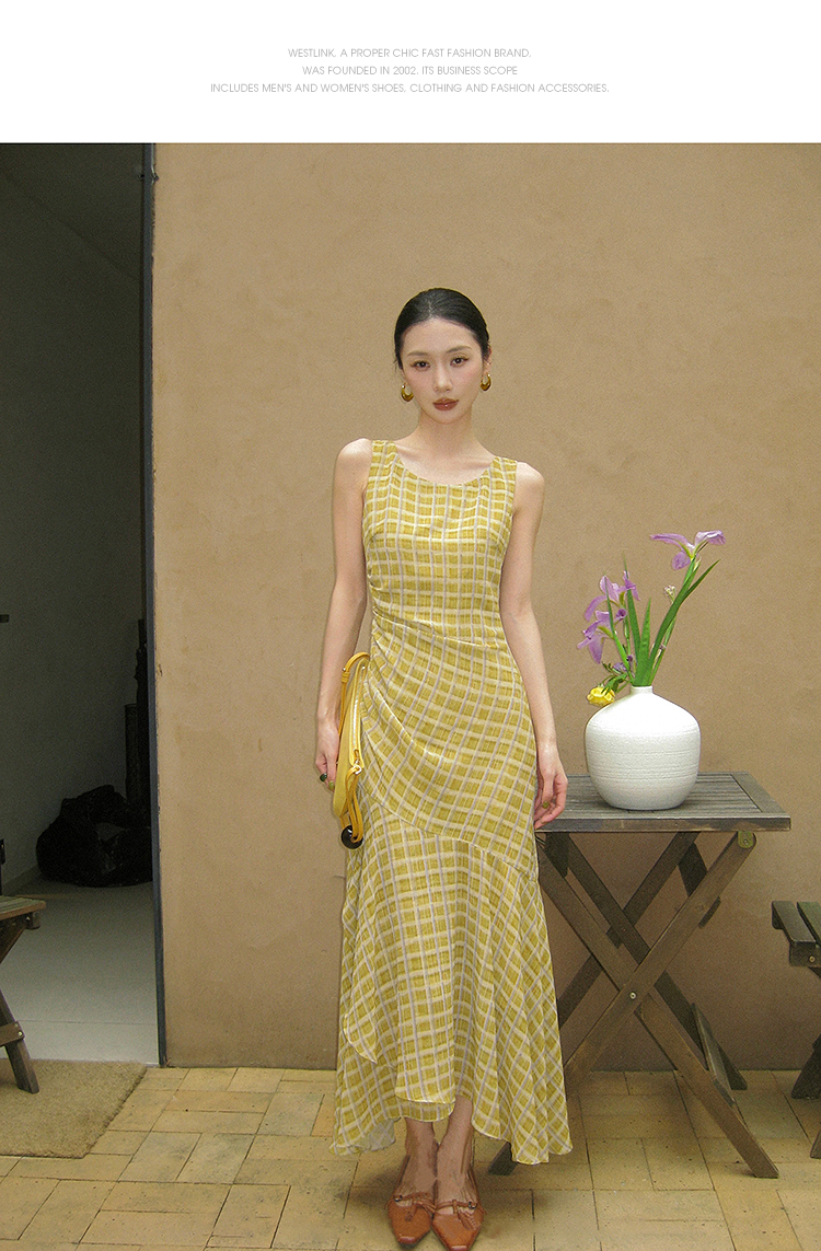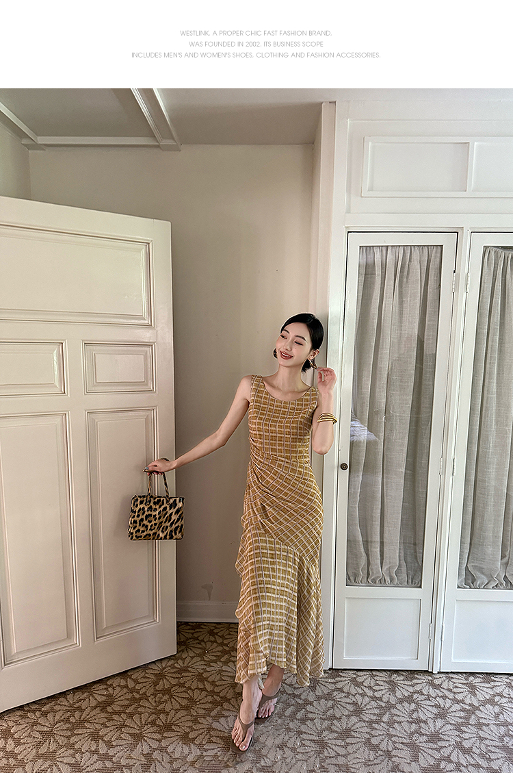 西遇无袖格纹连衣裙女夏季新款圆领收腰包臀鱼尾背心长裙SS051050