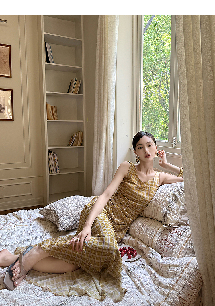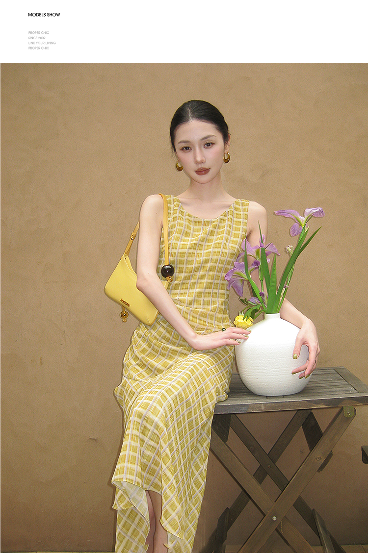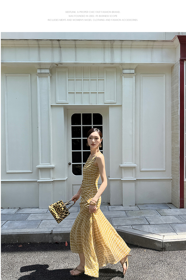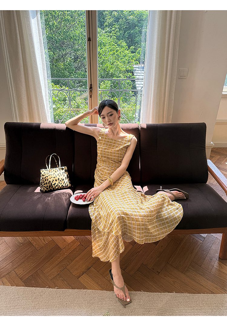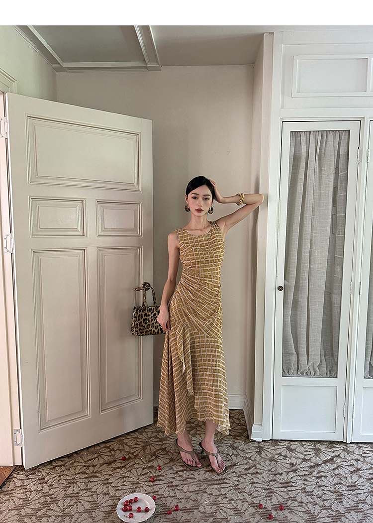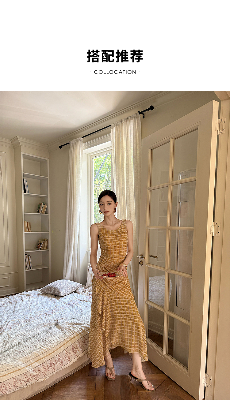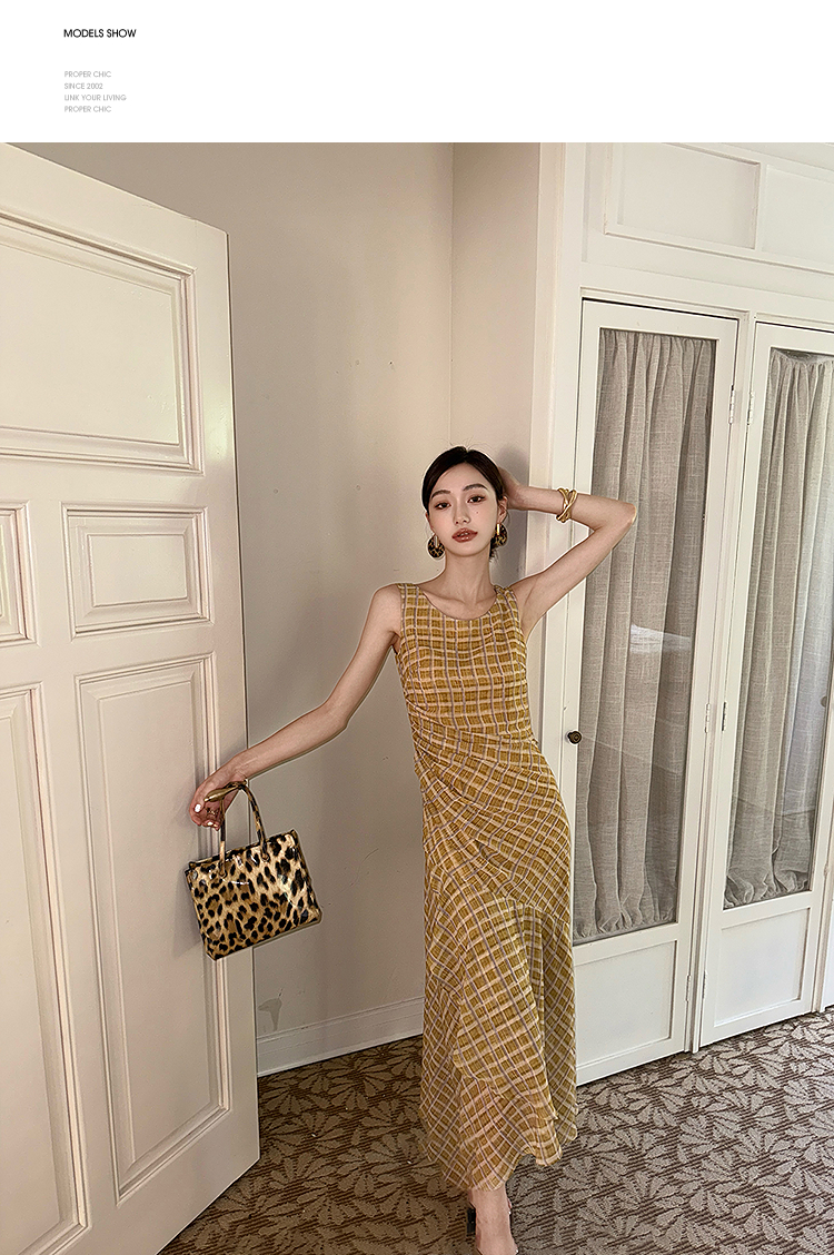 西遇无袖格纹连衣裙女夏季新款圆领收腰包臀鱼尾背心长裙SS051050
