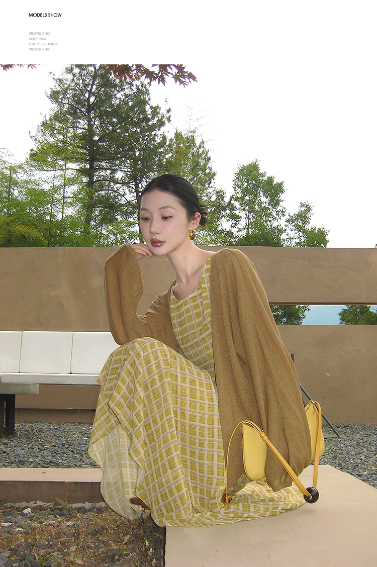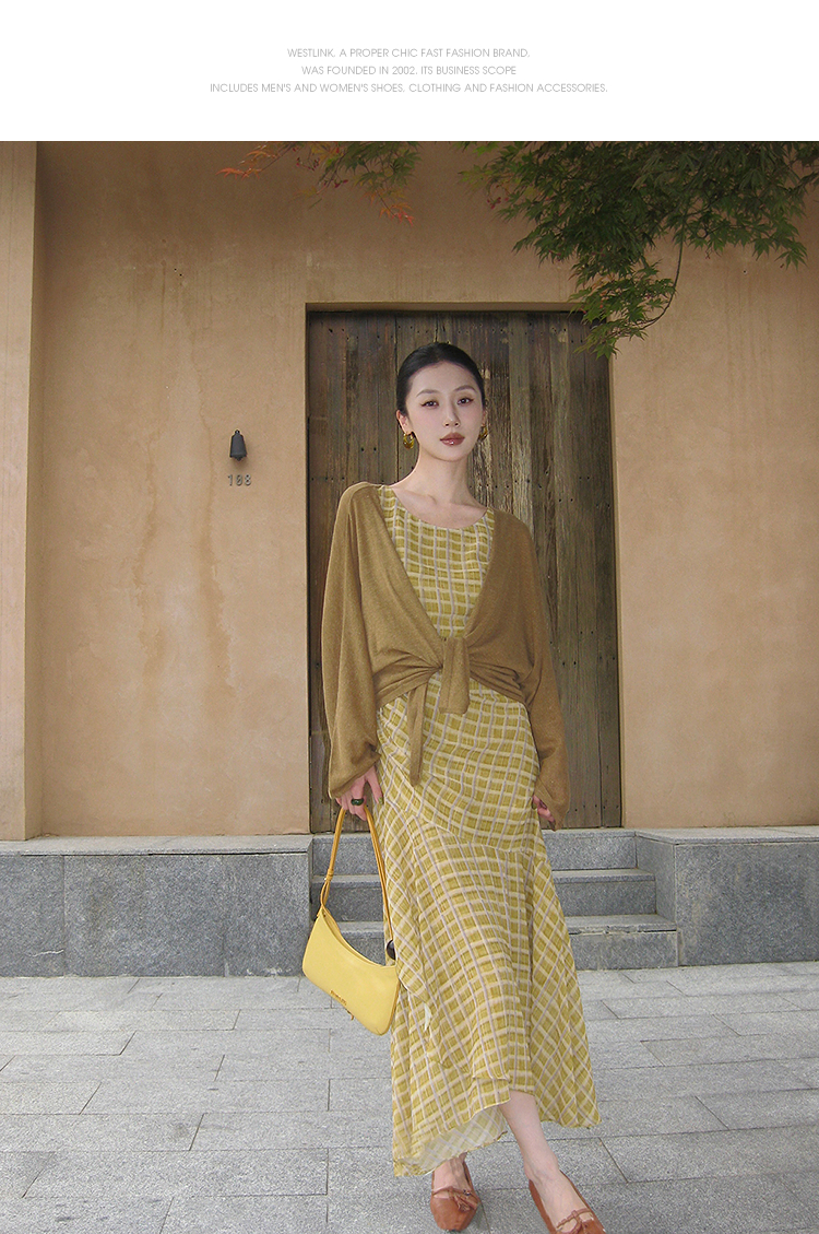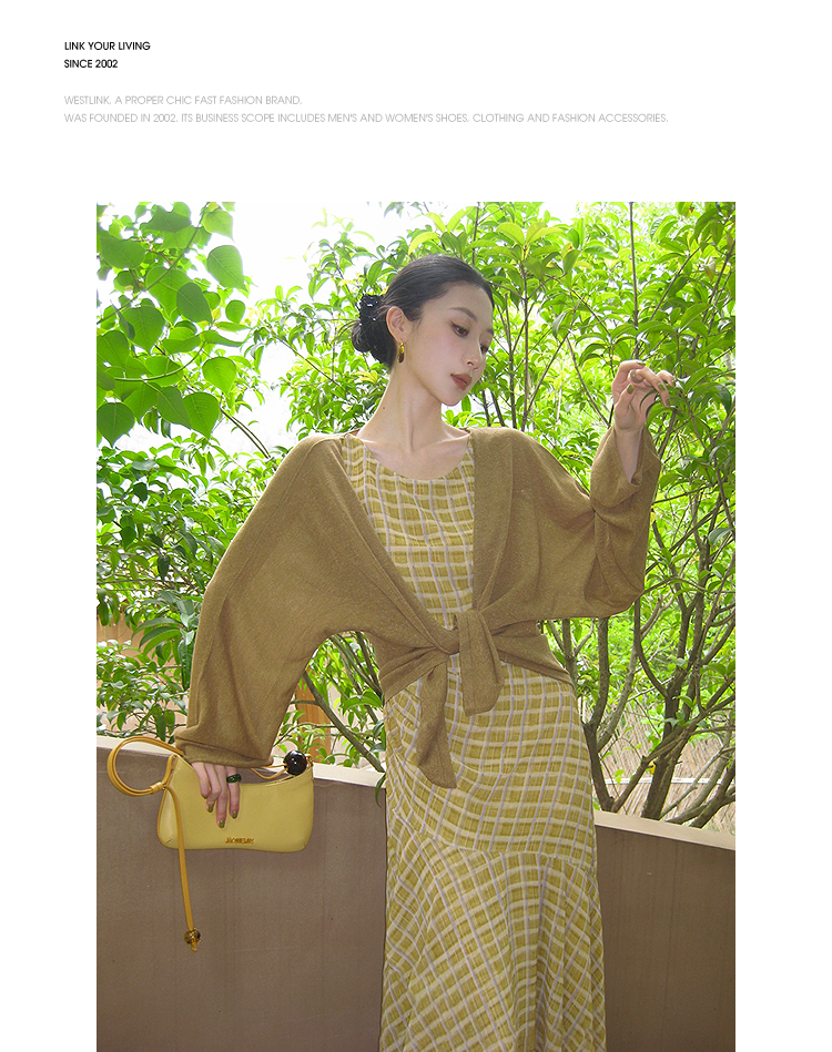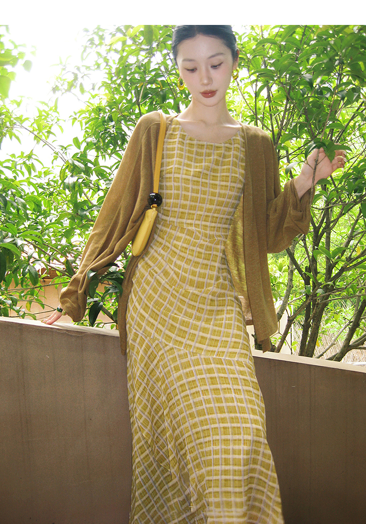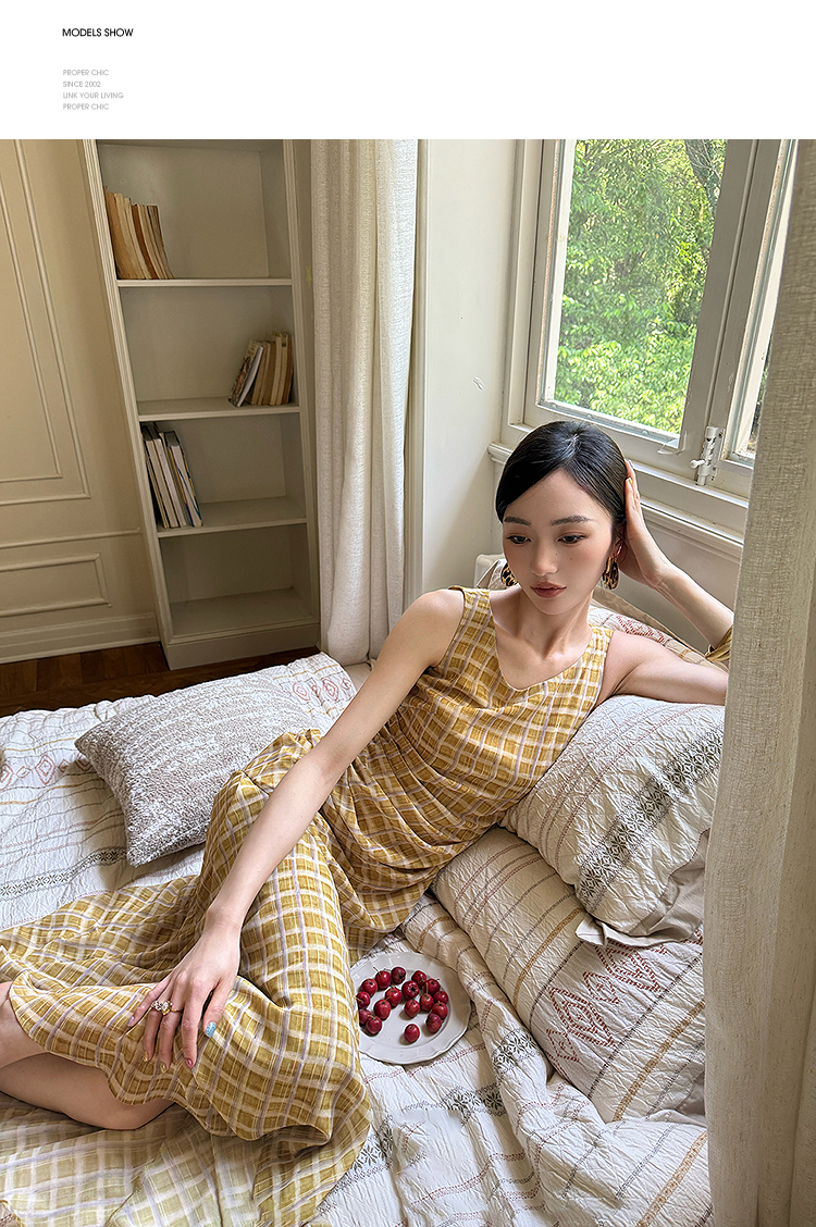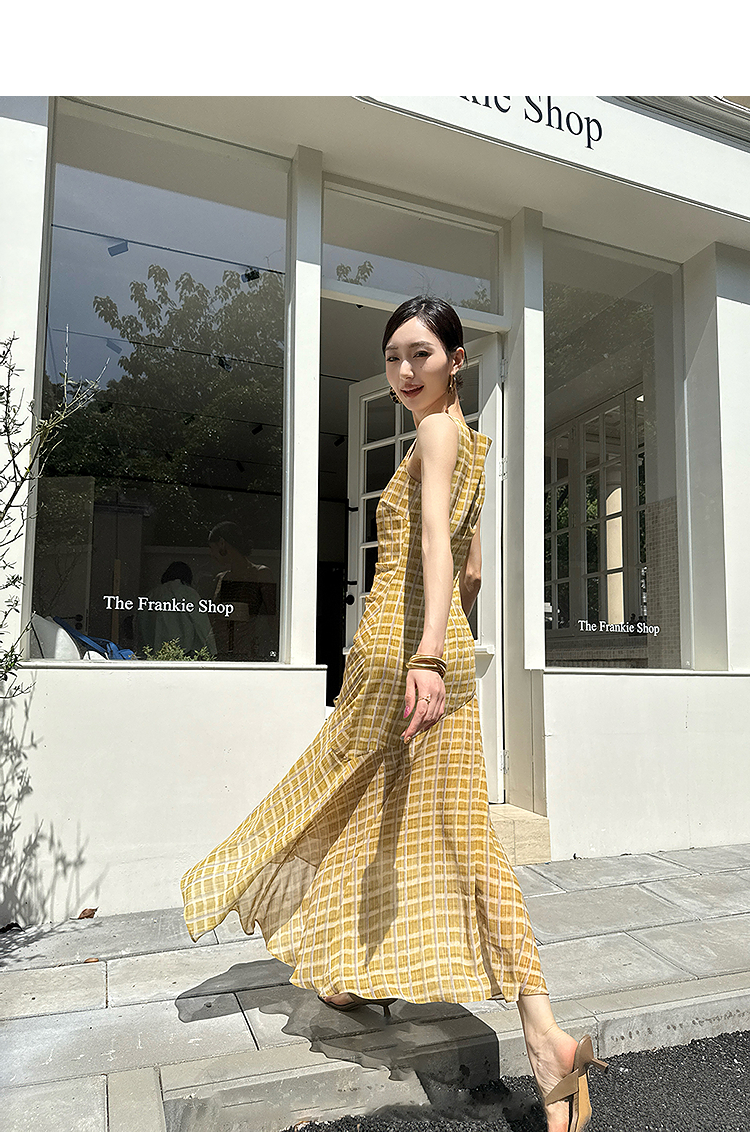 西遇无袖格纹连衣裙女夏季新款圆领收腰包臀鱼尾背心长裙SS051050