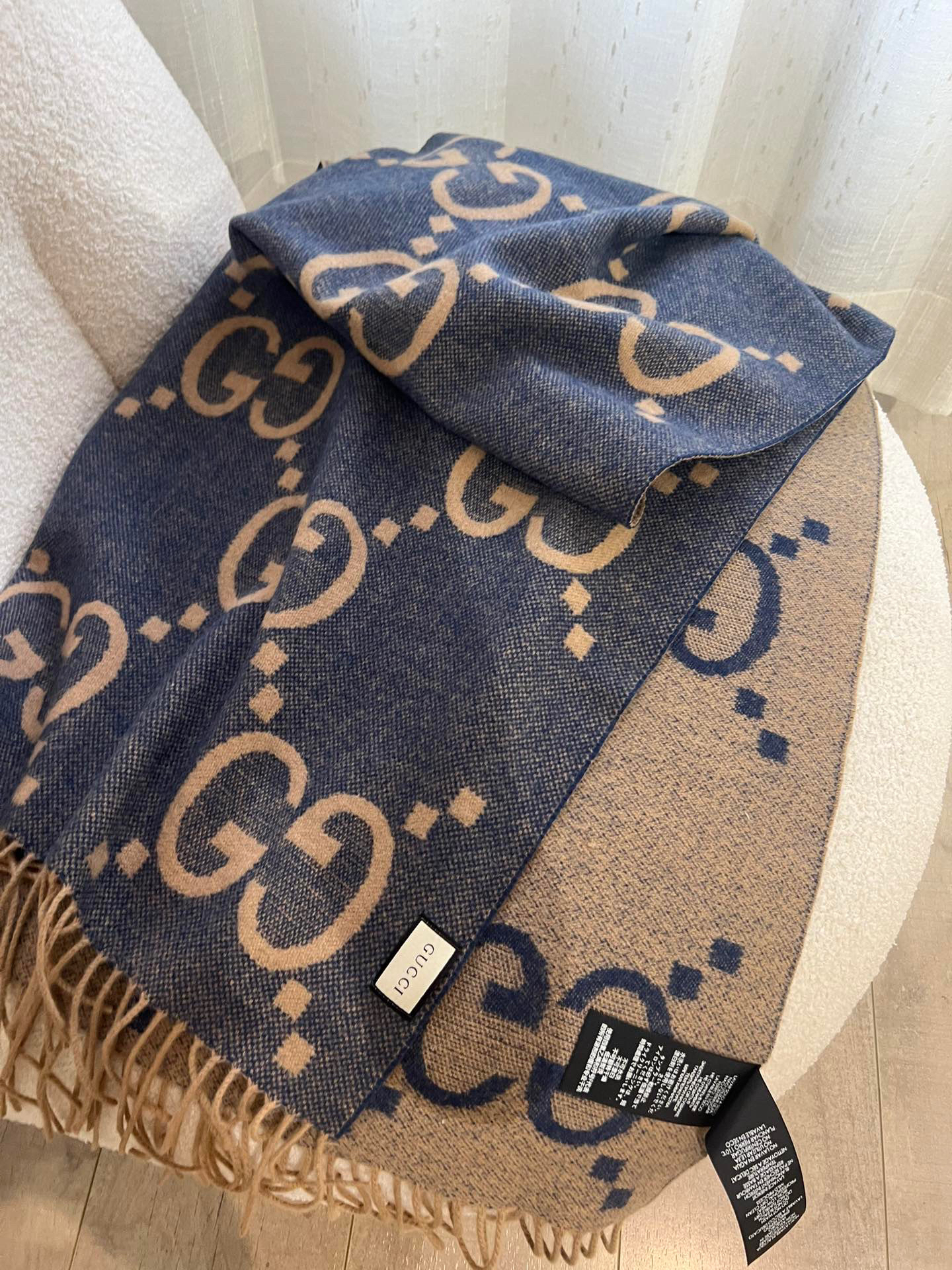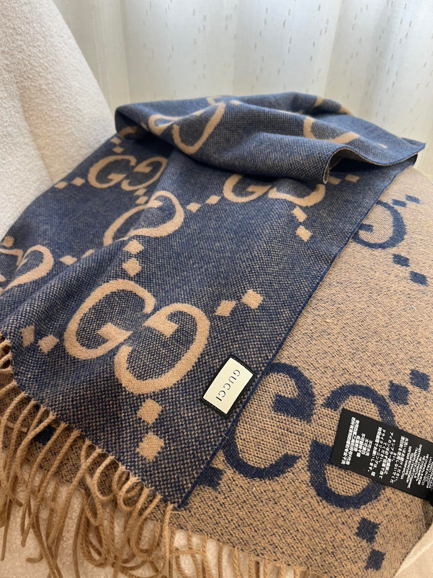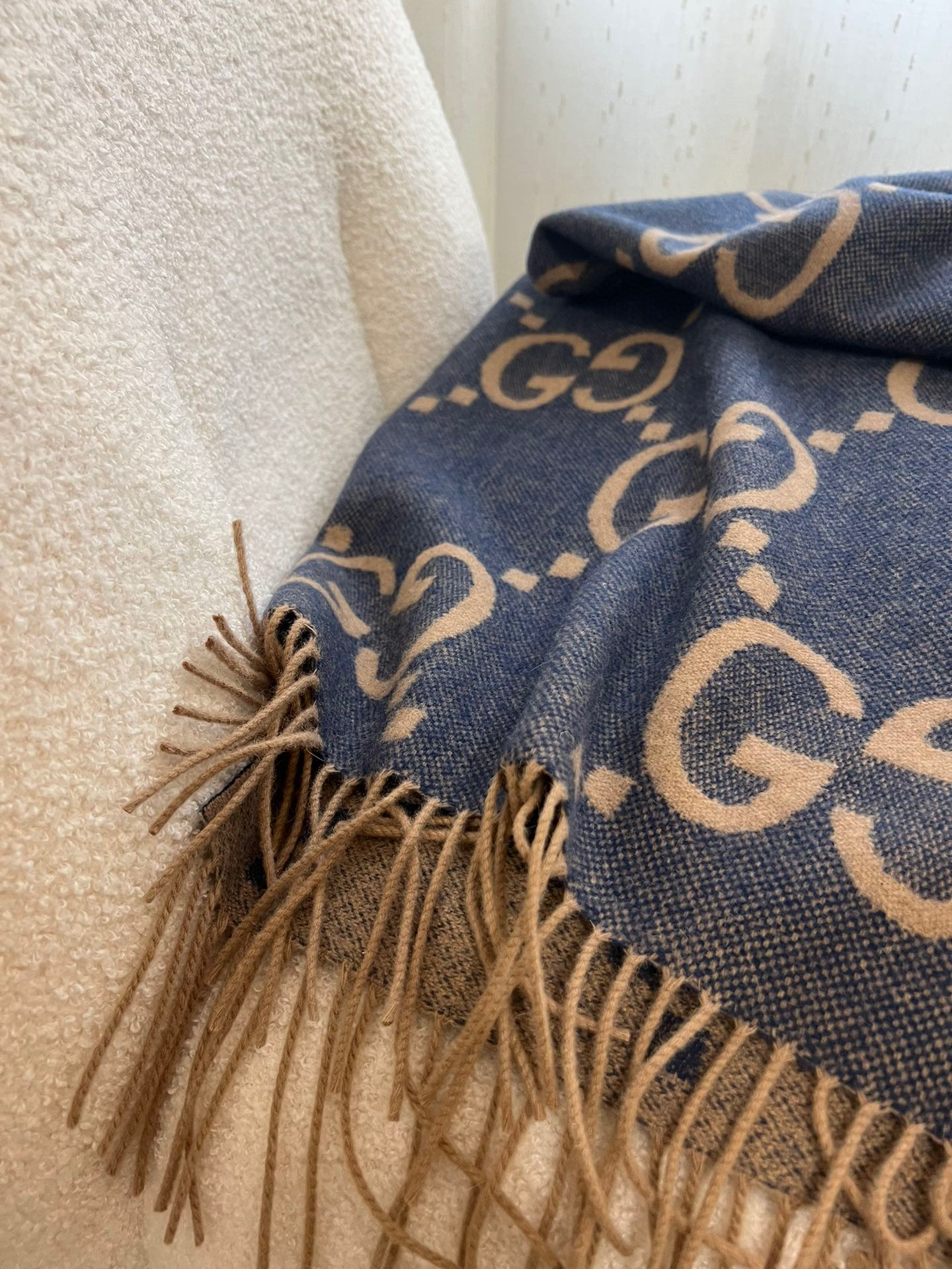 Gucci羊绒围巾蓝棕双面