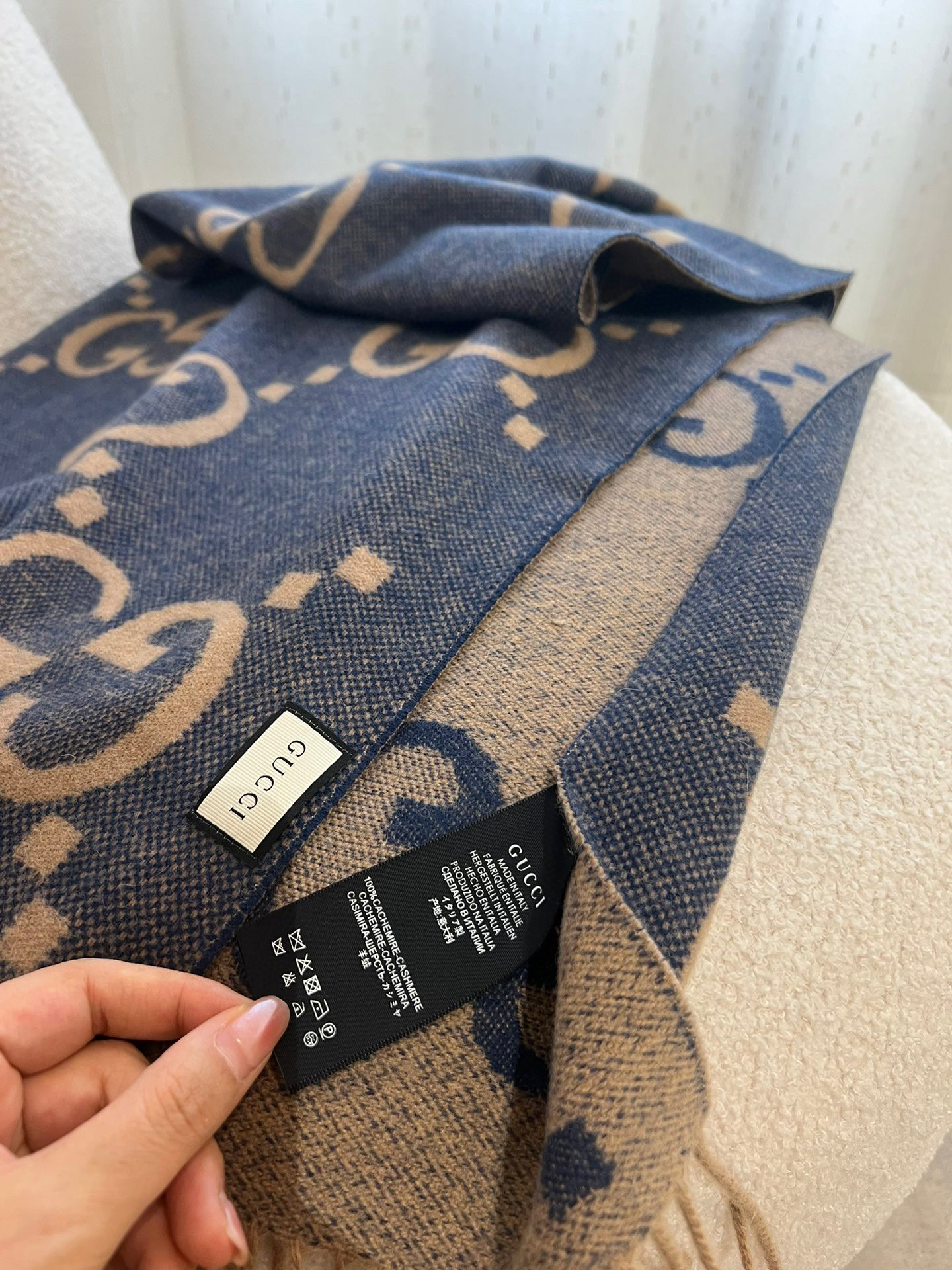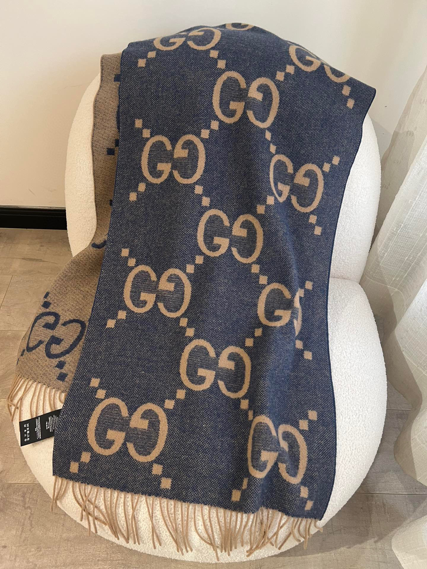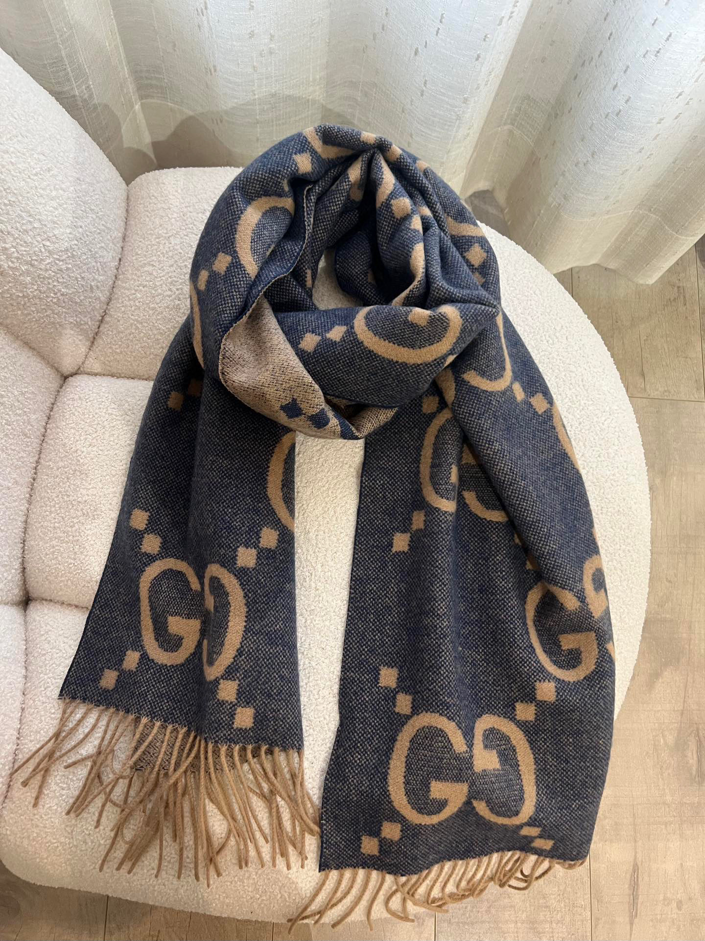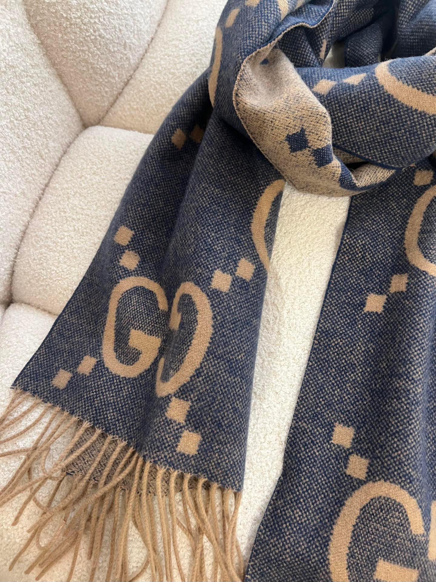 Gucci羊绒围巾蓝棕双面