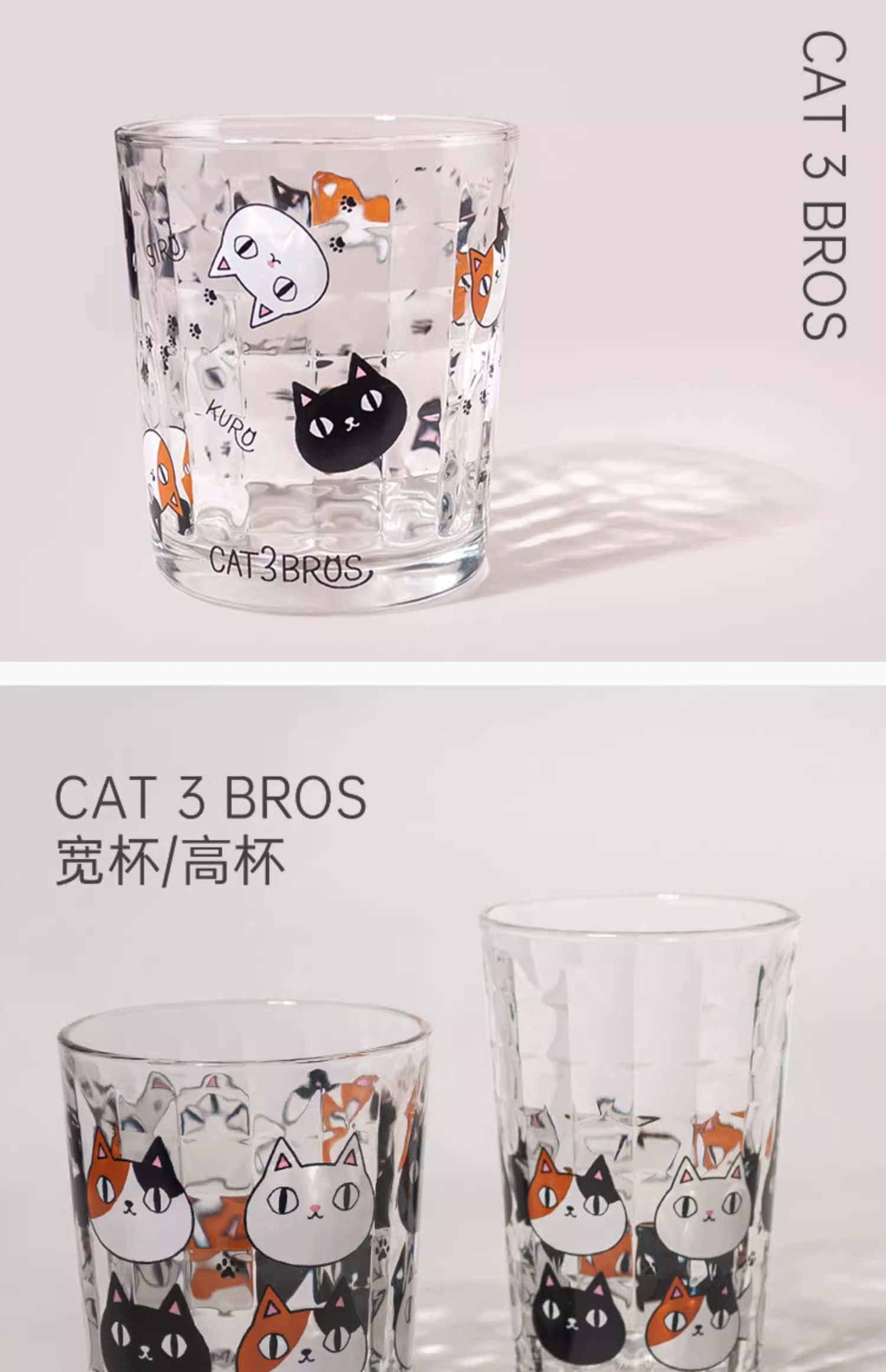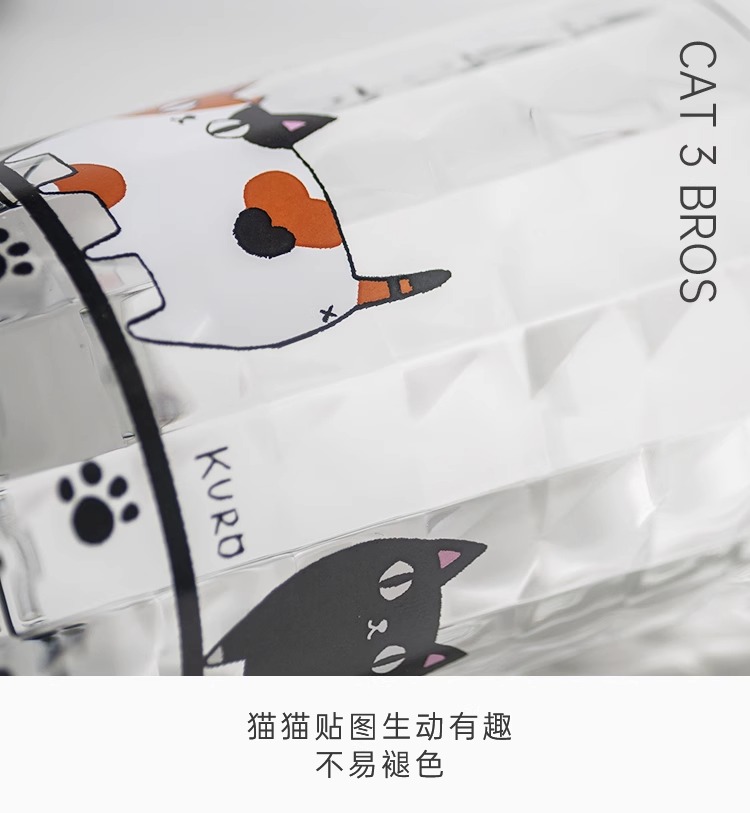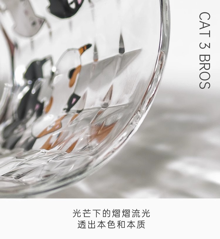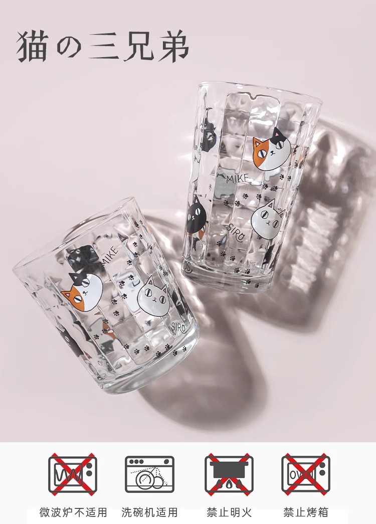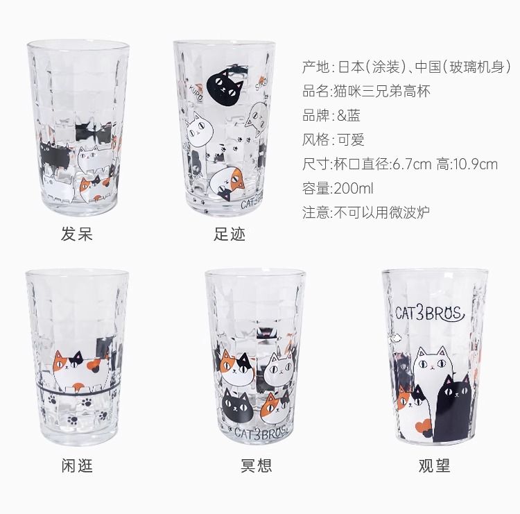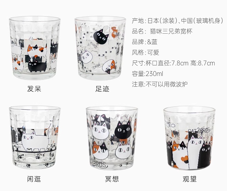 【清仓特惠4折】日本进口和蓝玻璃杯可爱猫咪三兄弟印花水杯家用透明牛奶杯子【不支持补差,非质量问题不退不换】S