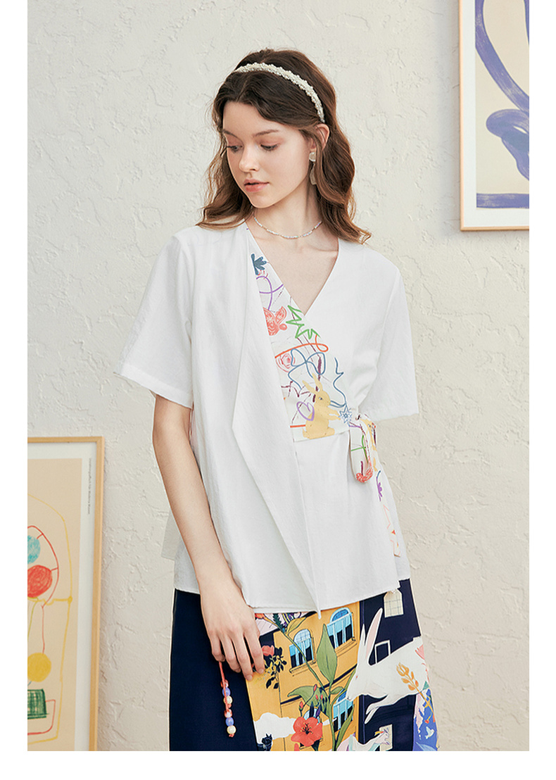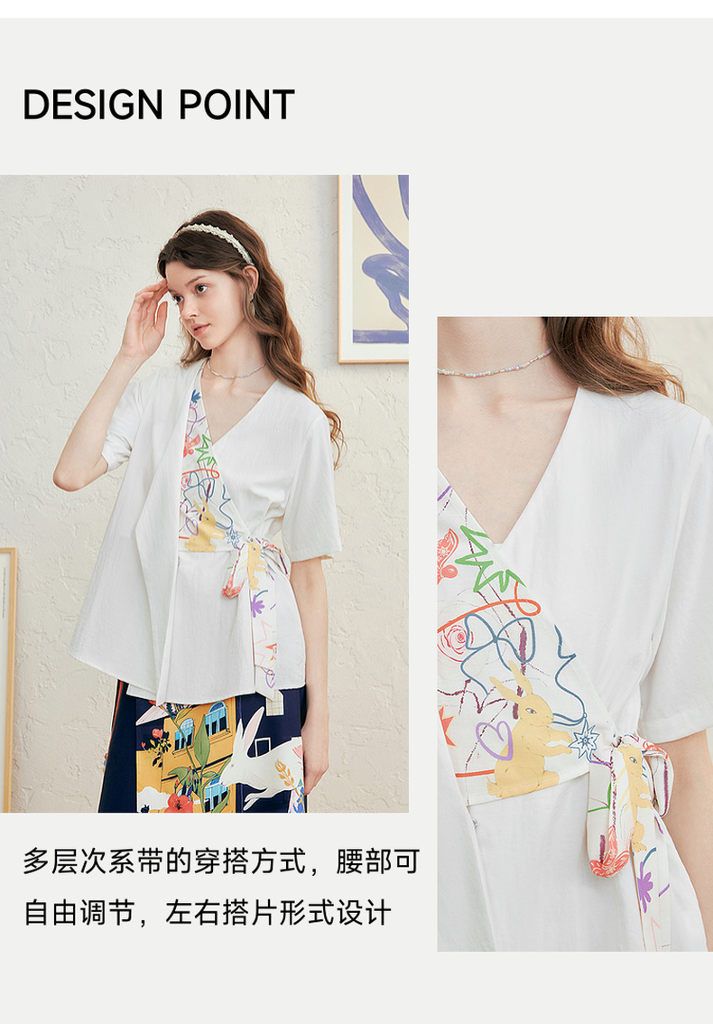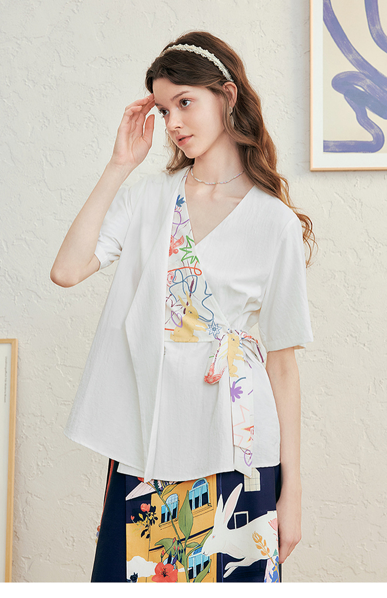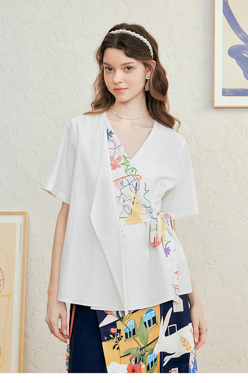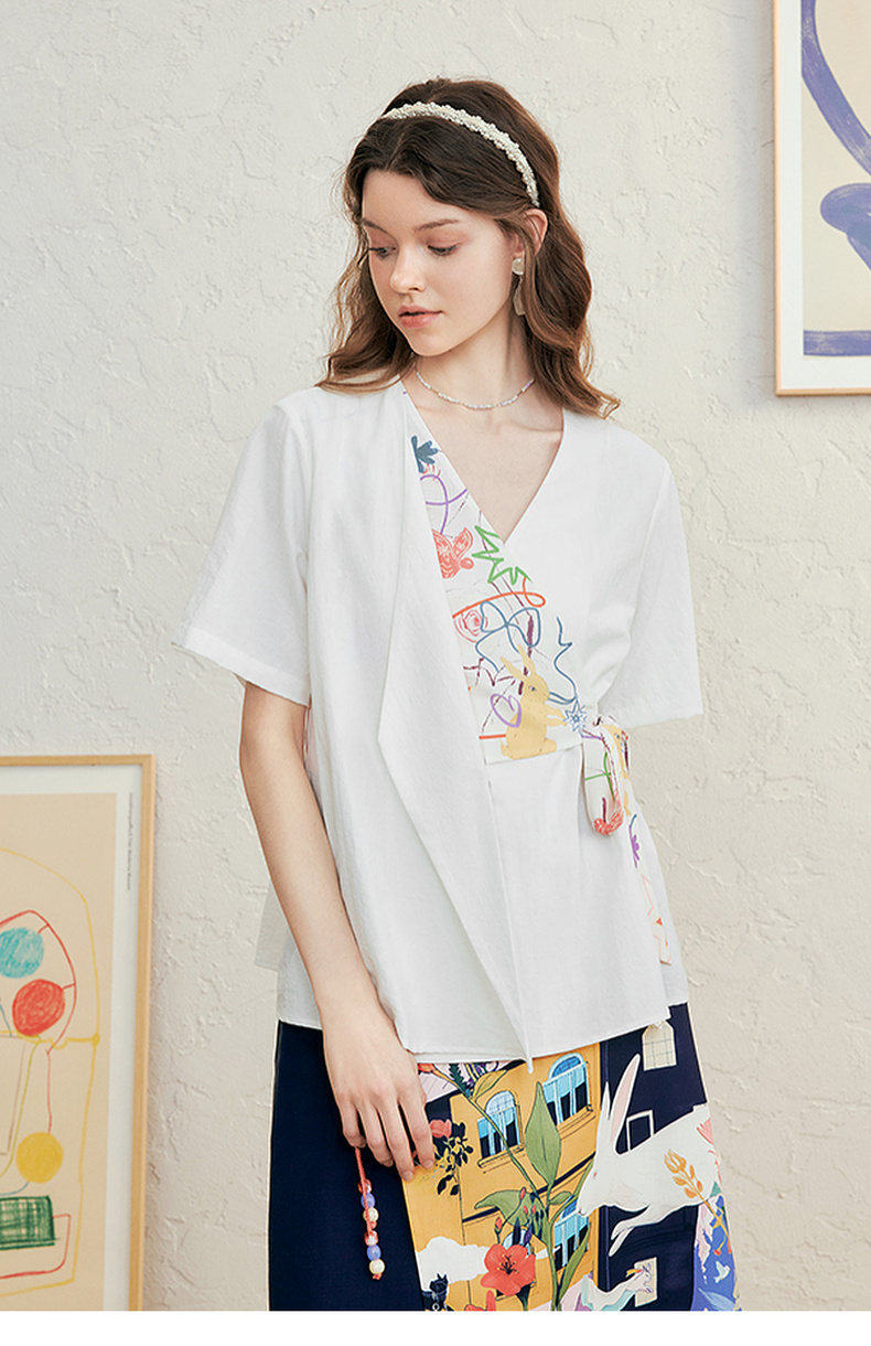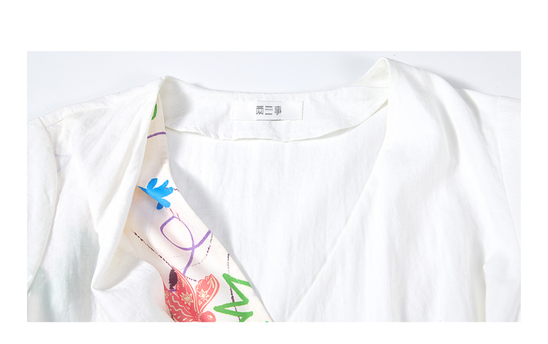 两三事 本真底色 2025春季新款文艺风印花绑带v领衬衫女宽松