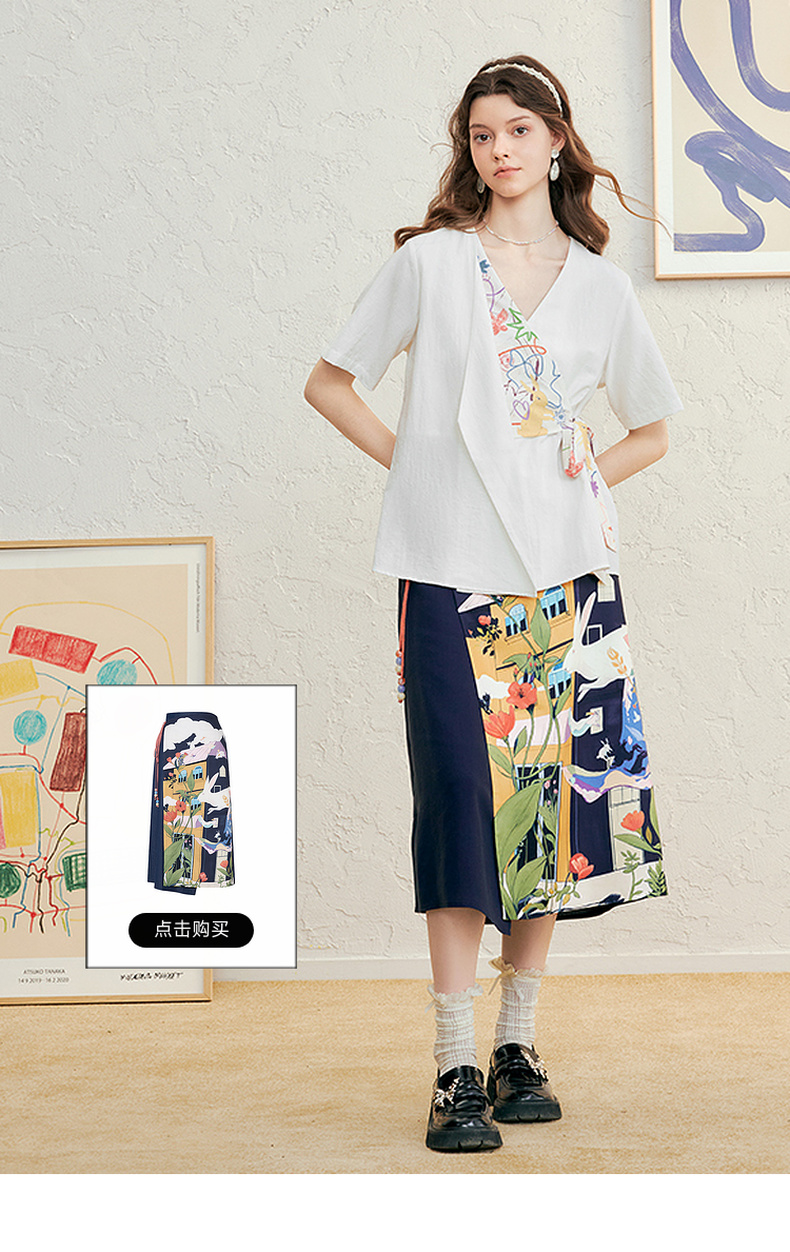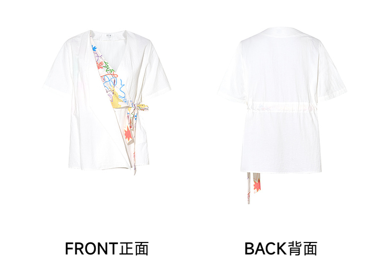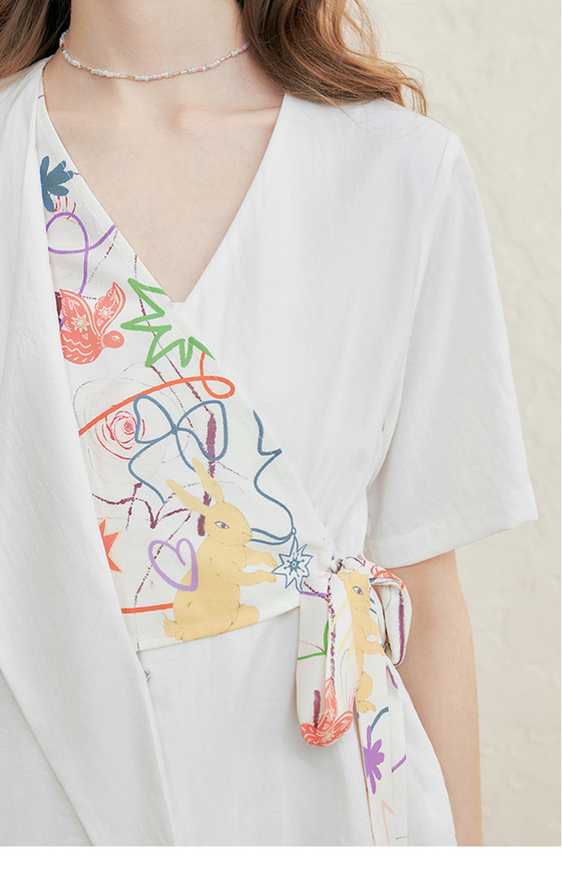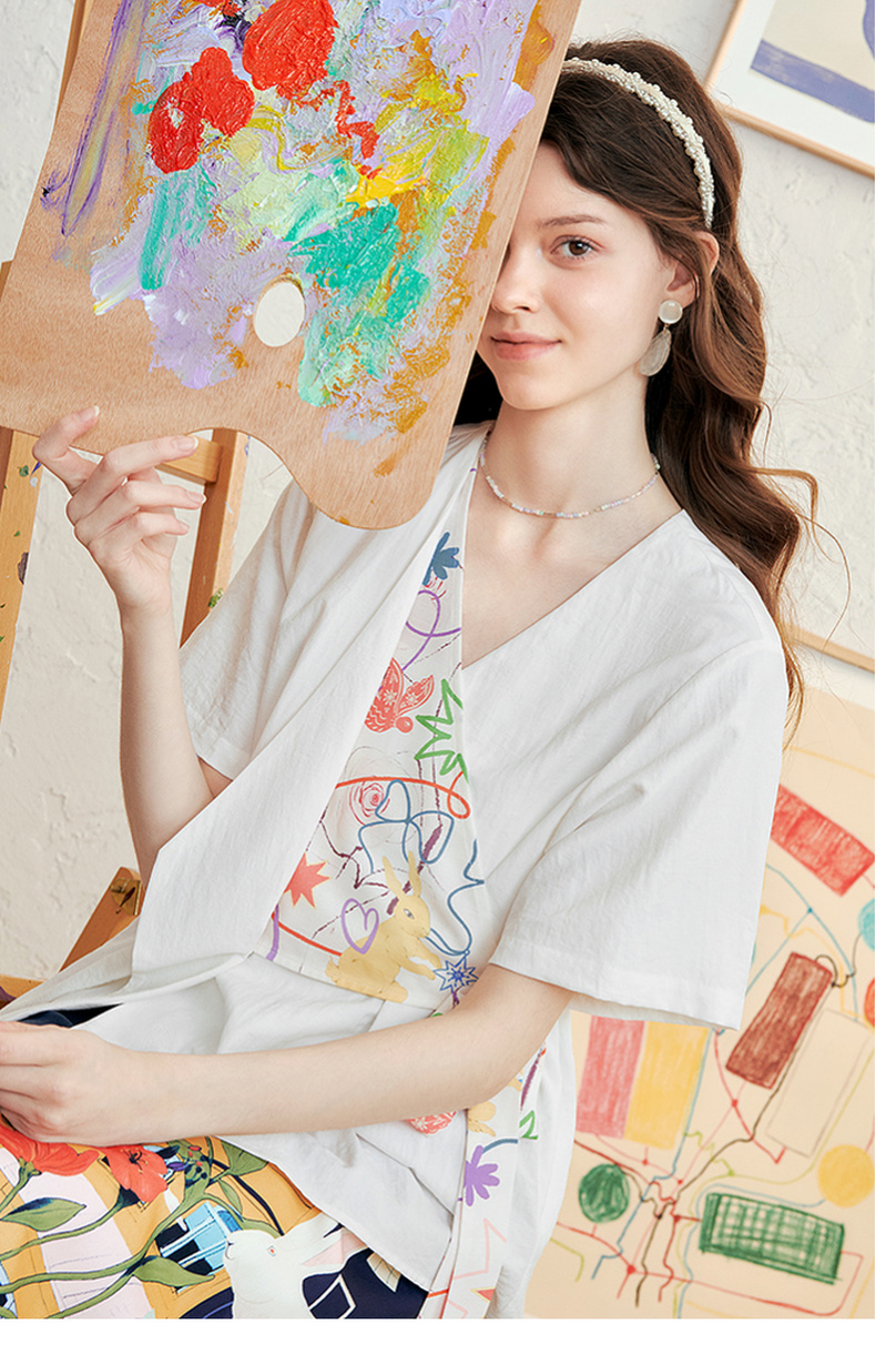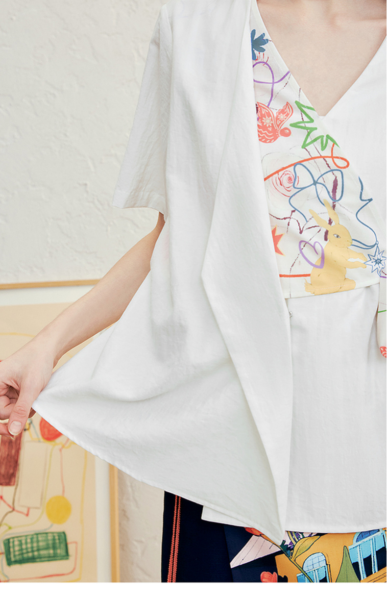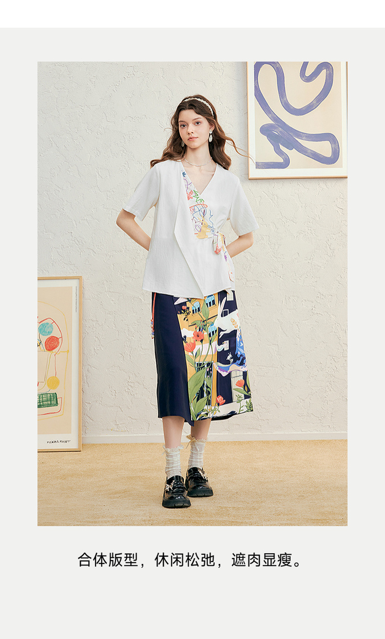 两三事 本真底色 2025春季新款文艺风印花绑带v领衬衫女宽松