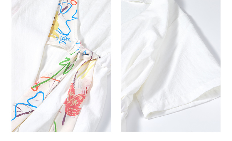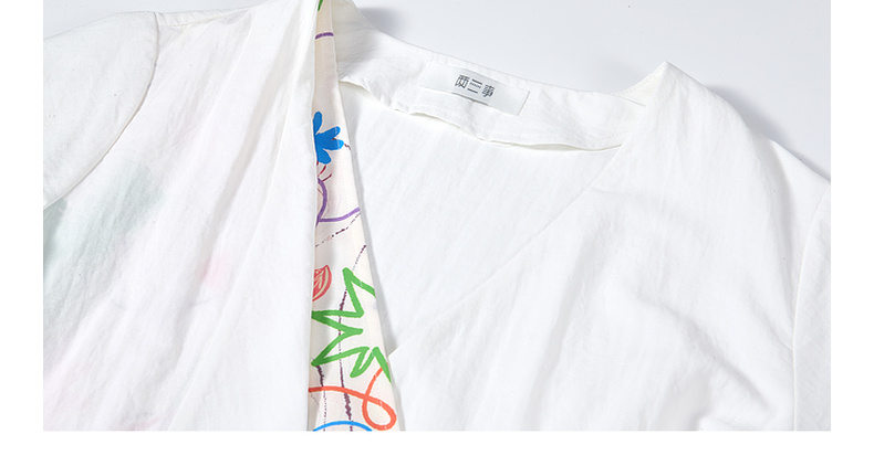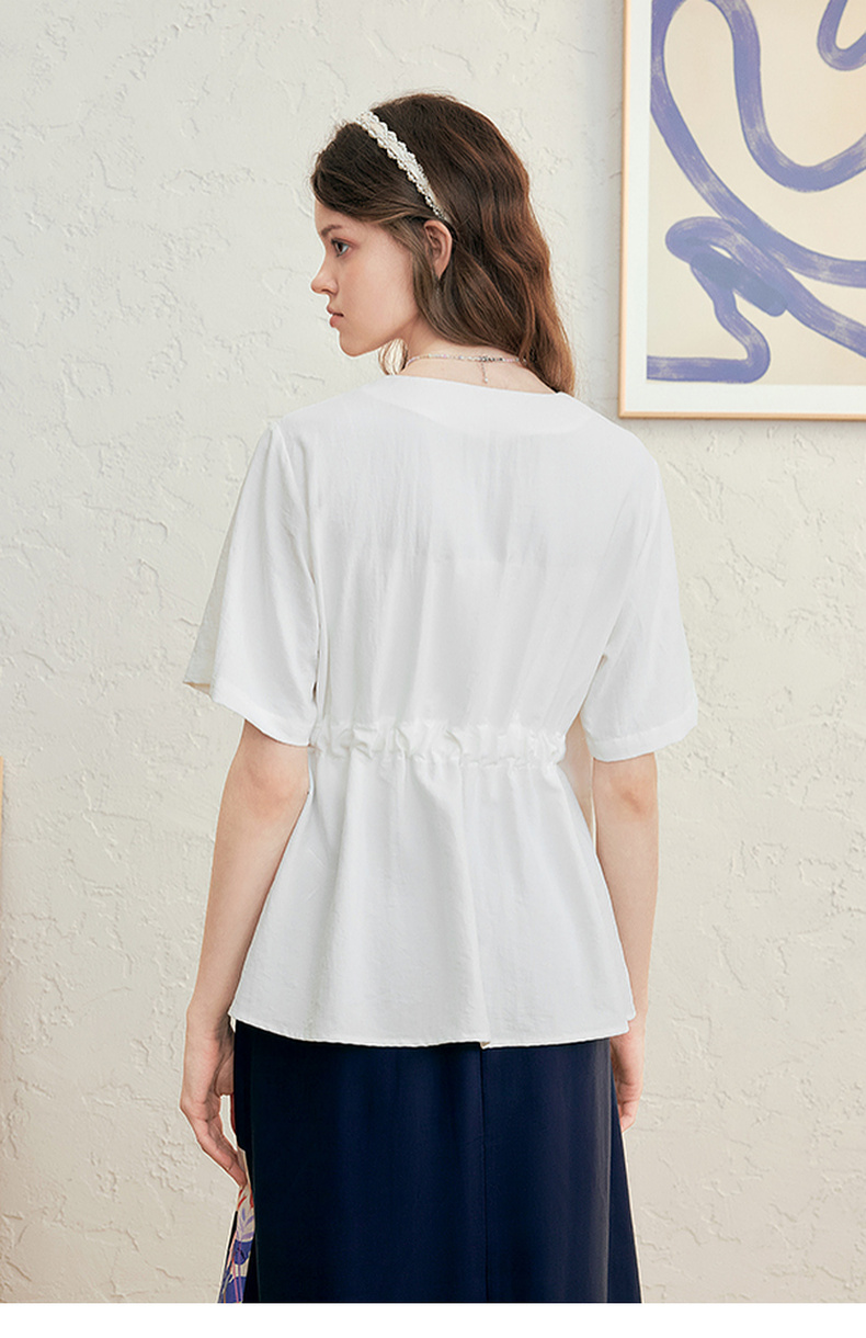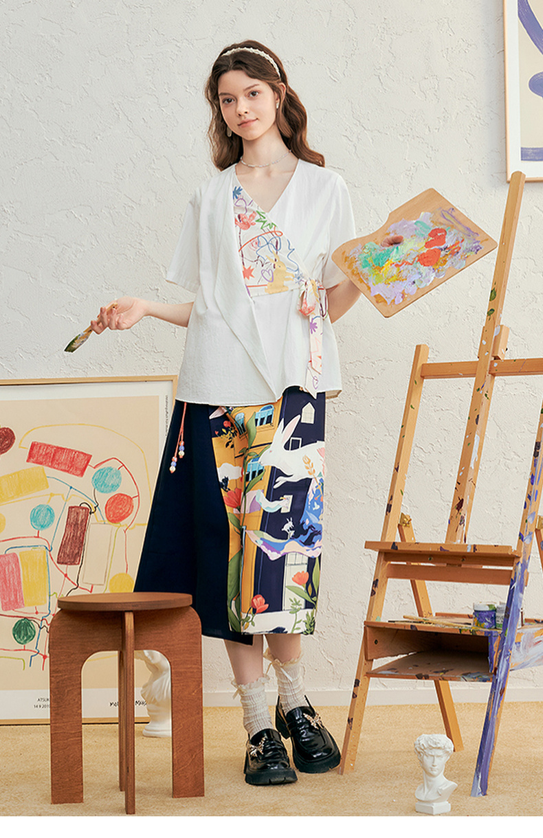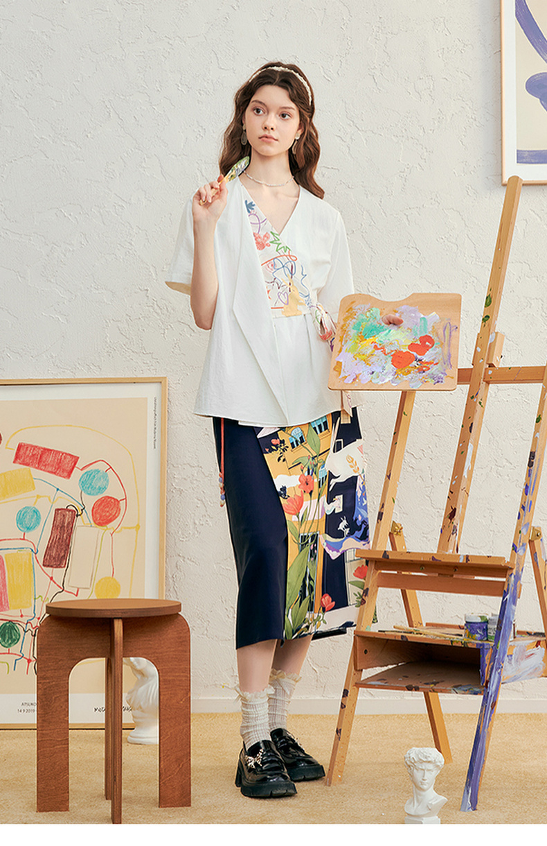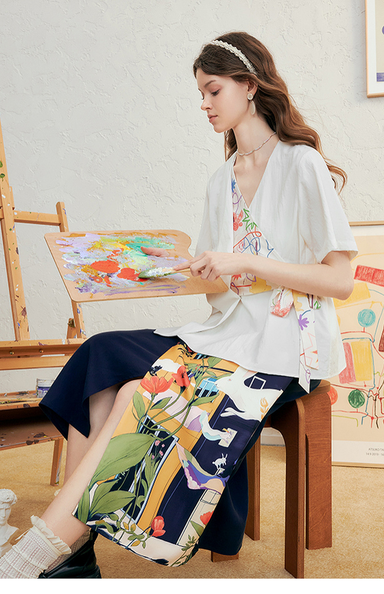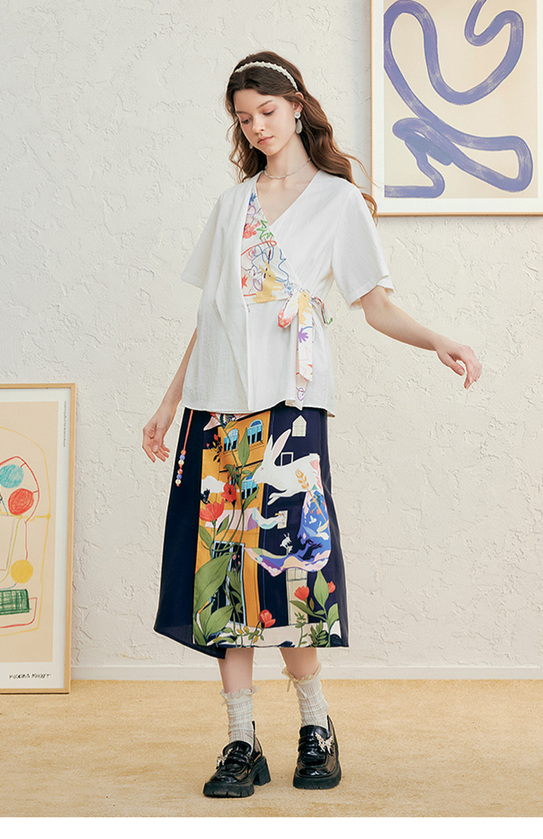 两三事 本真底色 2025春季新款文艺风印花绑带v领衬衫女宽松