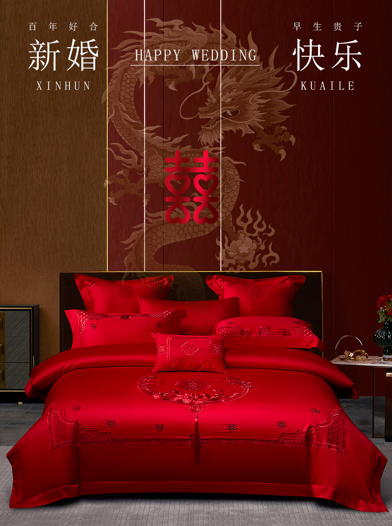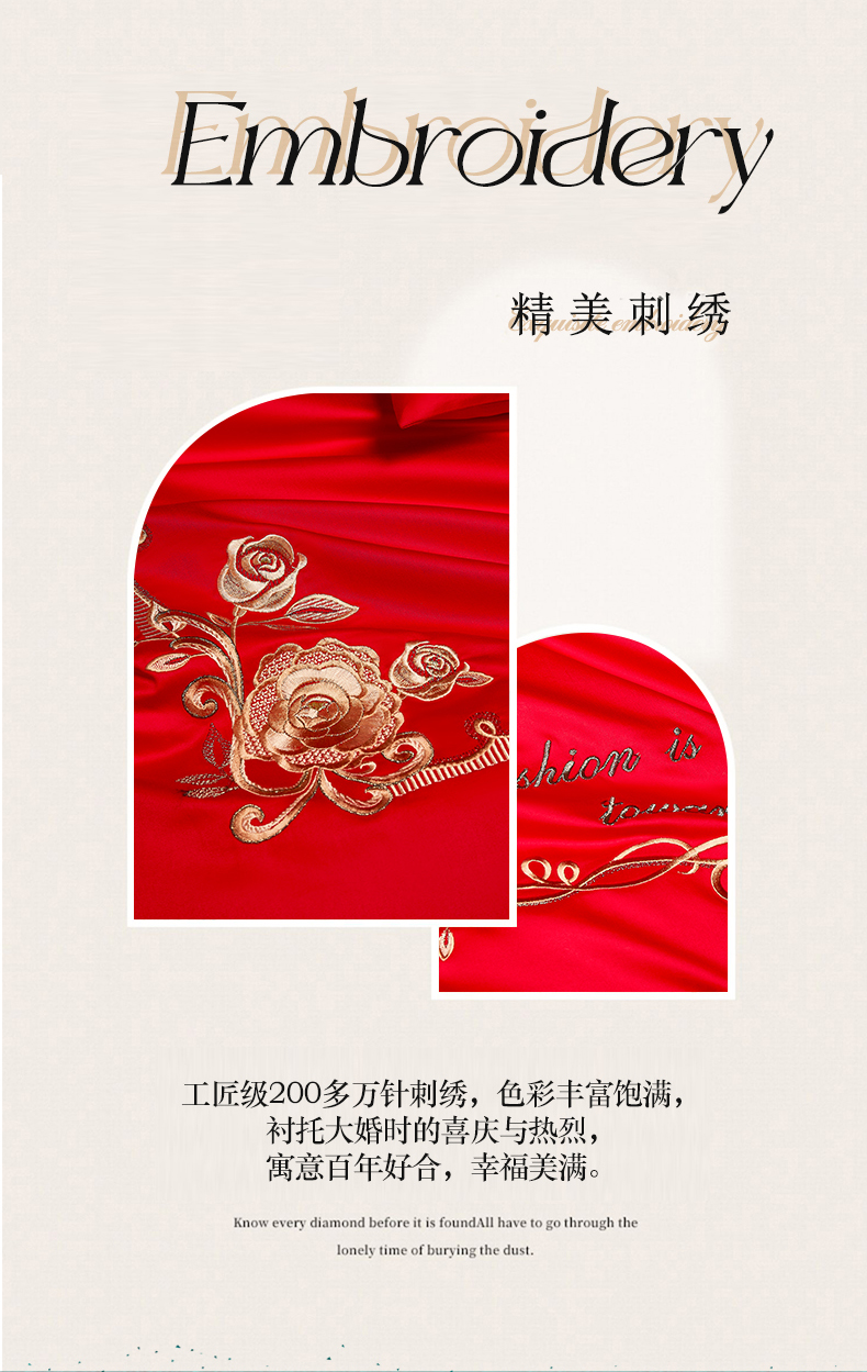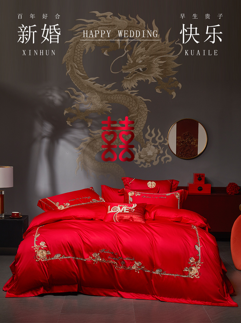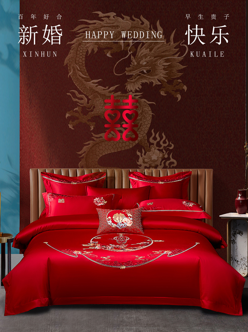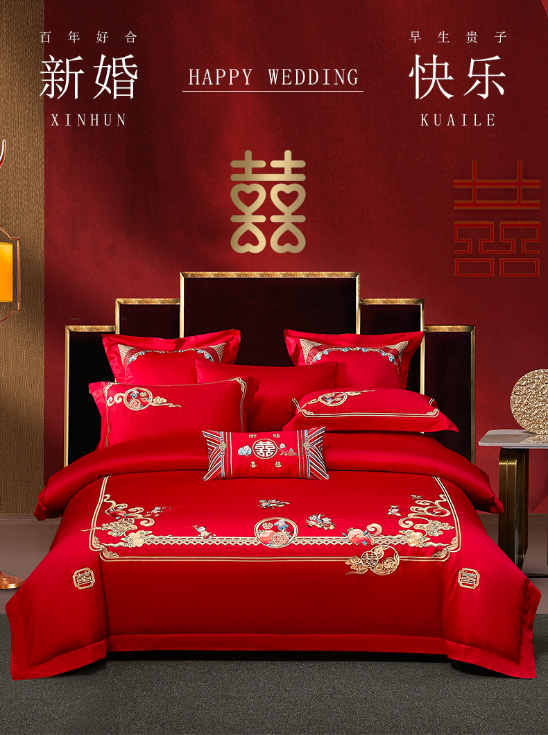 自然醒100支长绒棉轻奢婚庆四件套多件套床裙系列大红纯棉被套床盖床裙结婚简约床品GDS