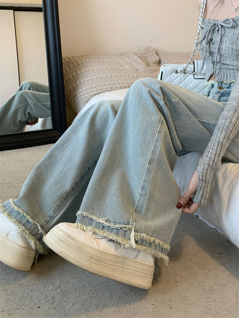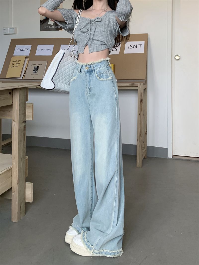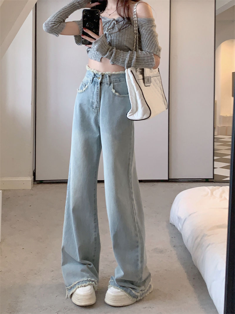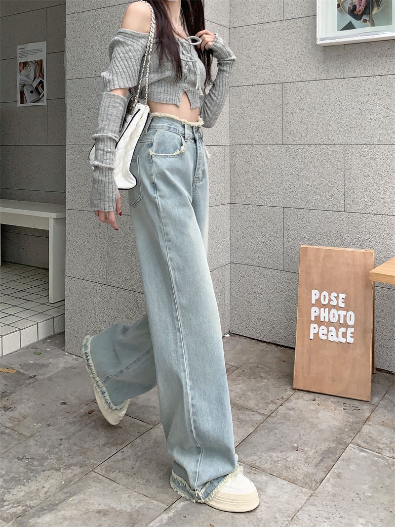 毛边设计感浅蓝色牛仔裤女秋季2024新款复古高腰显瘦阔腿直筒裤子