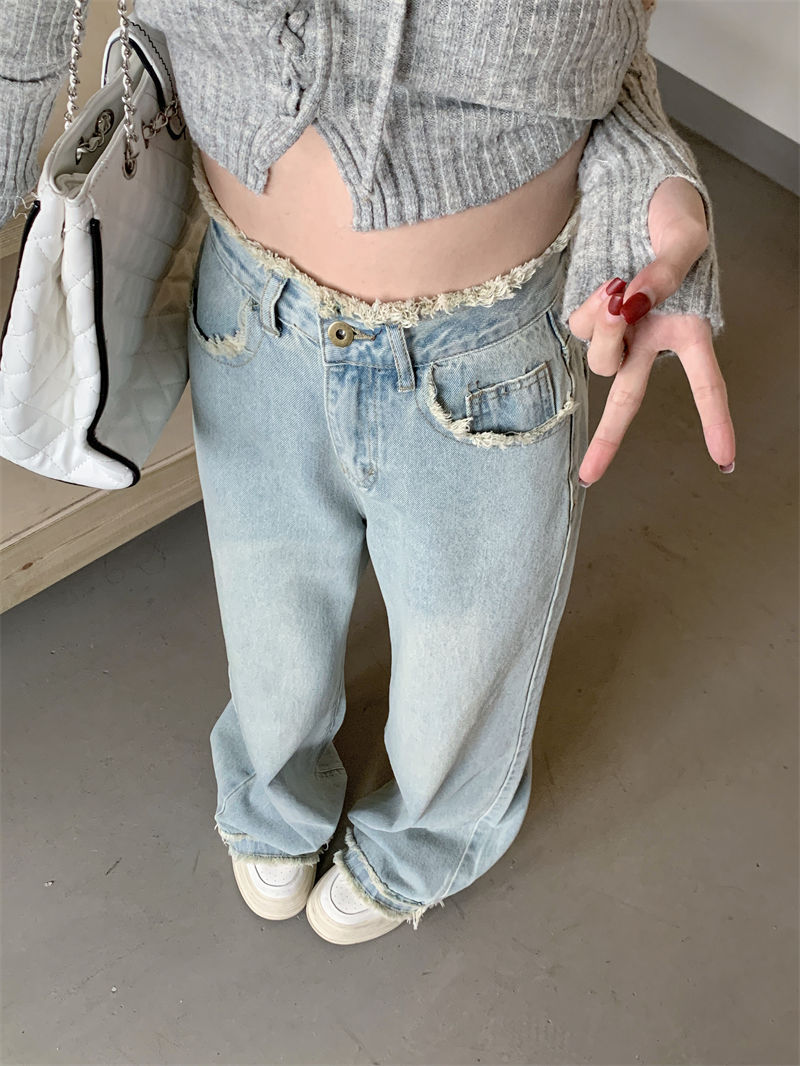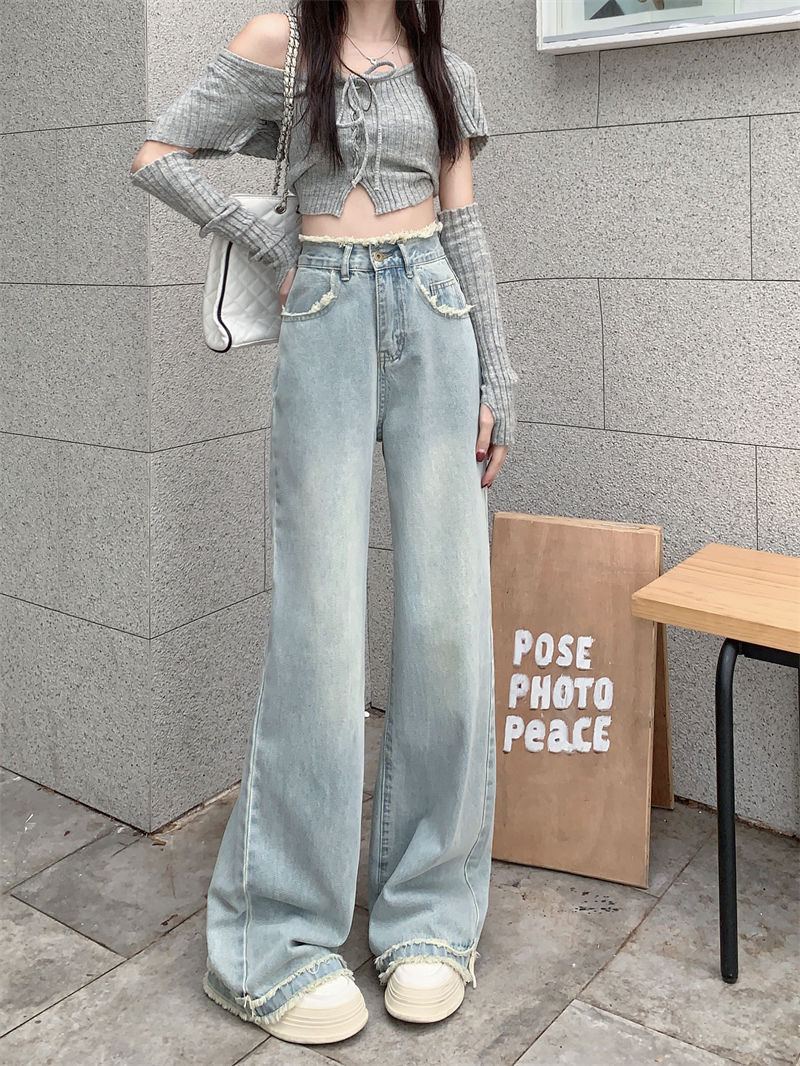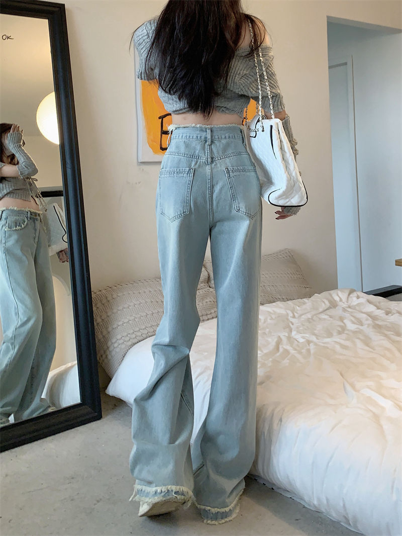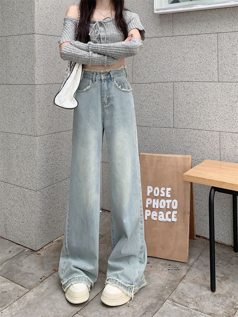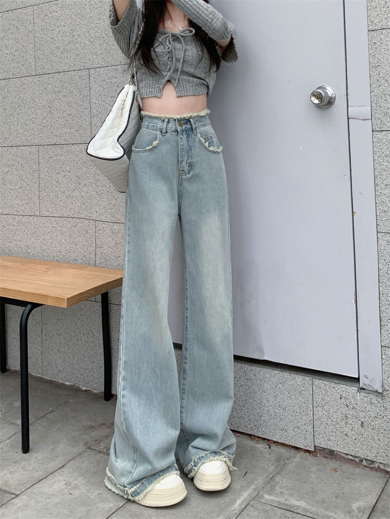 毛边设计感浅蓝色牛仔裤女秋季2024新款复古高腰显瘦阔腿直筒裤子