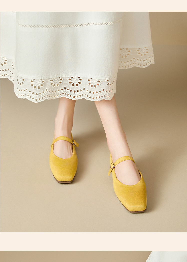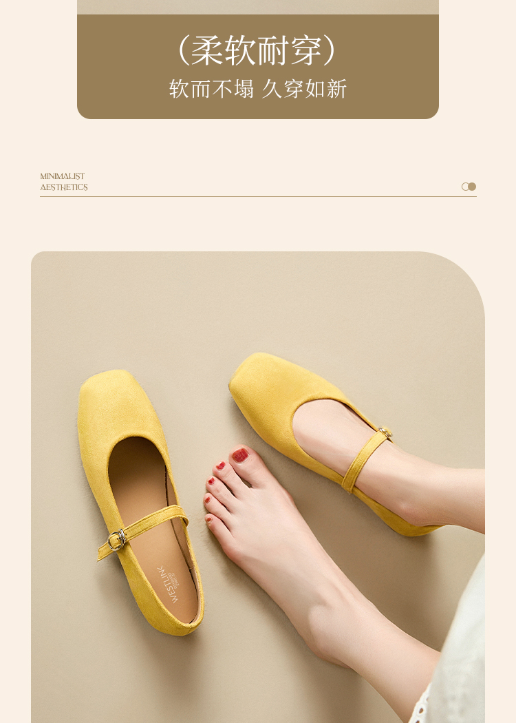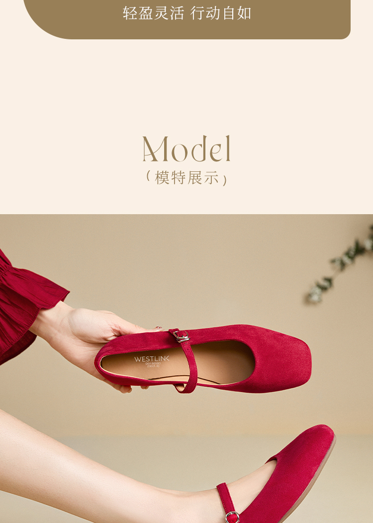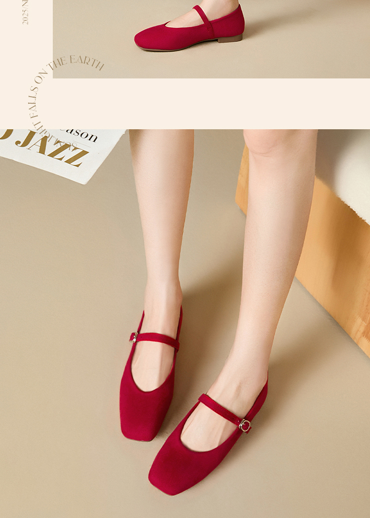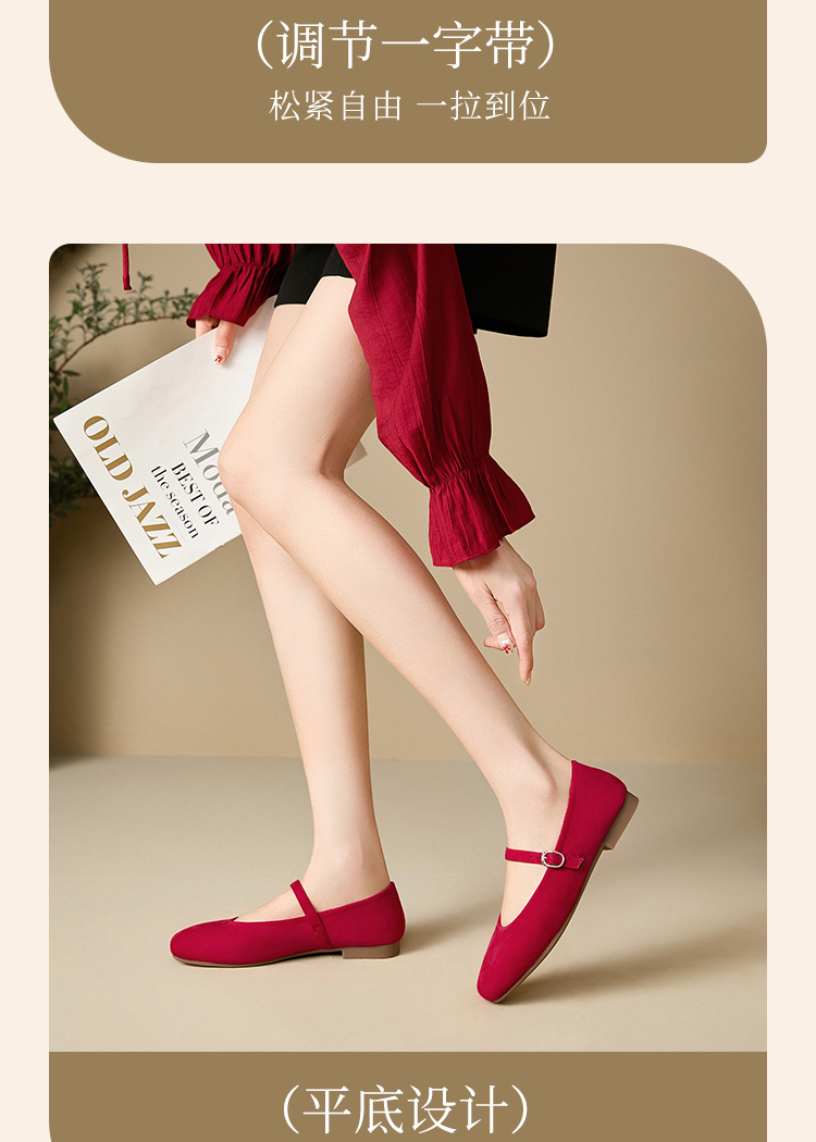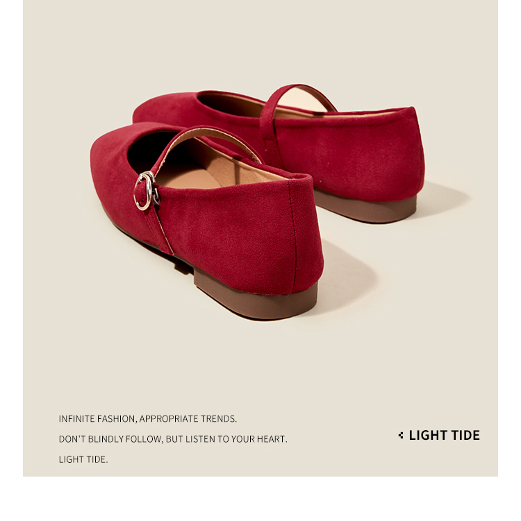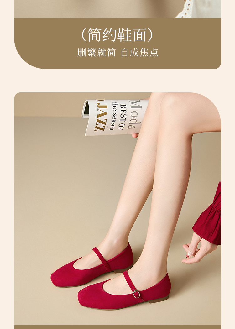 西遇平底玛丽珍女鞋新款春夏法式方头芭蕾鞋浅口软底红色单鞋D0156593
