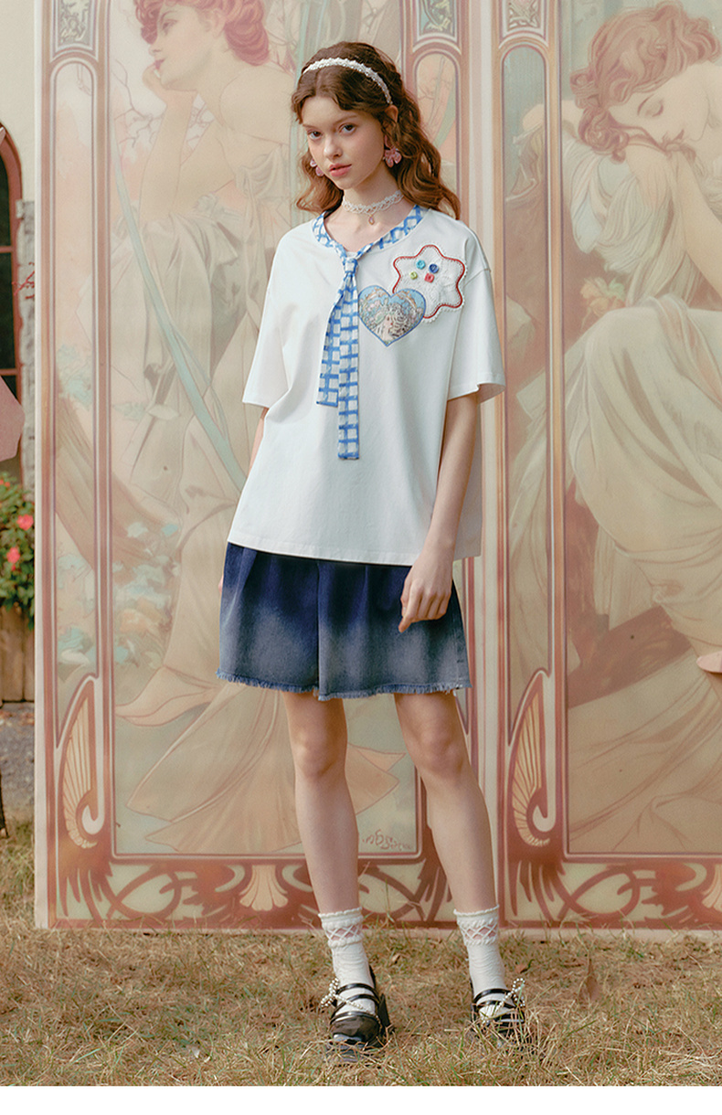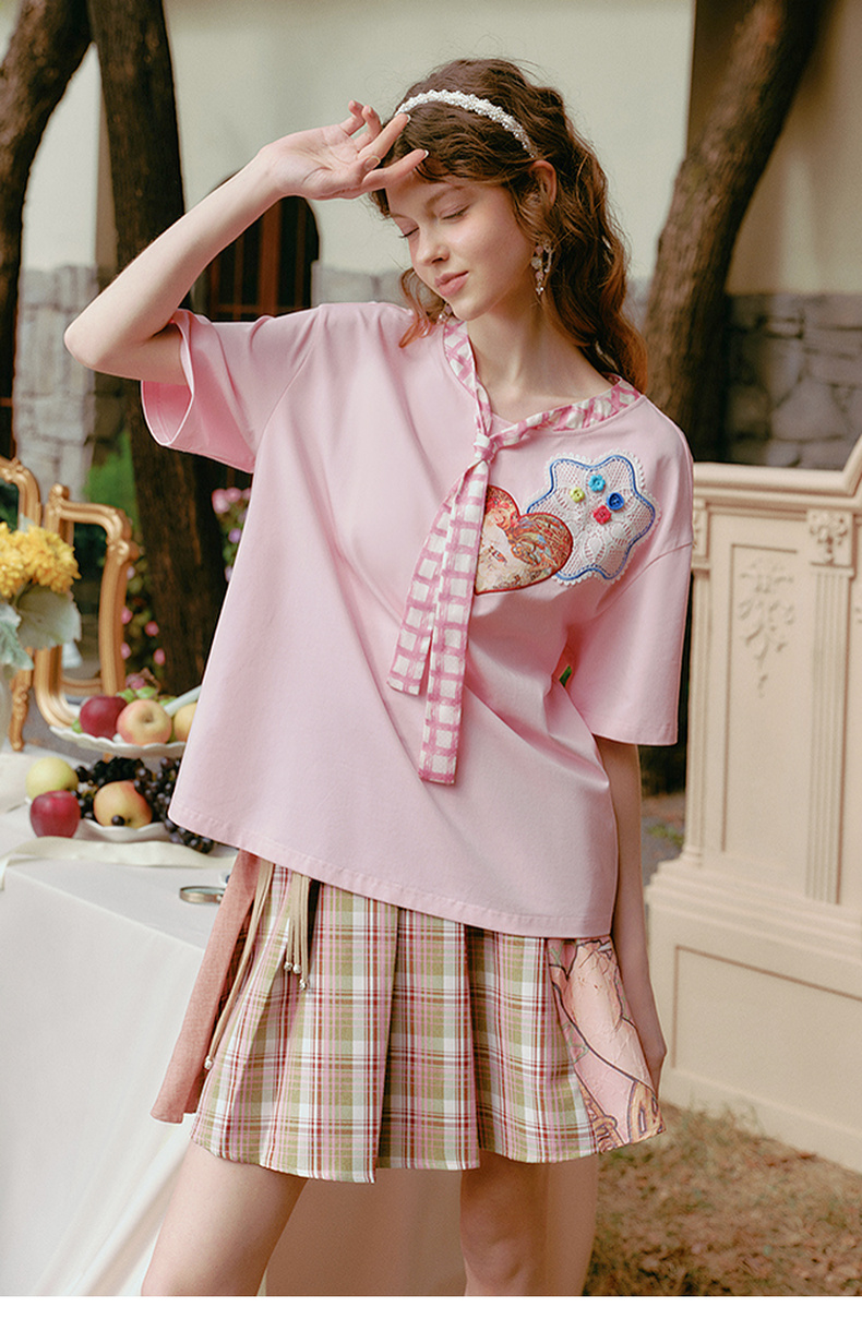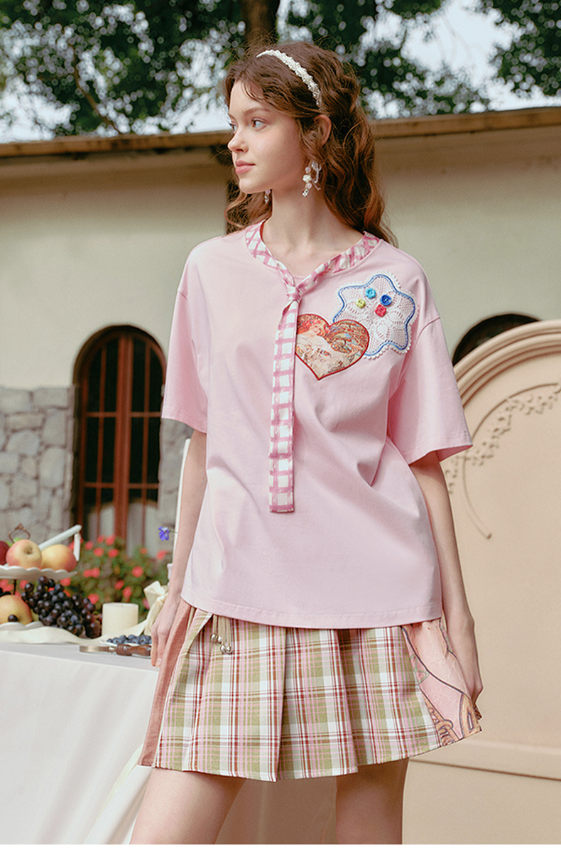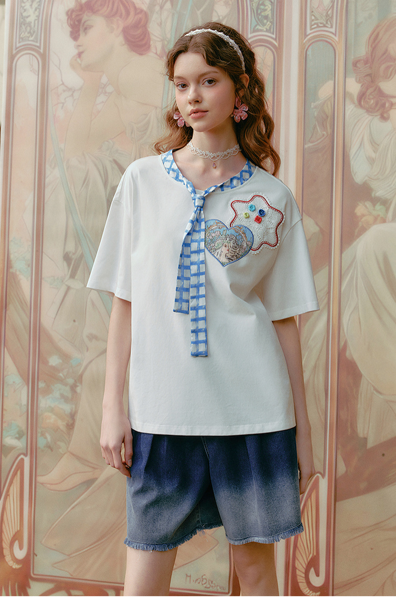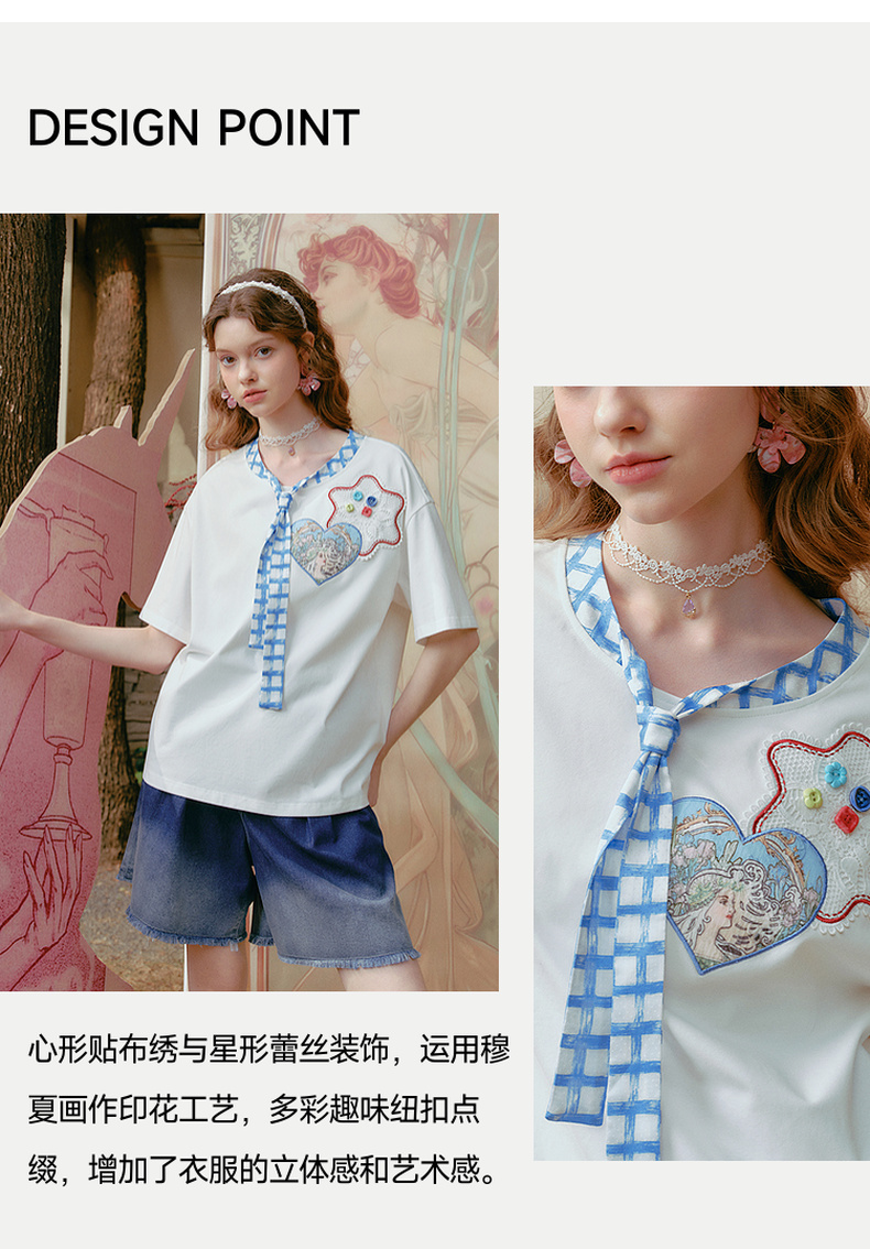 两三事 魔卡仙踪 2025春季新款甜美贴布绣格子领带短袖t恤女宽松