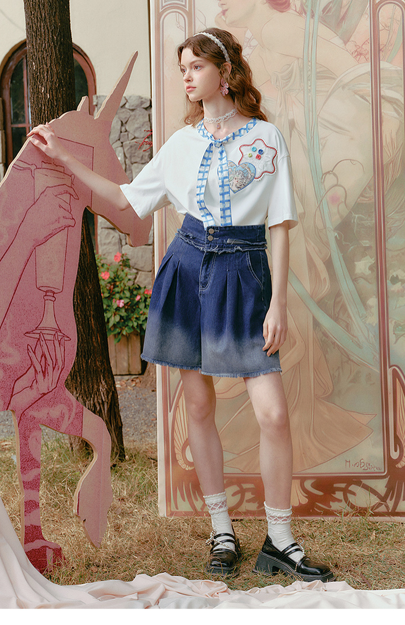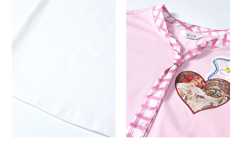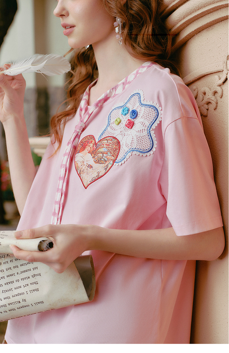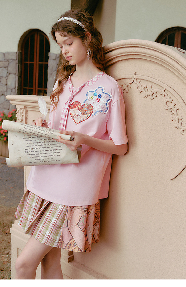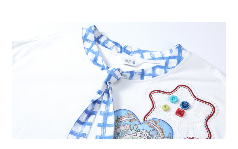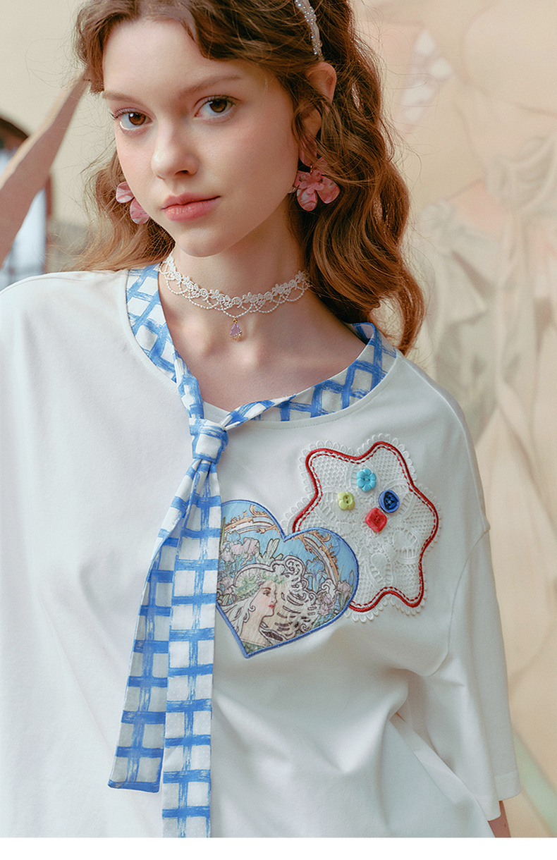 两三事 魔卡仙踪 2025春季新款甜美贴布绣格子领带短袖t恤女宽松