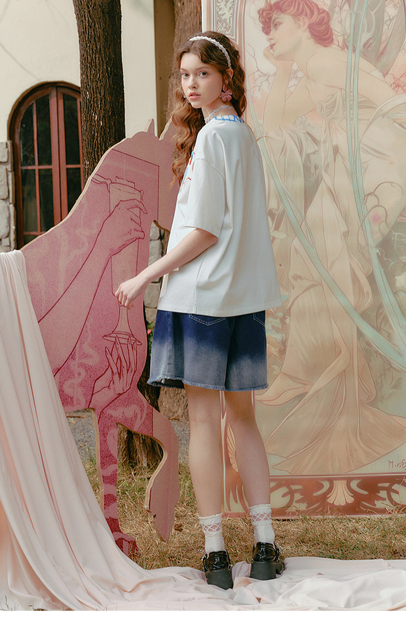 两三事 遁入花境 2025春季新款休闲拼色插肩袖印花刺绣t恤女宽松S25CT444