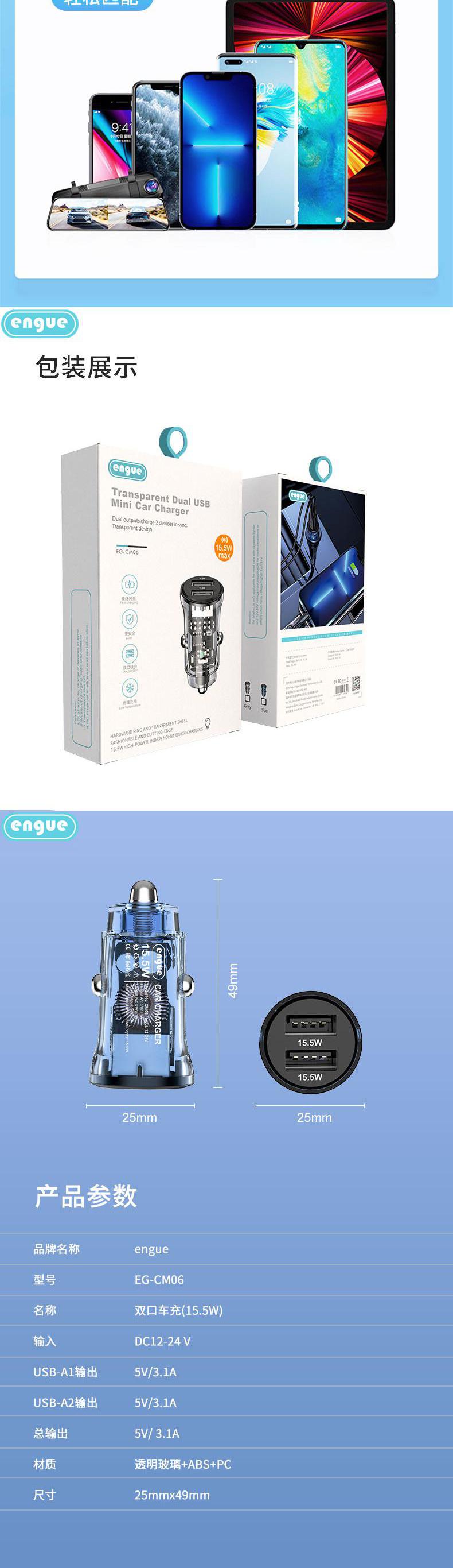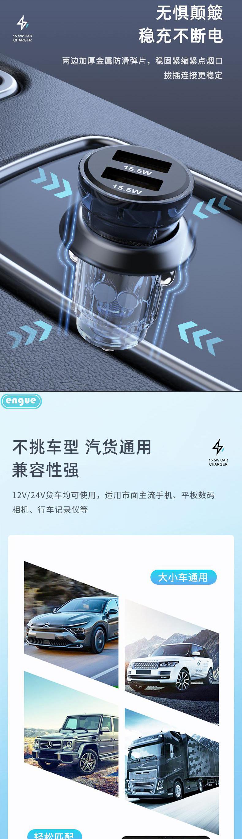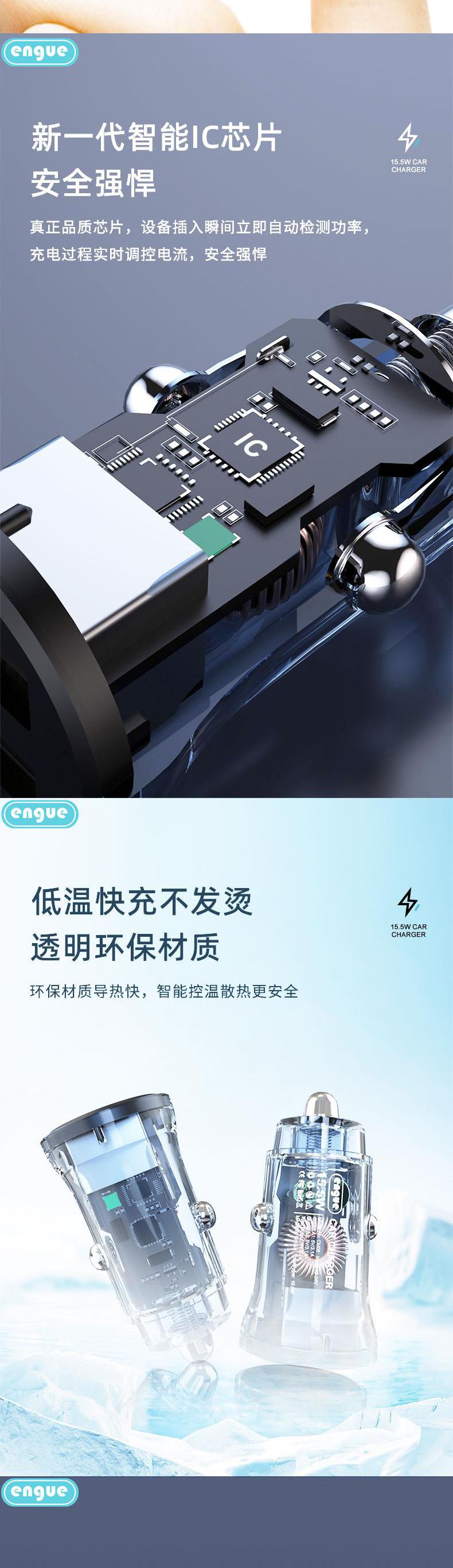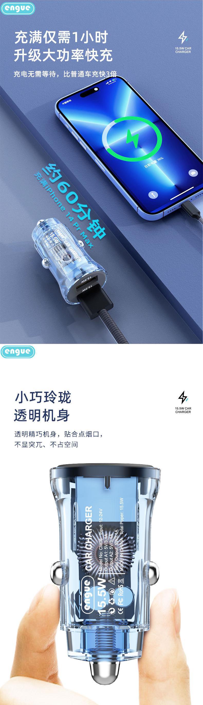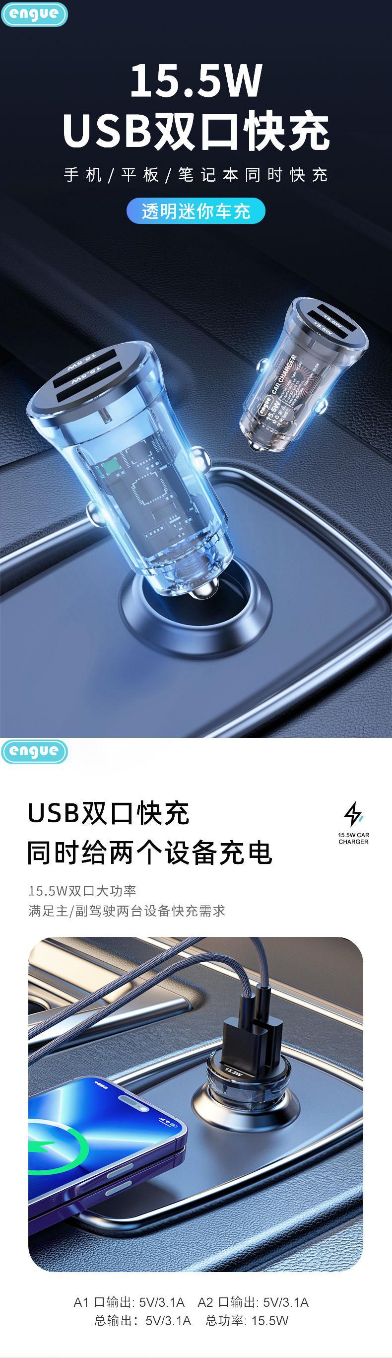 【自营】恩谷 乐驰 EG-CM06 透明外壳15W +2USB输出 车载充电器点烟器快充数显炫酷