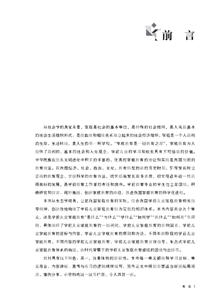 本教材立足我国学前家庭教育发展的实际,全面体现《幼儿园教师专业标准(试行)》《3~6岁儿童学习与发展指南》的精神。以切实夯实学生综合素质,增强幼儿教师家庭教育能力为导向,用崭新的视角全面阐释了学前家庭教育的本质、目标和内容、方法和途径,重点对不同年龄阶段学前儿童家庭教育的实施、不同内容学前儿童的家庭教育、家庭教育游戏,以及新时代背景下的学前儿童家庭教育等,进行了翔实、科学的阐述。全书在整体上体现了结构的新颖性与层次性、内容的实践性与互动性,可作为学前教育相关专业的教学用书。