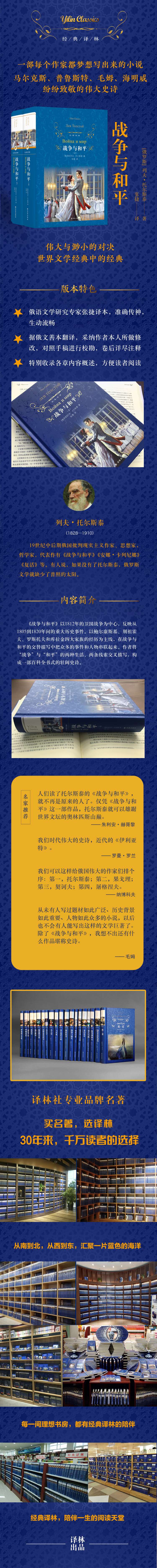 《战争与和平》是世界上伟大的小说。从未有人写过题材如此广泛、历史背景如此重要、人物如此众多的小说,以后也不会有人能写出这样的文学巨着了。除了《战争与和平》,我想不出还有什么作品堪称史诗。