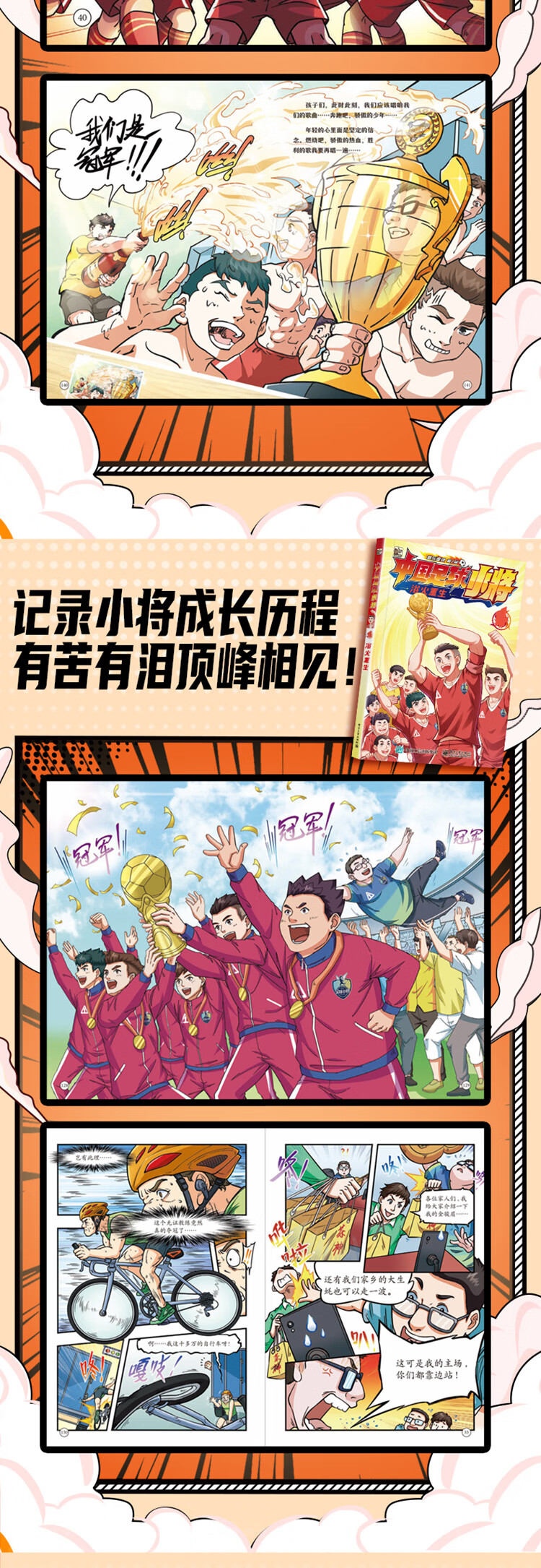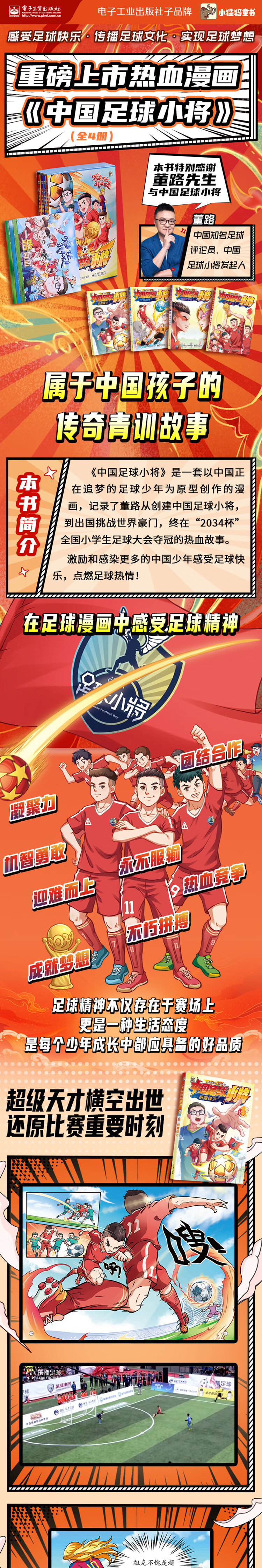 《中国足球小将》是以董路老师和他的青训队伍"中国足球小将”的球员为原型,以漫画书的形式向广大读者和球迷生动展现中国版"足球小将”的独特风采。这套漫画书将聚焦小将们的建队、征战欧罗巴和2034杯足球赛的故事,将他们的青春热血少故事讲给同样心中有梦想的孩子们听,让孩子感受他们朝气蓬勃的生命力和永不言败的体育精神。希望这套漫画书展现出的热血足球梦想,能让更多怀揣梦想的孩子们产生共鸣,点燃他们心中的热血,无惧挑战,勇往直前!