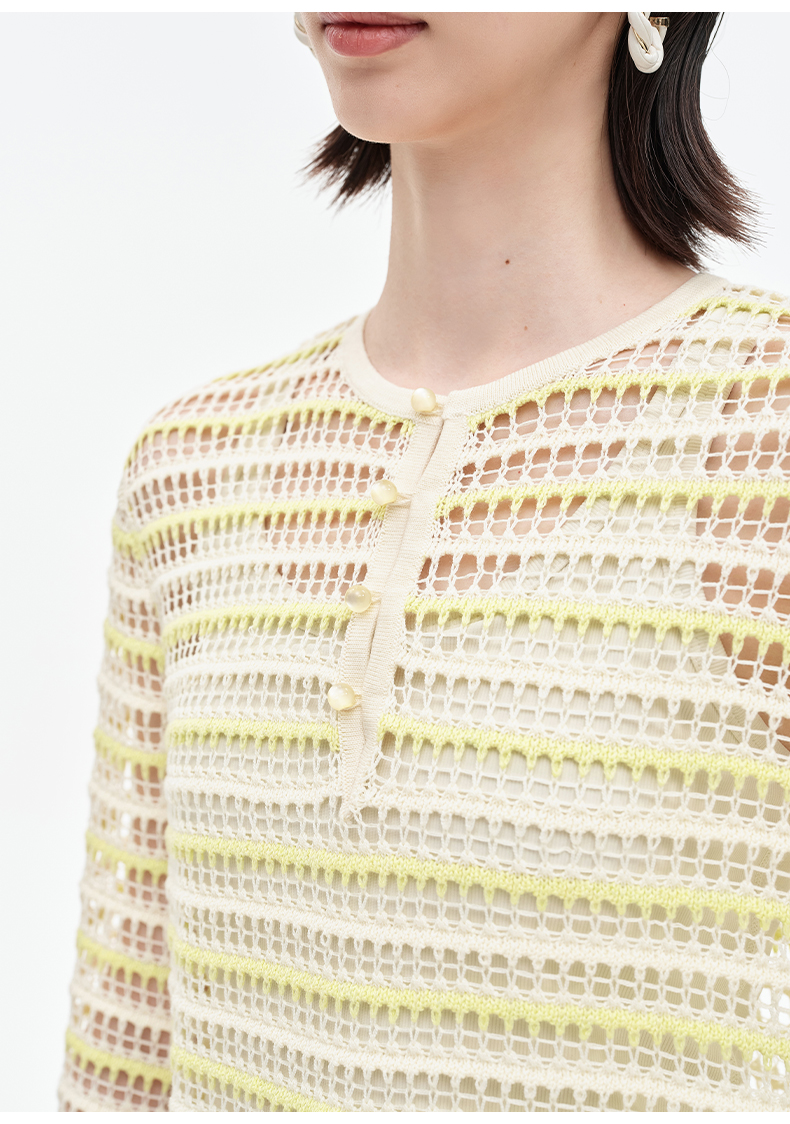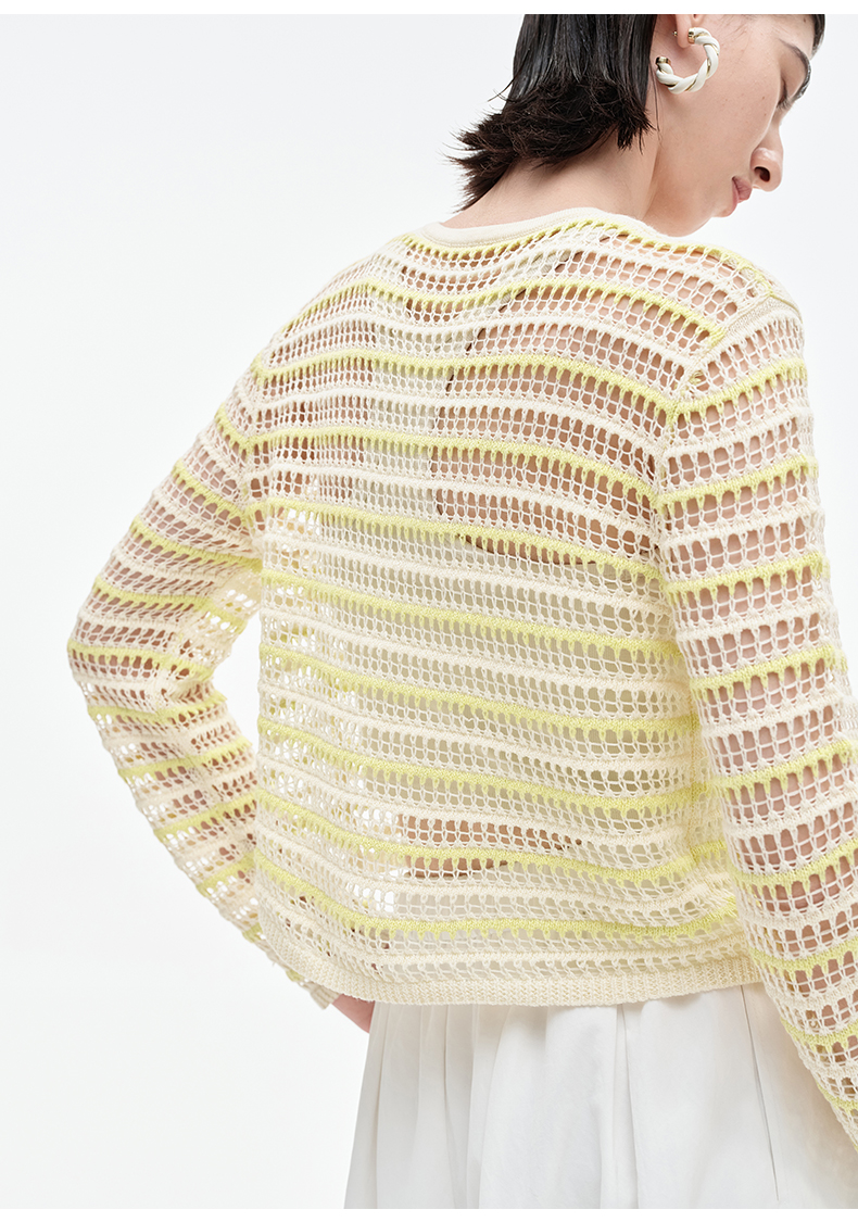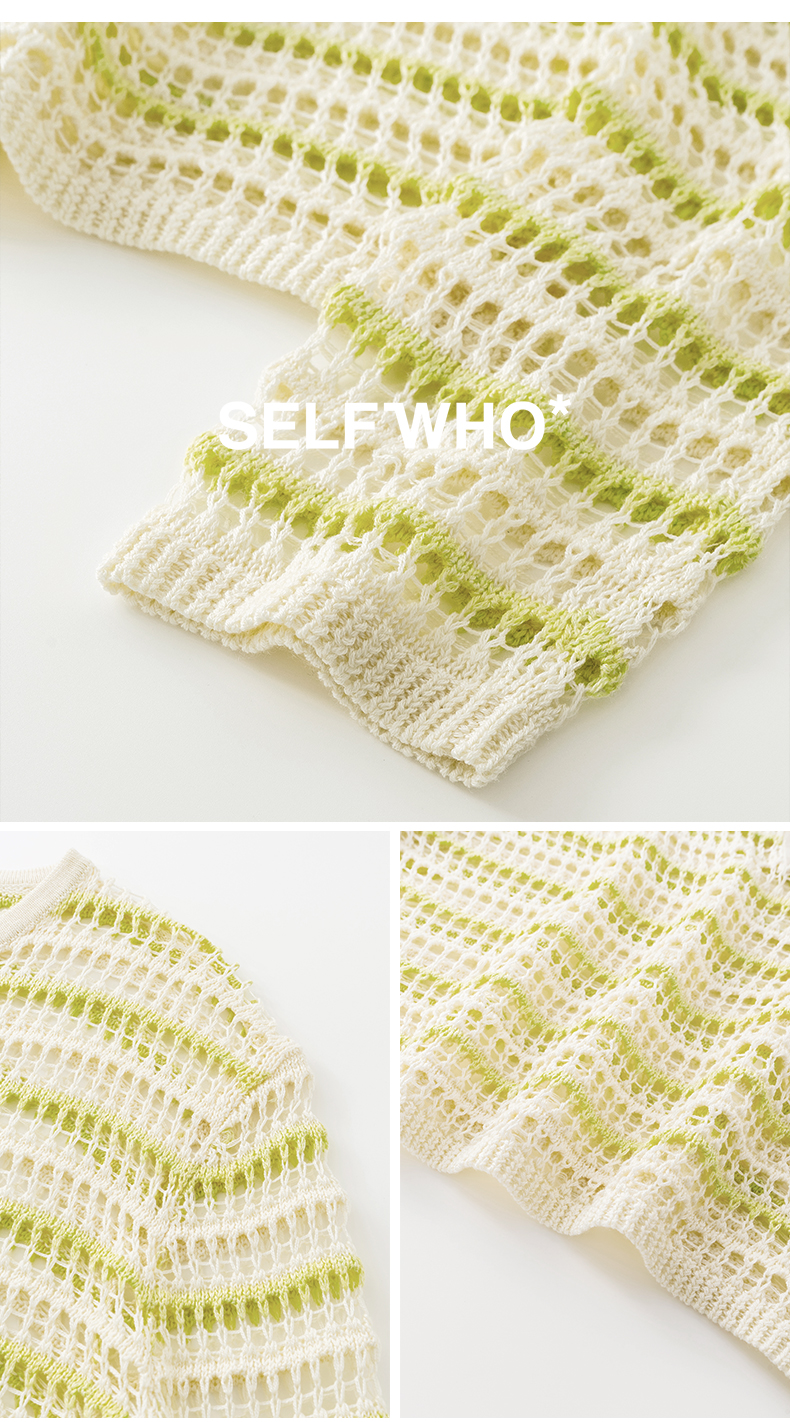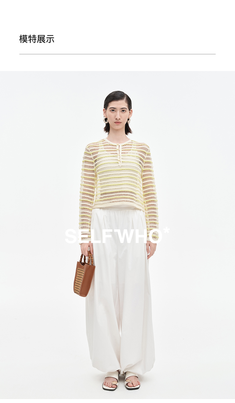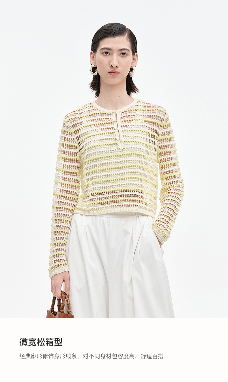 SELFWHO绵羊毛混纺淡黄色镂空针织衫女2025冬季新款宽松透气上衣
