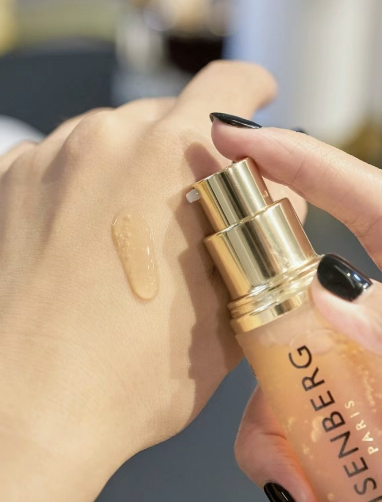 每次挤取一泵紧致精华在虎口处
