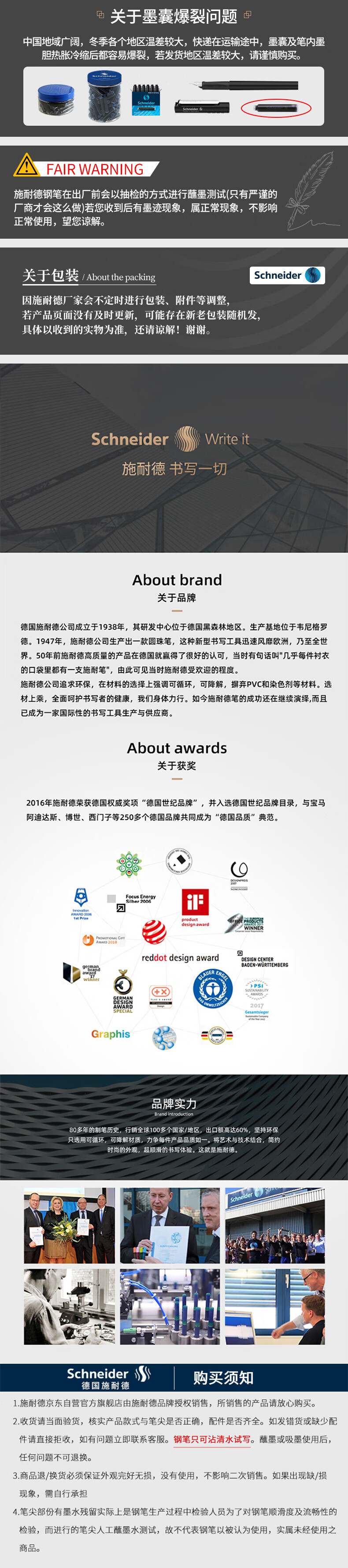 施耐德(Schneider)钢笔墨囊墨水胆非碳素不堵笔德国进口欧标钢笔适用100支装