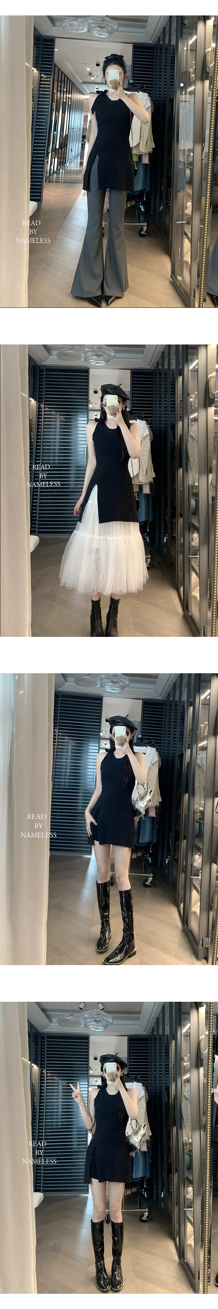 Read Nameless /巧克力纱针织挂脖+米色麂皮拼接纱裙 2025/10/13