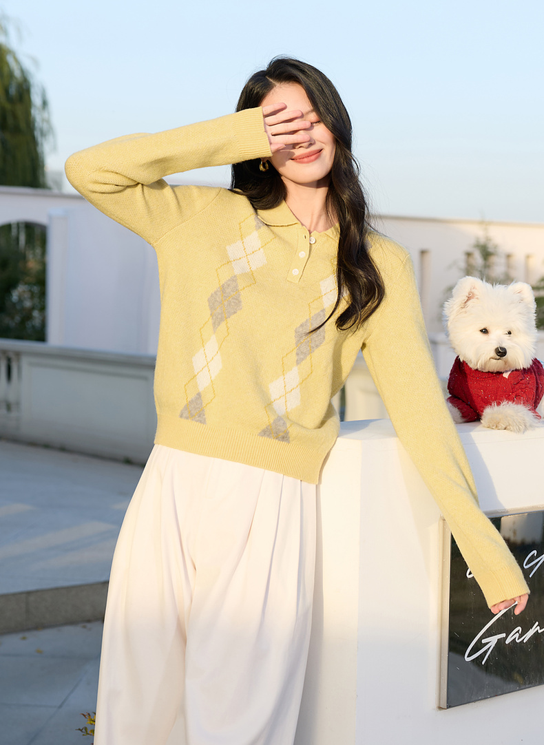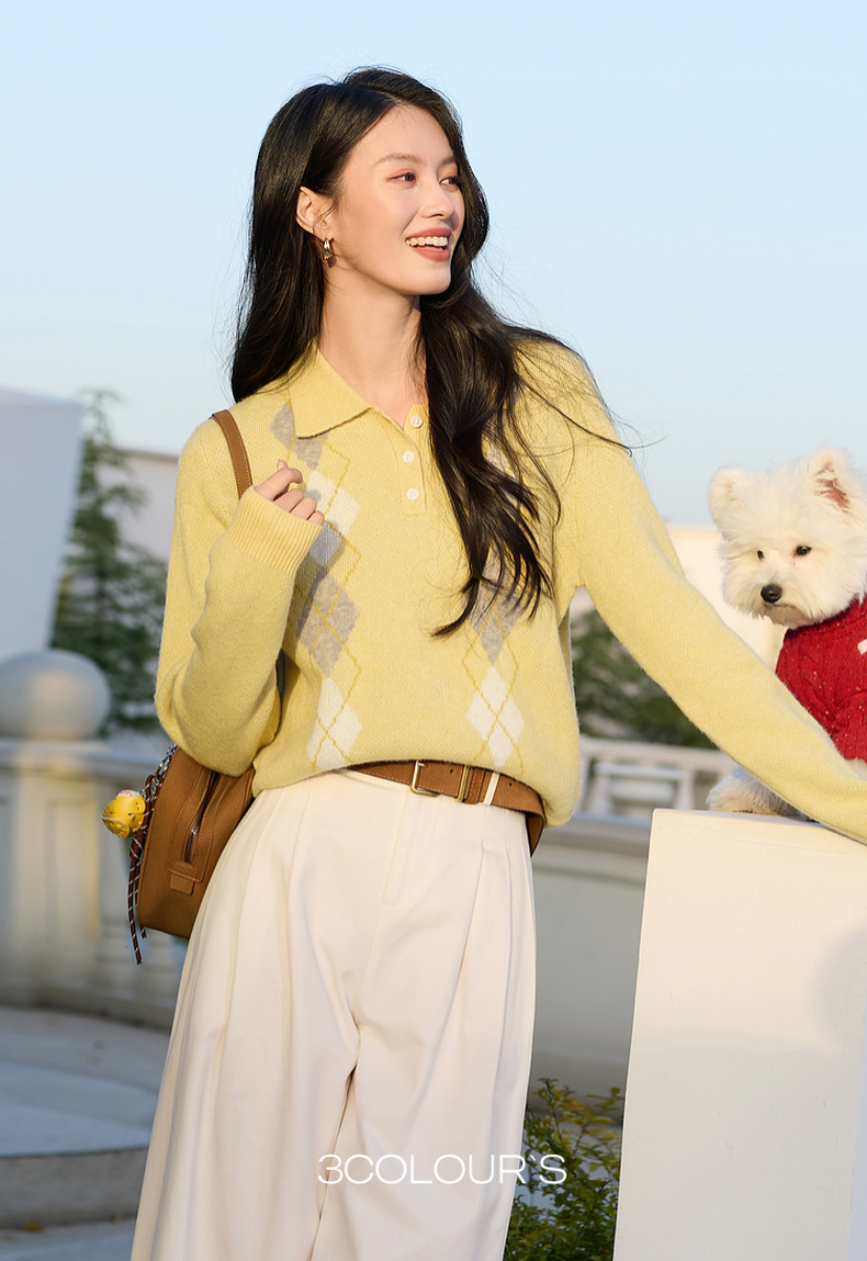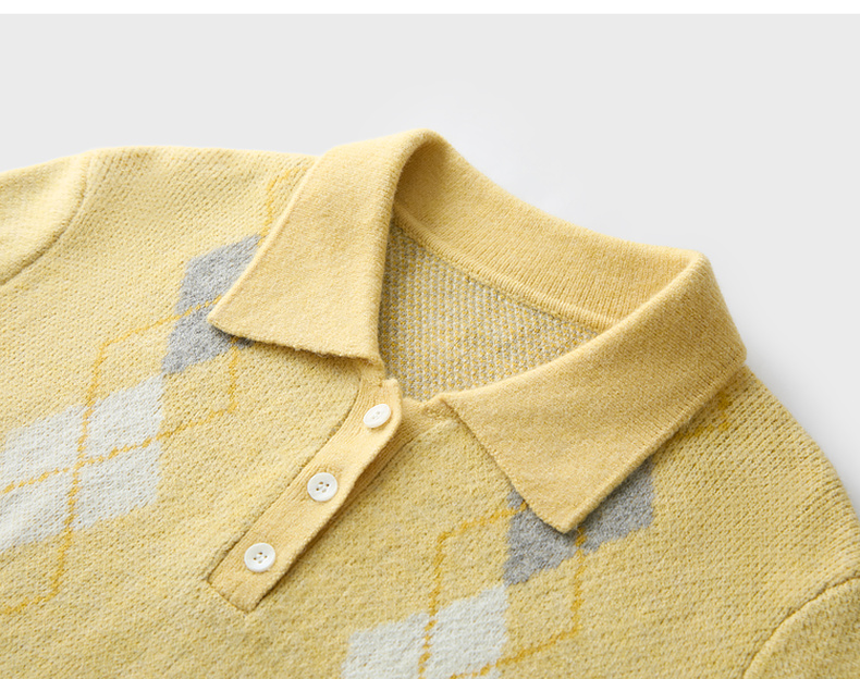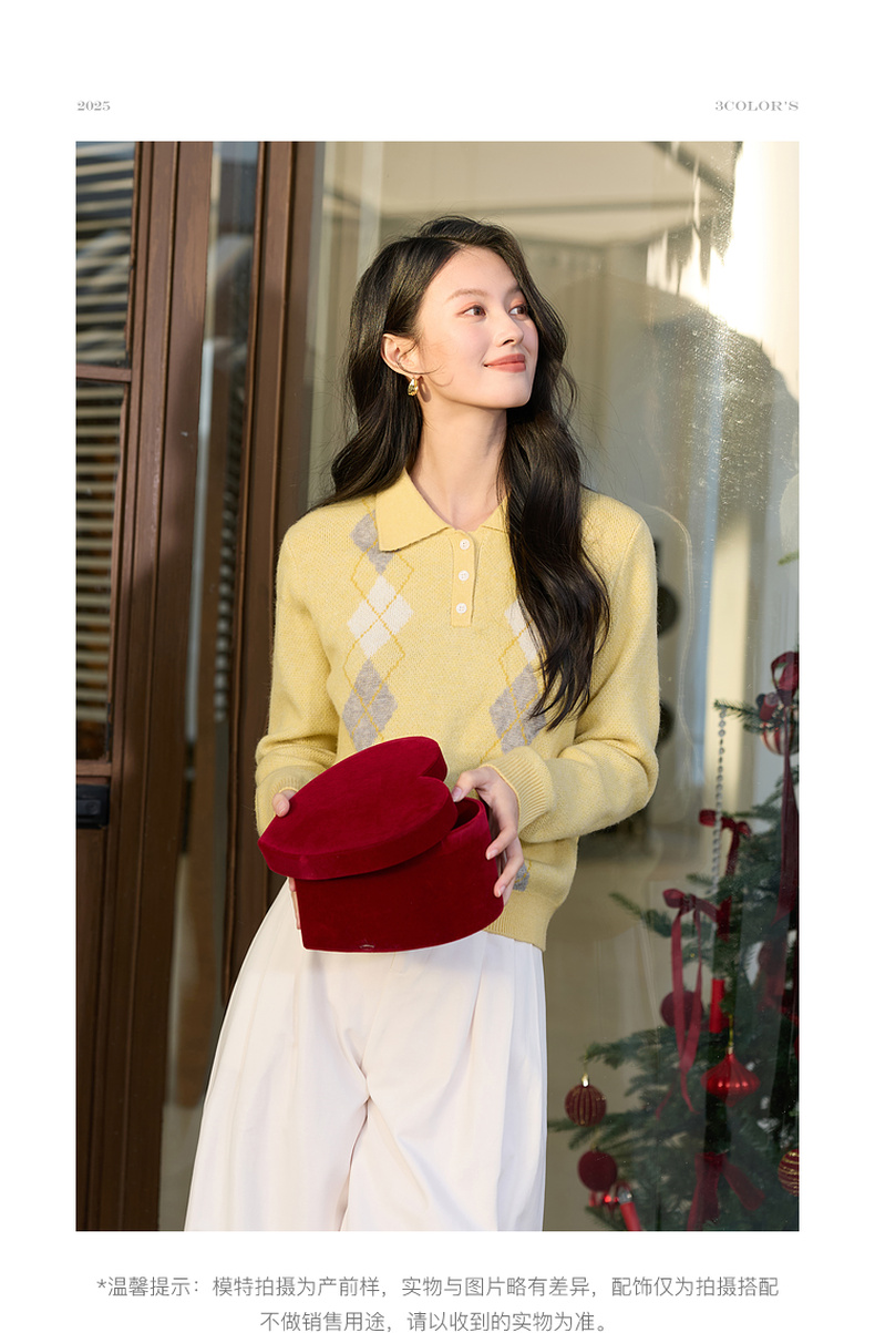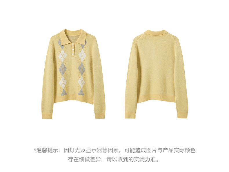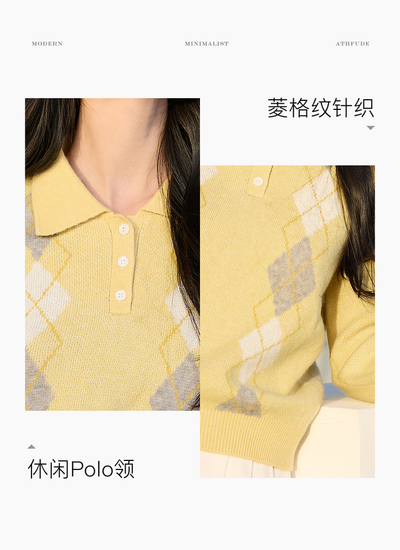 三彩2025冬季新款复古菱格纹Polo衫针织衫长袖套头毛衫上衣S