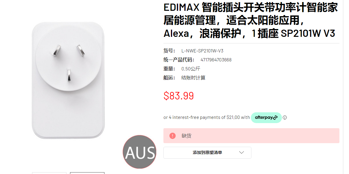 【APP不可用】Edimax 智能插头开关 带功率表 智能家庭能源管理SP2101W V3