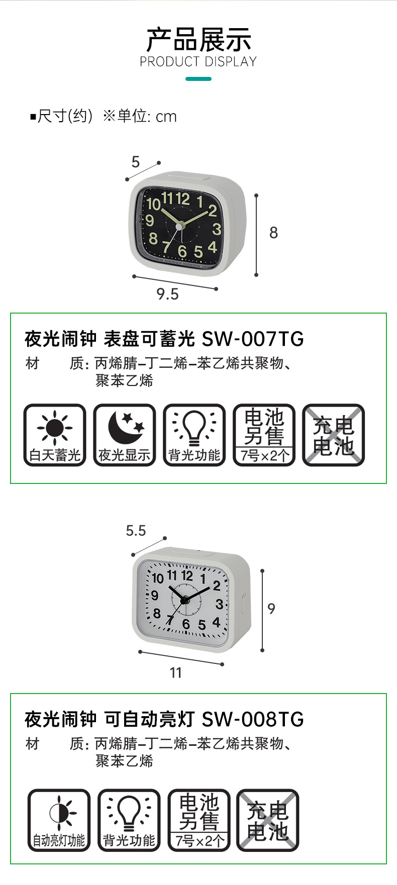 夜光闹钟 表盘可蓄光 SW-007TG