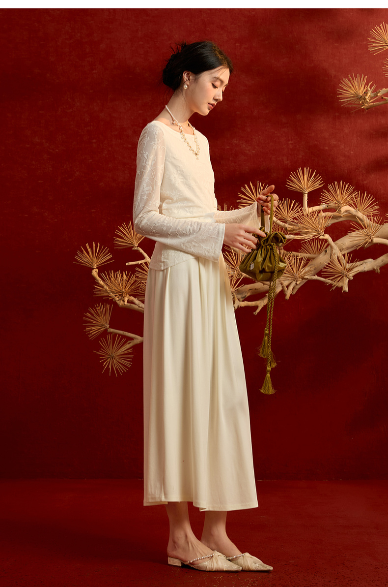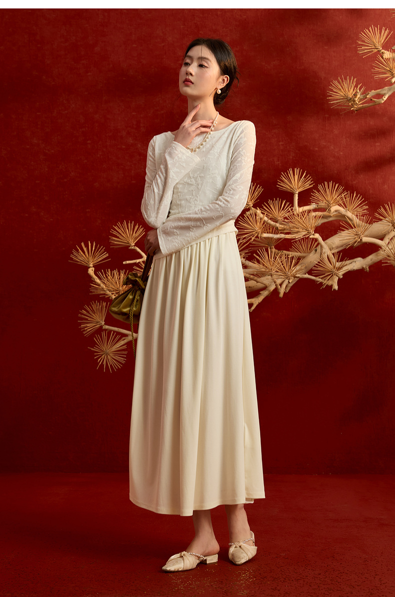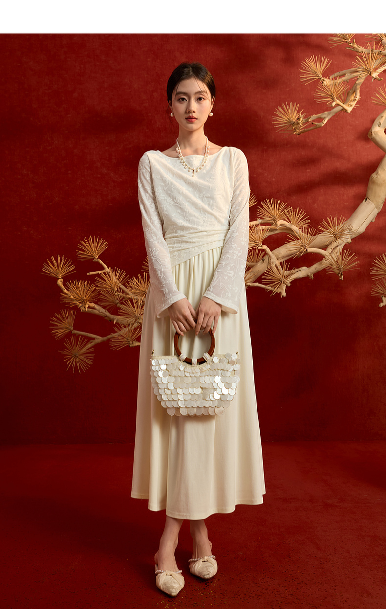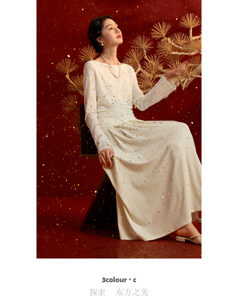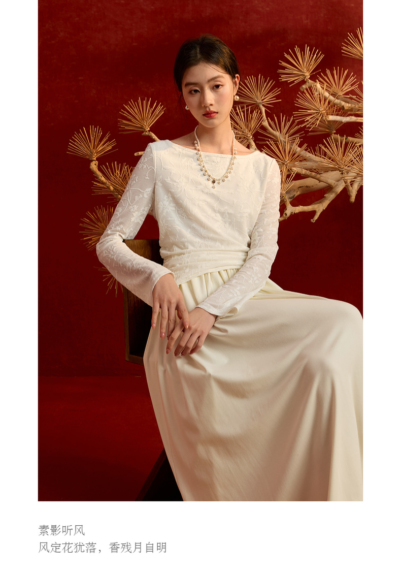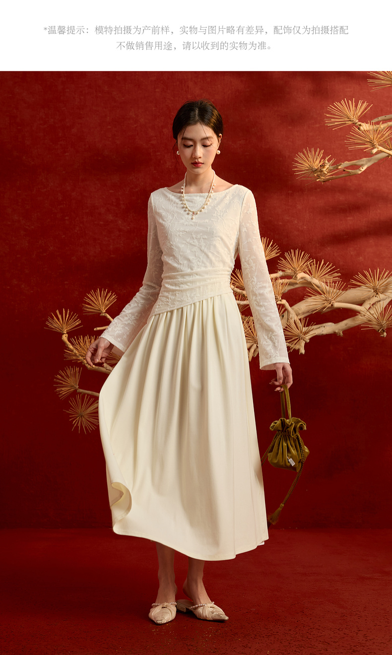 三彩【素影听风】2026春季新款一字领假两件蕾丝连衣裙A字裙C