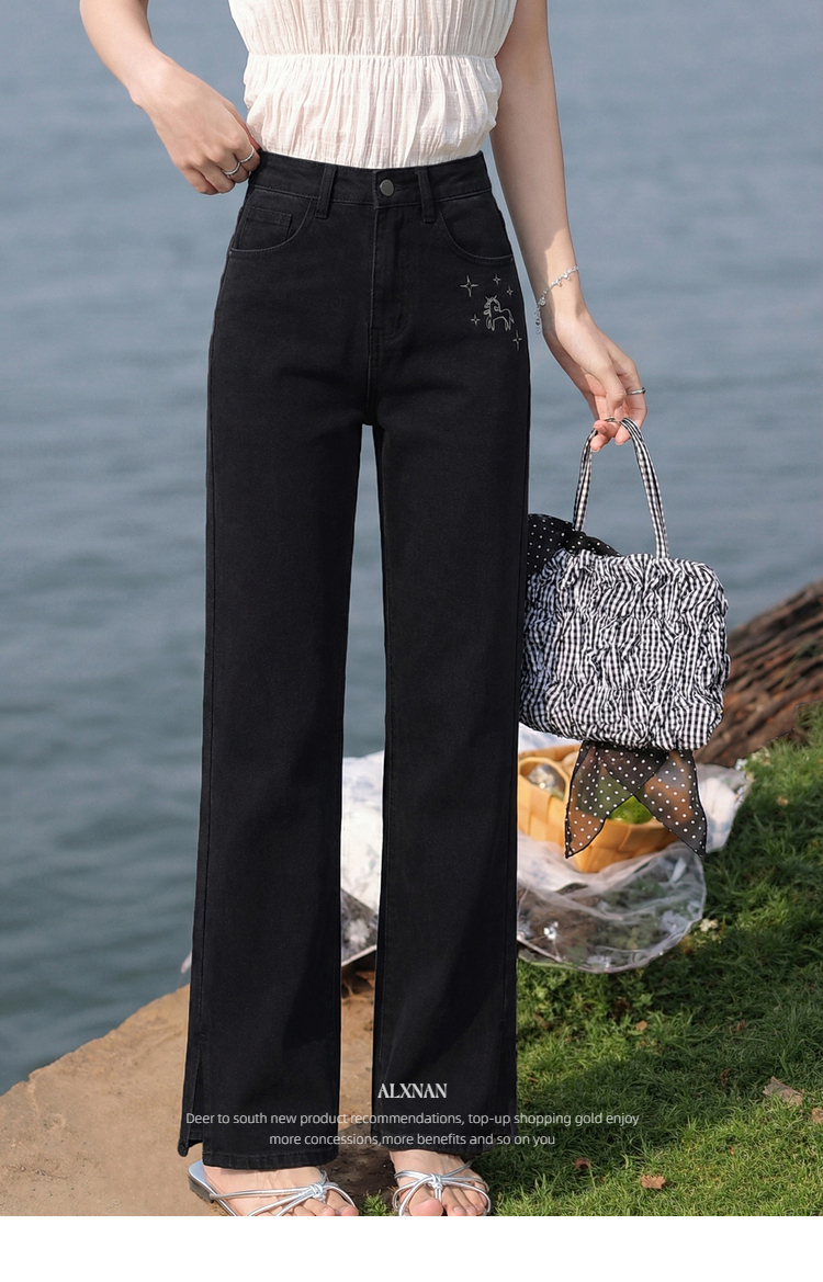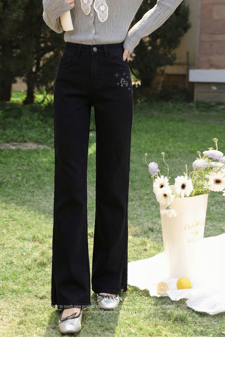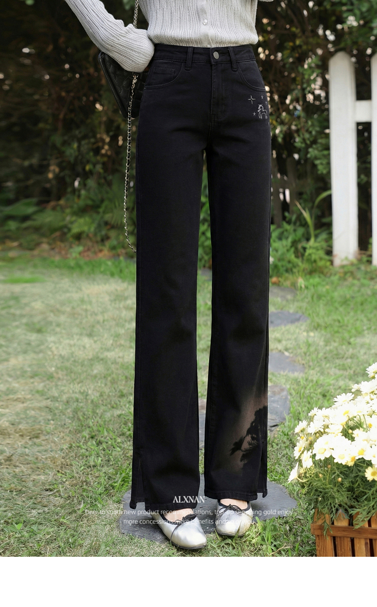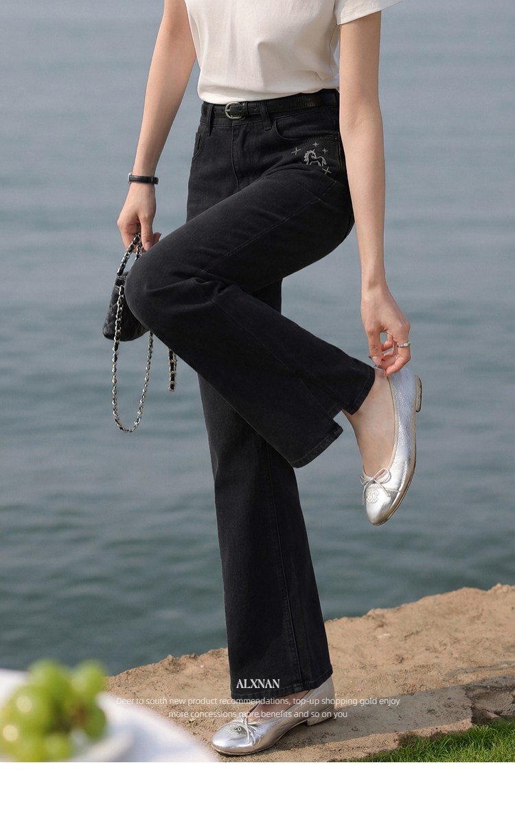 鹿向南「星夜微光」黑色修身牛仔裤女春季新款高腰直筒显瘦长裤子