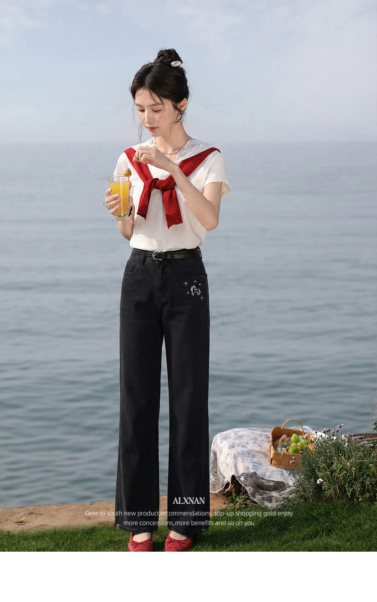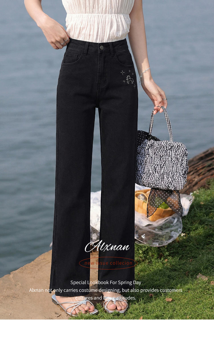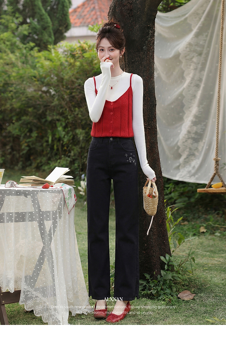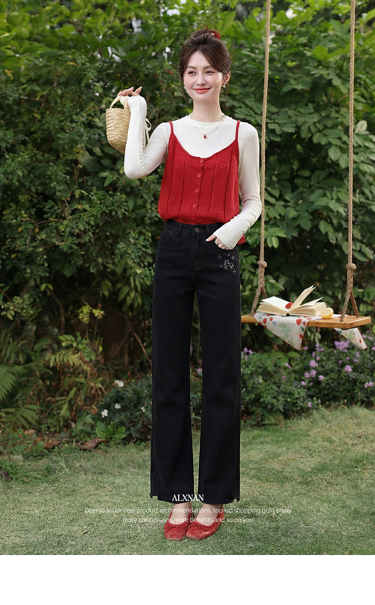 鹿向南「星夜微光」黑色修身牛仔裤女春季新款高腰直筒显瘦长裤子