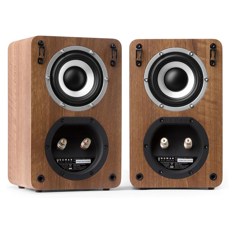 带丝质圆顶和集成 Numan 声音导管的高音扬声器、时尚复古设计、带镀金触点的 NUMAN 扬声器端子、10 厘米(4 英寸)低音中音驱动器和 10 厘米(4 英寸)无源振膜、复古外观的可拆卸织物盖、背面,用于墙壁安装的集成安装系统,低共振 MDF 外壳