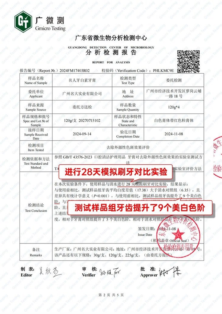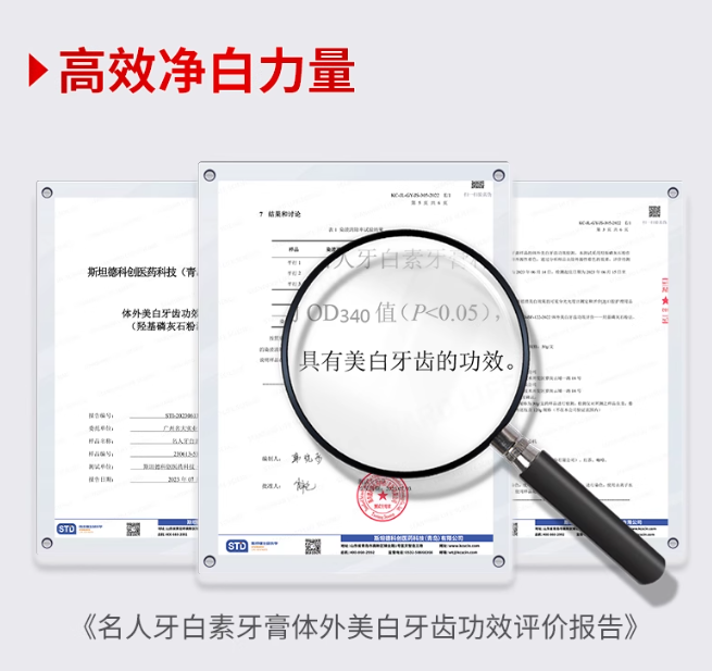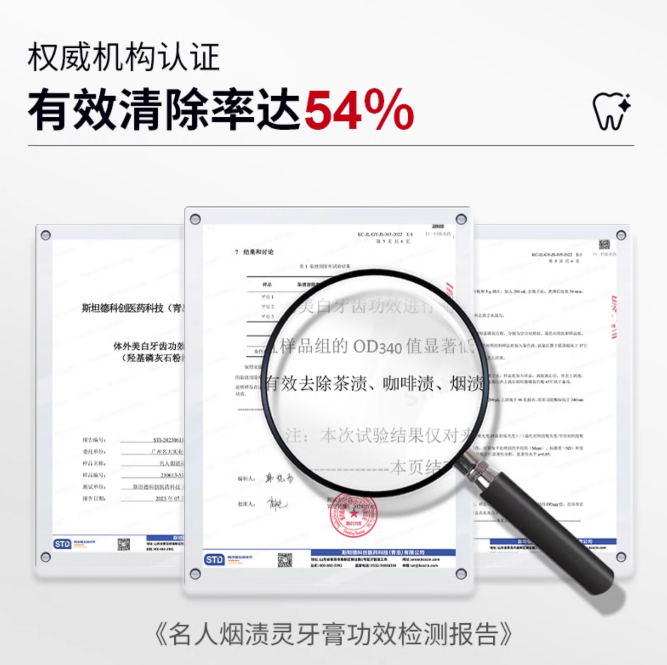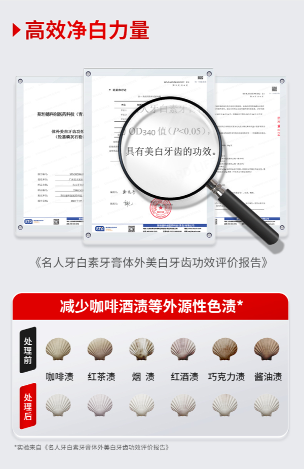 🔺广东省口腔医院验证报告、权威中心测试报告,28天亮白9个色阶! 有效去除外源性色渍,如烟渍、茶渍、咖啡渍等(特别针对爱喝碳酸饮料咖啡的一族);24小时清新口气~