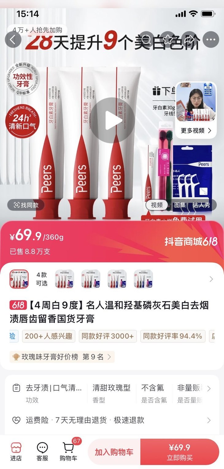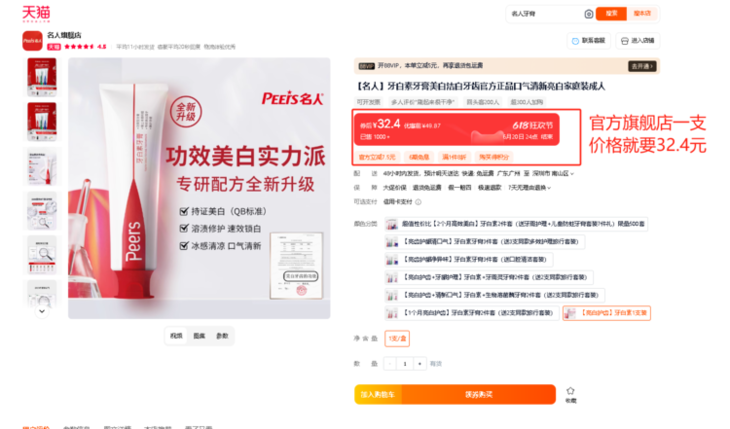 ❌某猫官方价格:💰32.4元到手一支,没有赠品 ❌某音上面价格:💰69.9元到手三支牙膏,没有赠品
