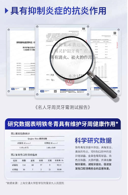 🔺专研功效清火护龈----牙周灵牙膏 主打功效:加入铁冬青草本植萃,改善牙周健康,抗炎护龈固齿三位一体!