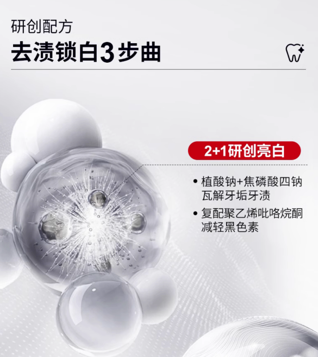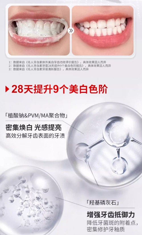 🔥它里面的灵魂成分植酸纳!堪称牙膏界的烟酰胺,搭配“牙渍橡皮擦”焦磷酸四钠,溶渍效果不要太好! 🔥添加复配PVM/MA共聚物,与牙渍形成化学络合作用,提高美白成分附着时间,增强刷牙时的均匀清洁,迅速锁白! 🔥添加羟基磷灰石成分,补充矿物质、修复牙釉质、增强牙齿硬度,缩小缺陷,减少敏感,温和保护牙釉质不受损伤,敏感口腔狠狠爱了